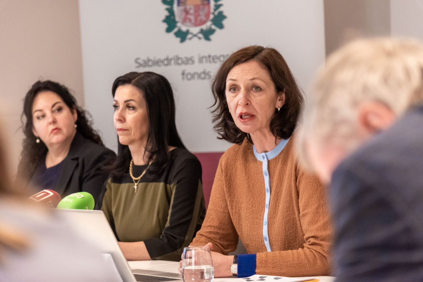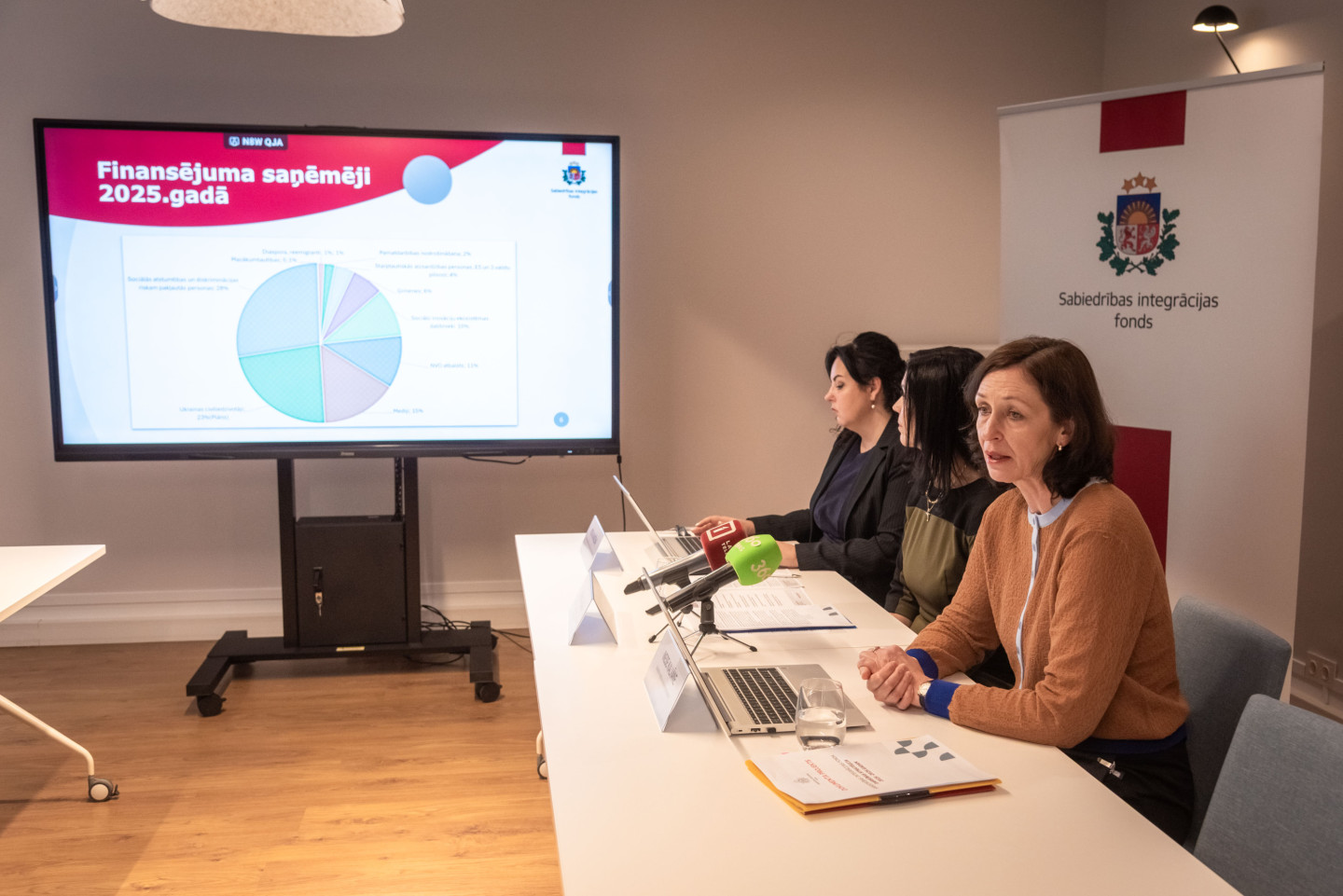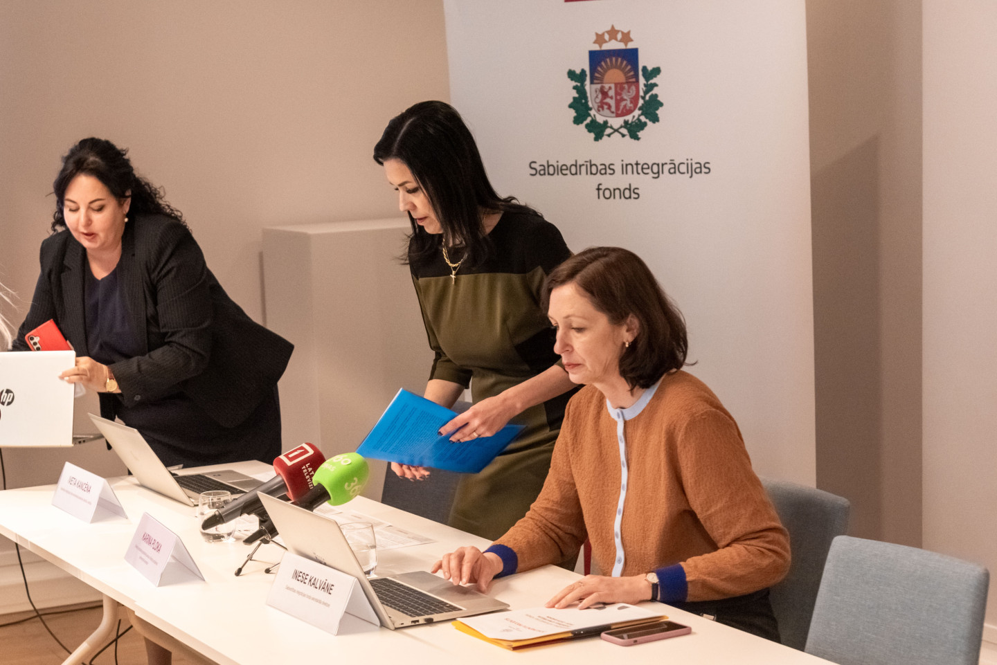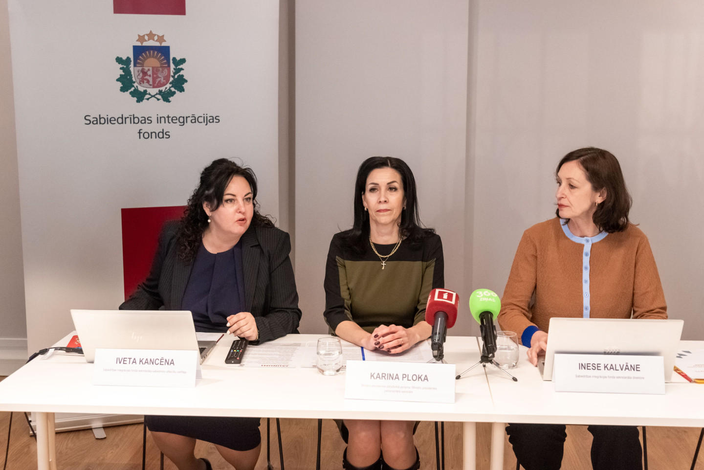 Sabiedrības integrācijas fonda (SIF) sabiedrisko attiecību vadītāja Iveta Kancēna (no kreisās), Ministru prezidentes parlamentārā sekretāre, SIF Padomes priekšsēdētāja Karina Ploka un SIF Sekretariāta direktore Inese Kalvāne piedalās preses konferencē, kurā informē par SIF darbības prioritātēm turpmākajiem pieciem gadiem.
