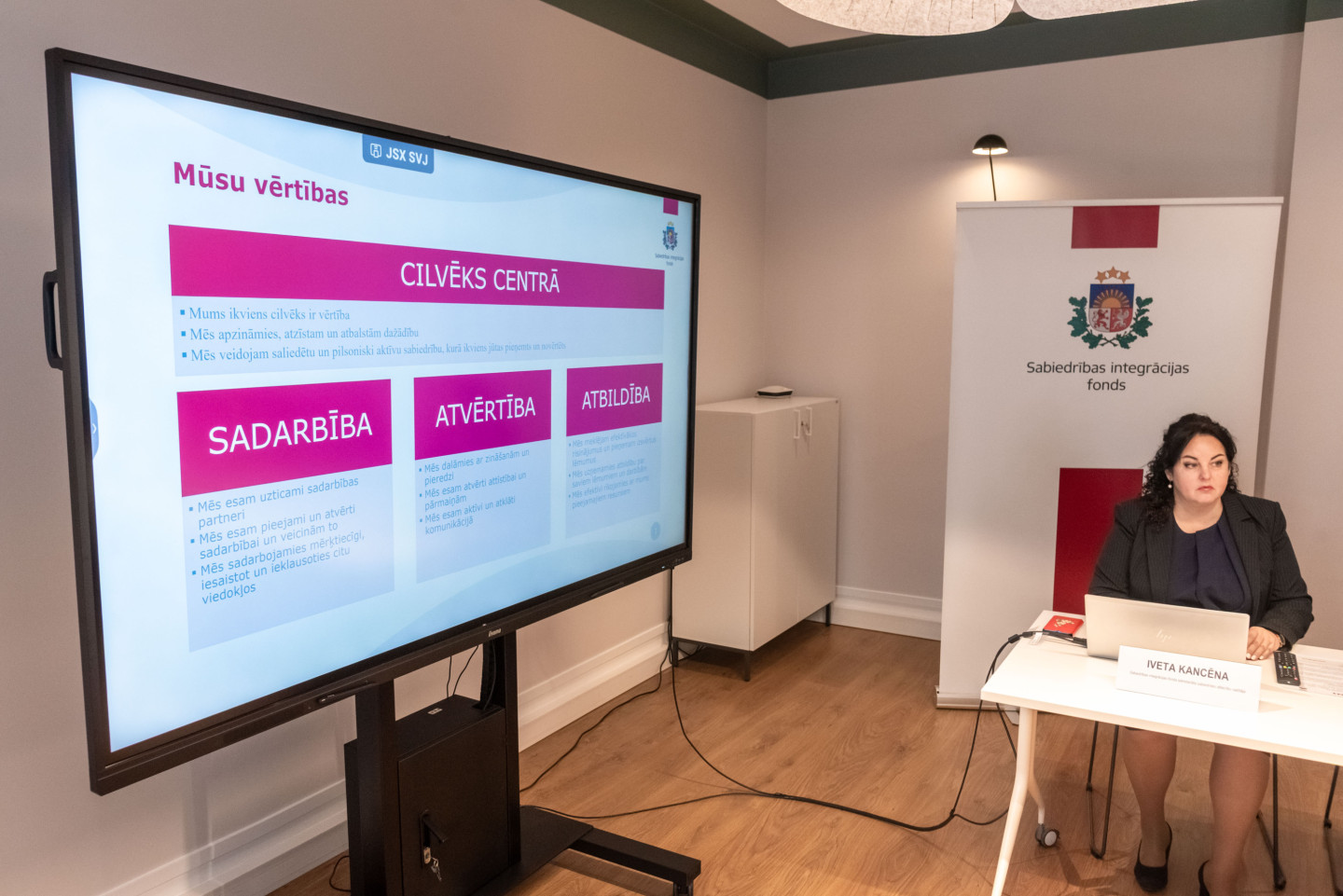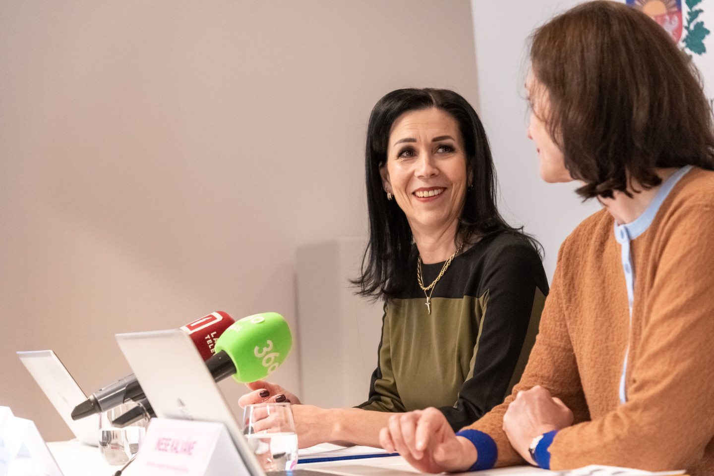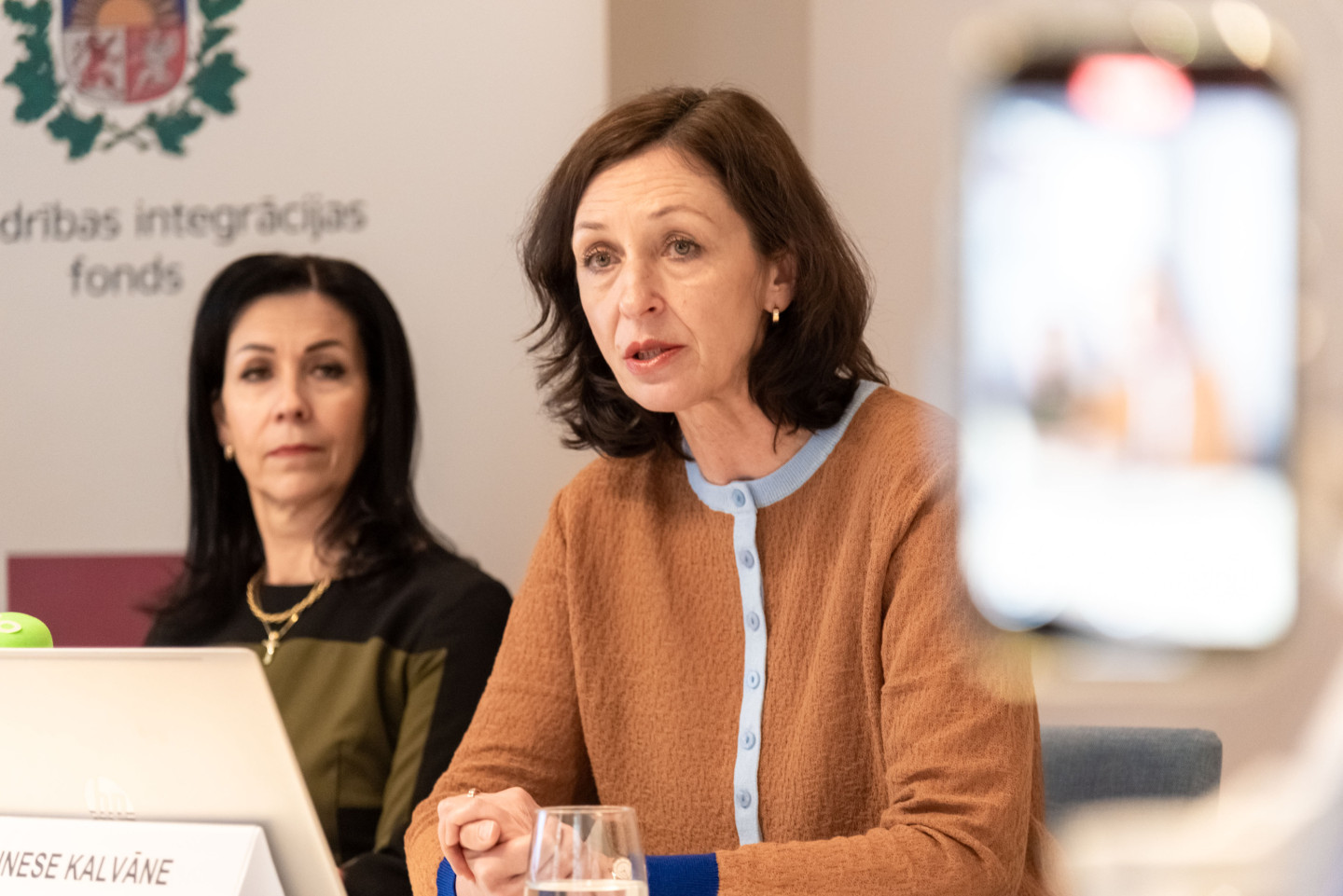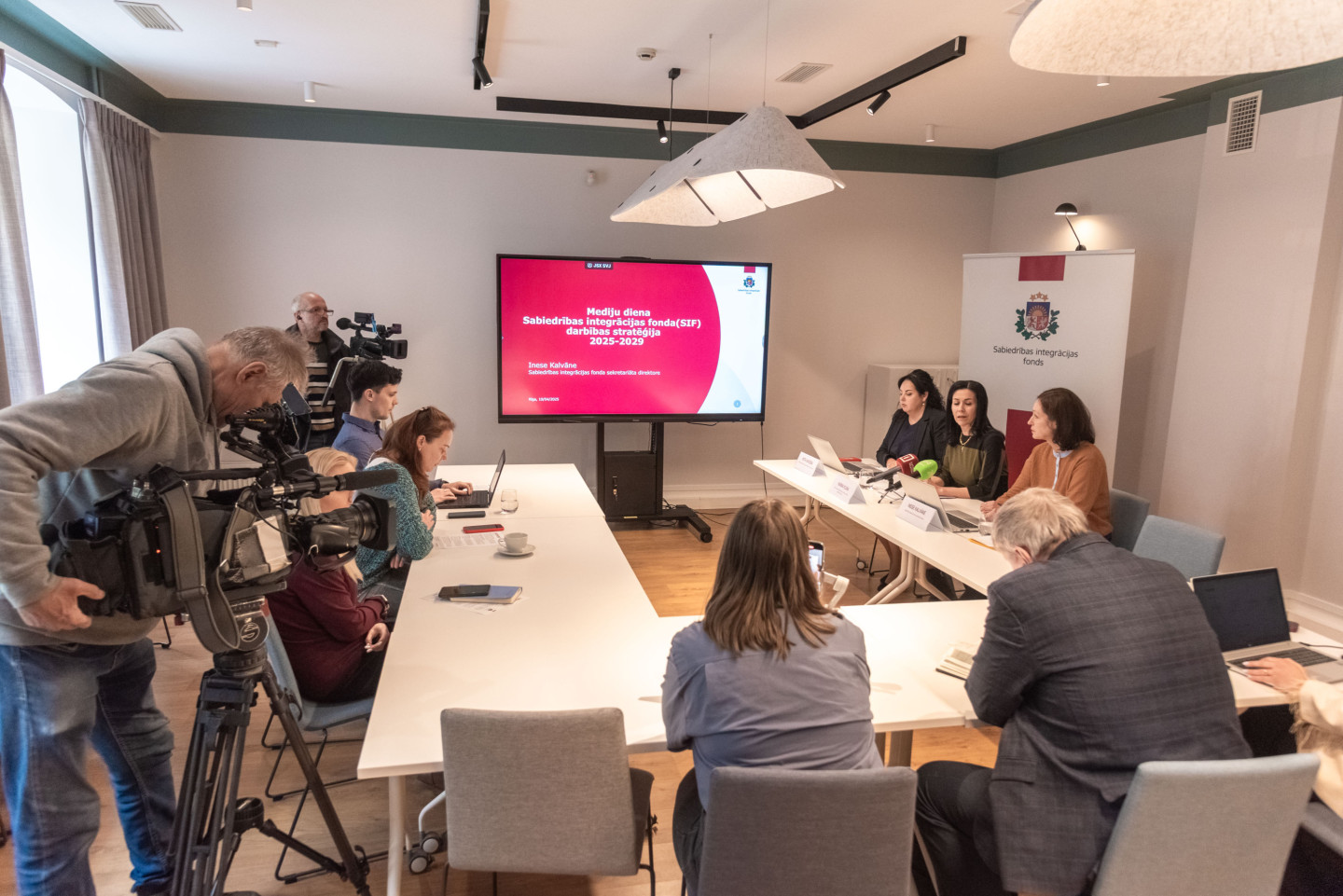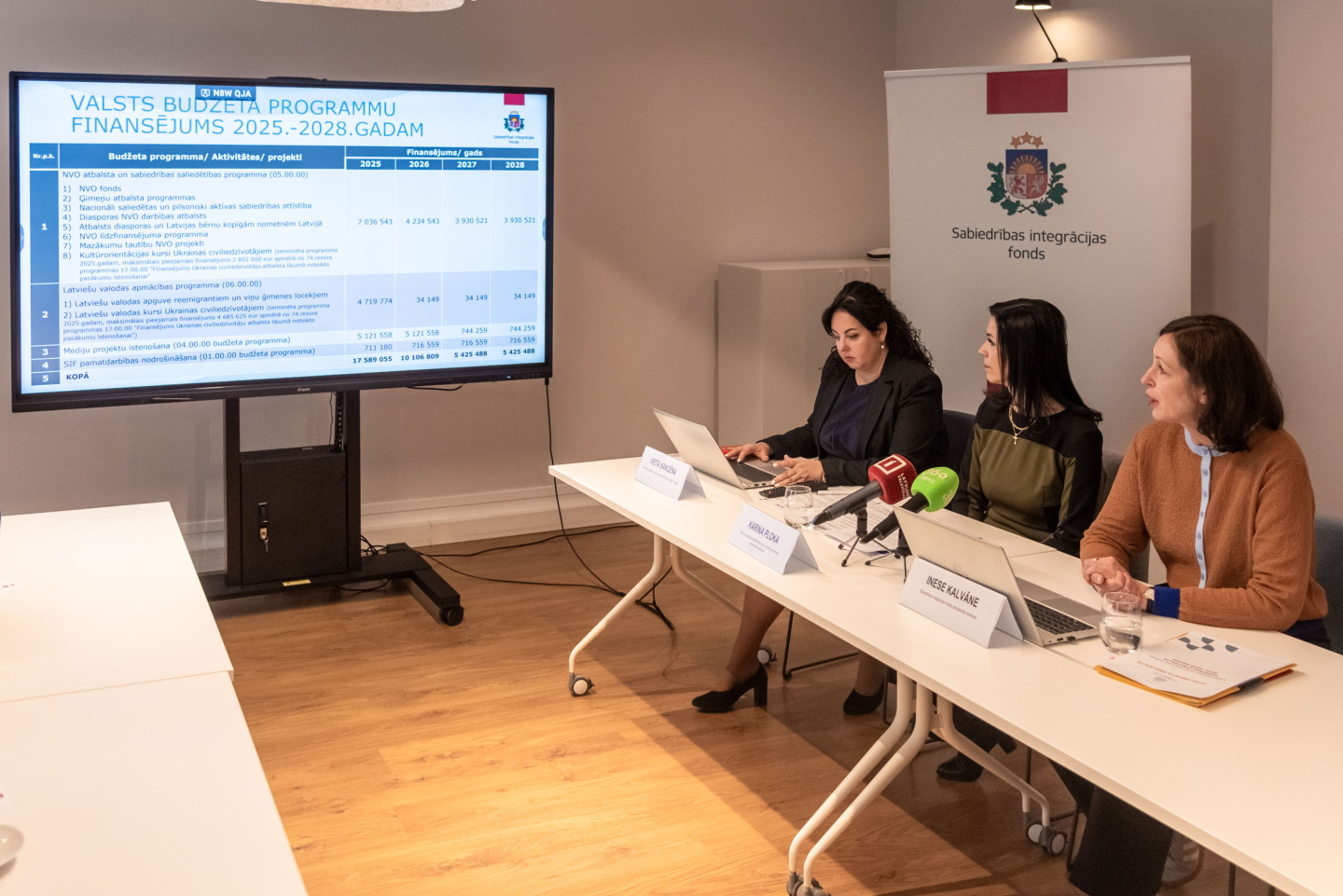Sabiedrības integrācijas fonda (SIF) sabiedrisko attiecību vadītāja Iveta Kancēna (no kreisās), Ministru prezidentes parlamentārā sekretāre, SIF Padomes priekšsēdētāja Karina Ploka un SIF Sekretariāta direktore Inese Kalvāne piedalās preses konferencē, kurā informē par SIF darbības prioritātēm turpmākajiem pieciem gadiem.