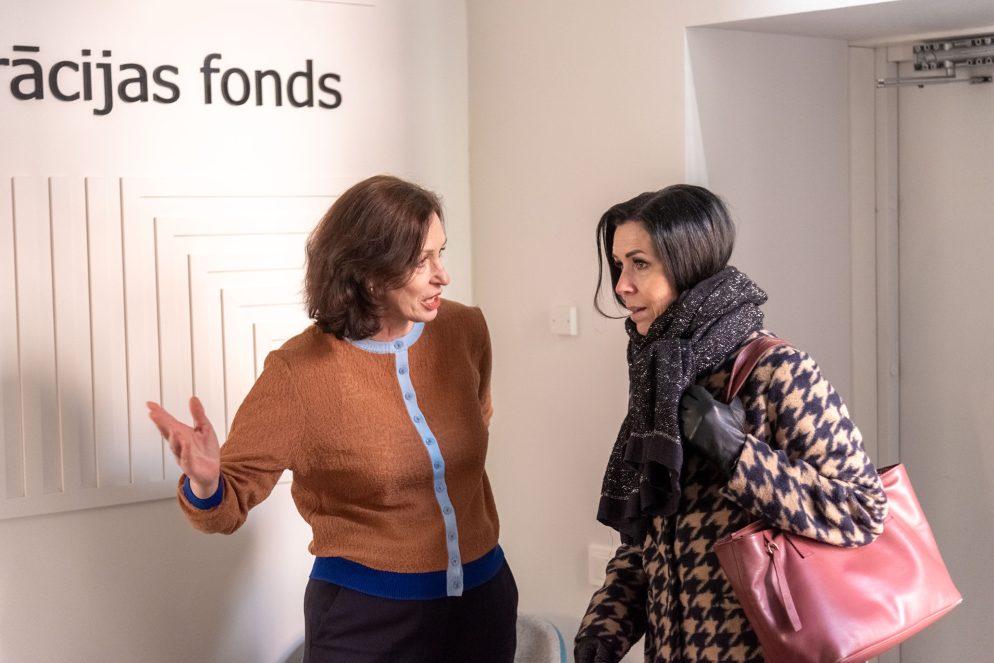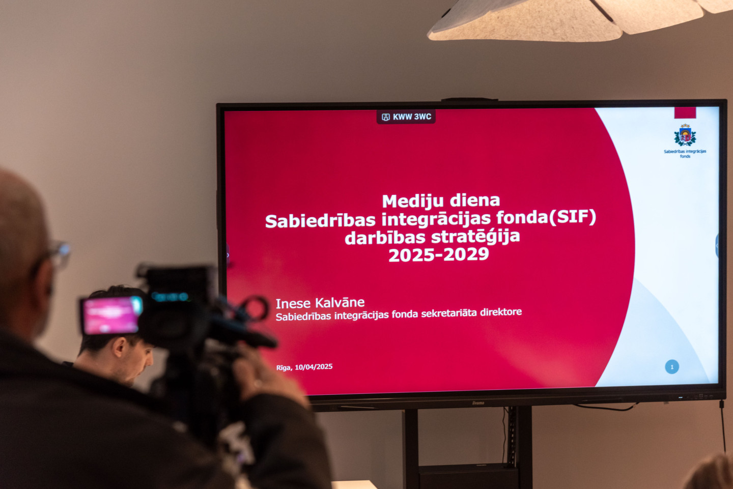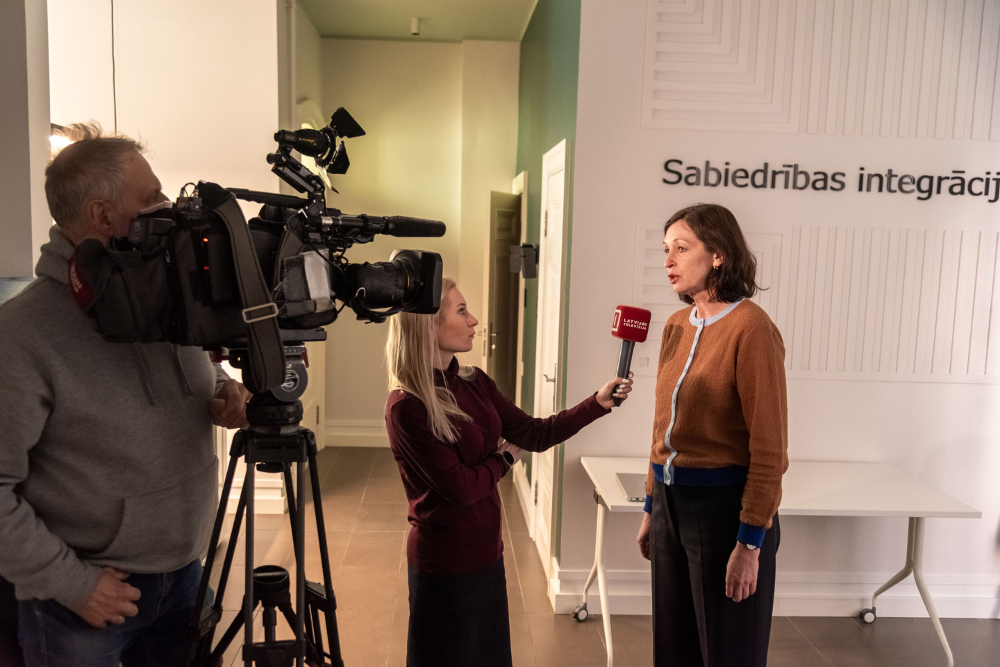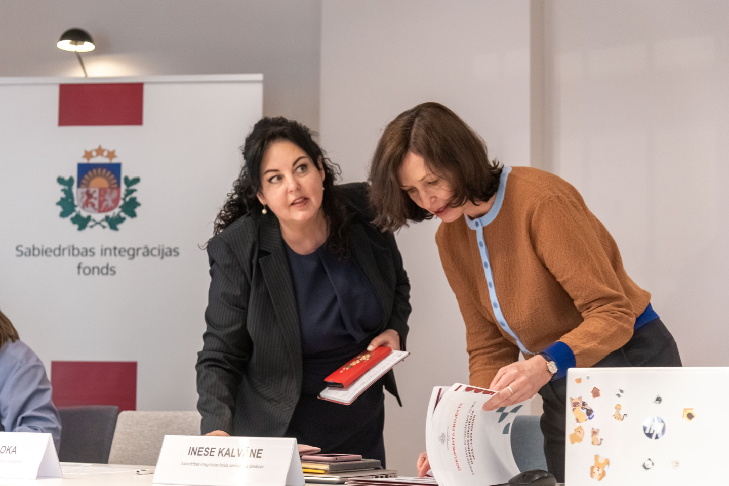 Sabiedrības integrācijas fonda (SIF) sabiedrisko attiecību vadītāja Iveta Kancēna (no kreisās), Ministru prezidentes parlamentārā sekretāre, SIF Padomes priekšsēdētāja Karina Ploka un SIF Sekretariāta direktore Inese Kalvāne piedalās preses konferencē, kurā informē par SIF darbības prioritātēm turpmākajiem pieciem gadiem.