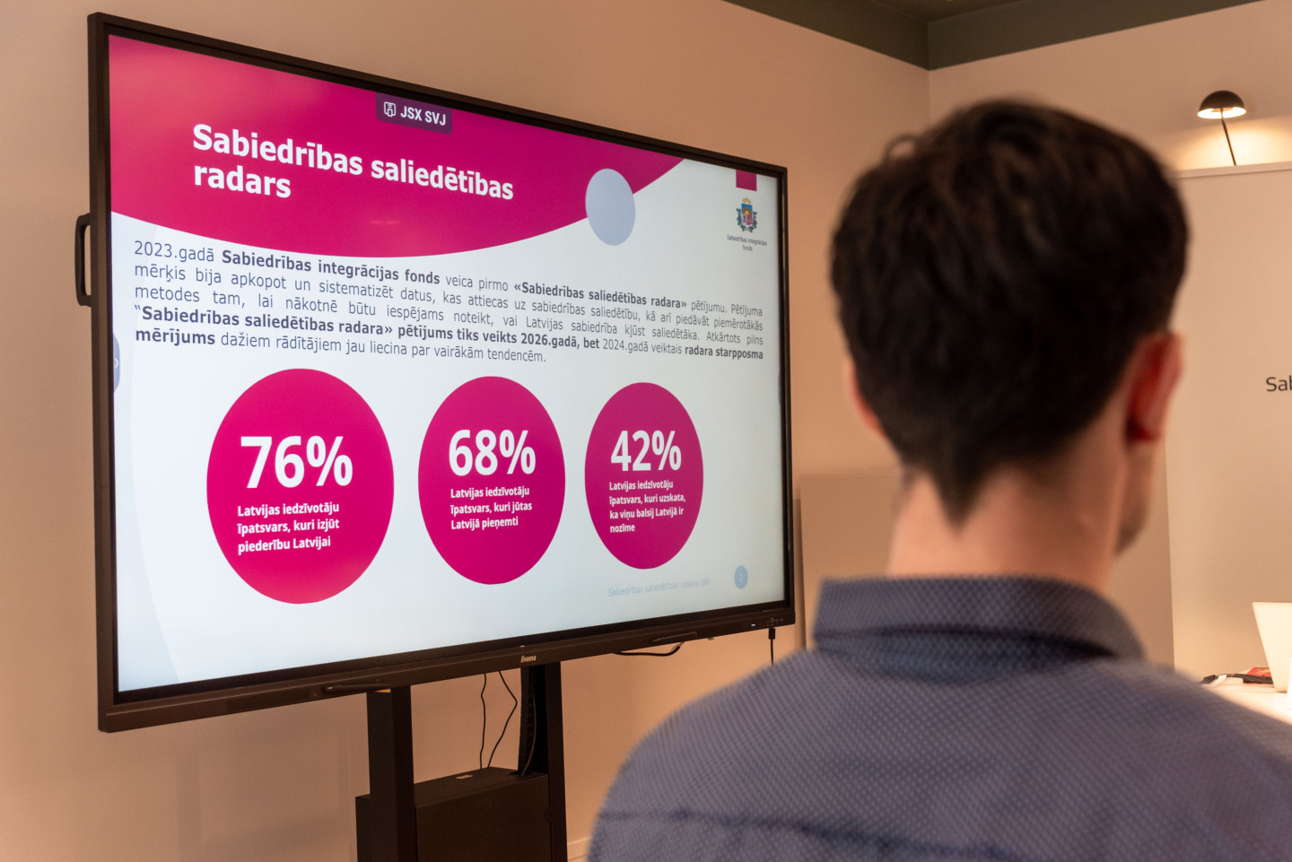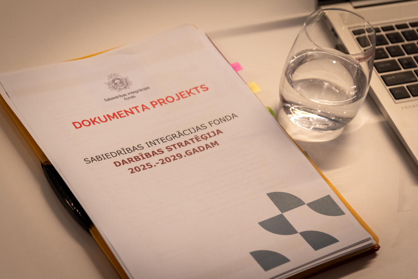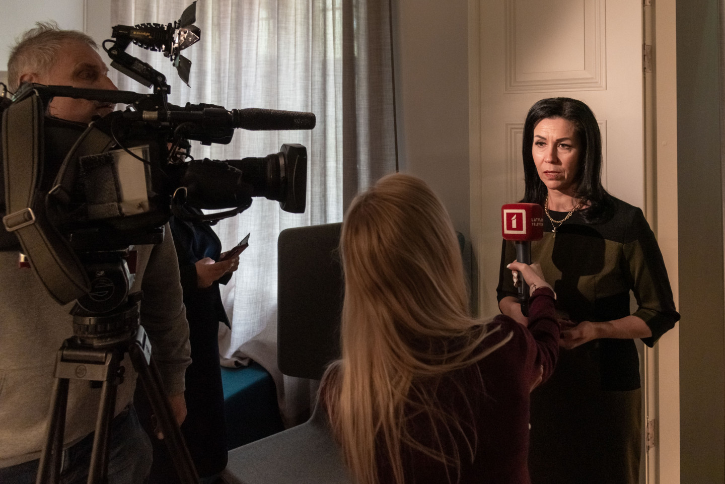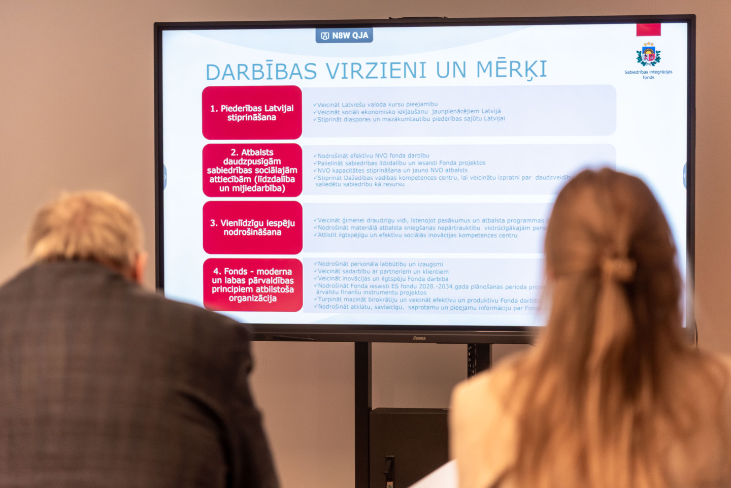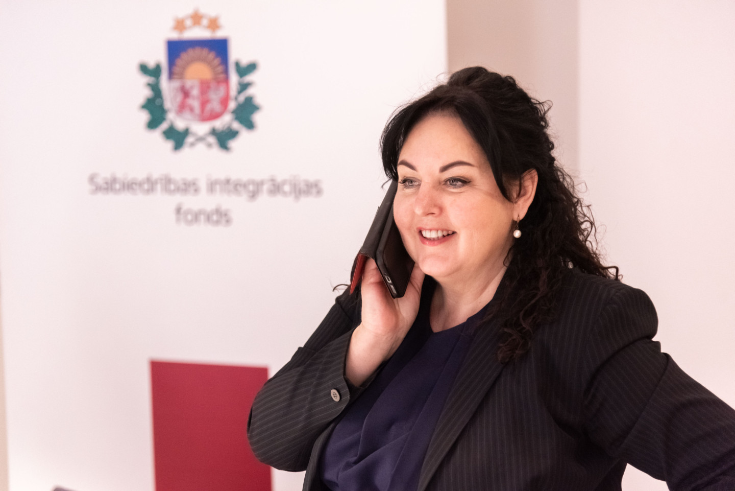 Sabiedrības integrācijas fonda (SIF) sabiedrisko attiecību vadītāja Iveta Kancēna (no kreisās), Ministru prezidentes parlamentārā sekretāre, SIF Padomes priekšsēdētāja Karina Ploka un SIF Sekretariāta direktore Inese Kalvāne piedalās preses konferencē, kurā informē par SIF darbības prioritātēm turpmākajiem pieciem gadiem.
