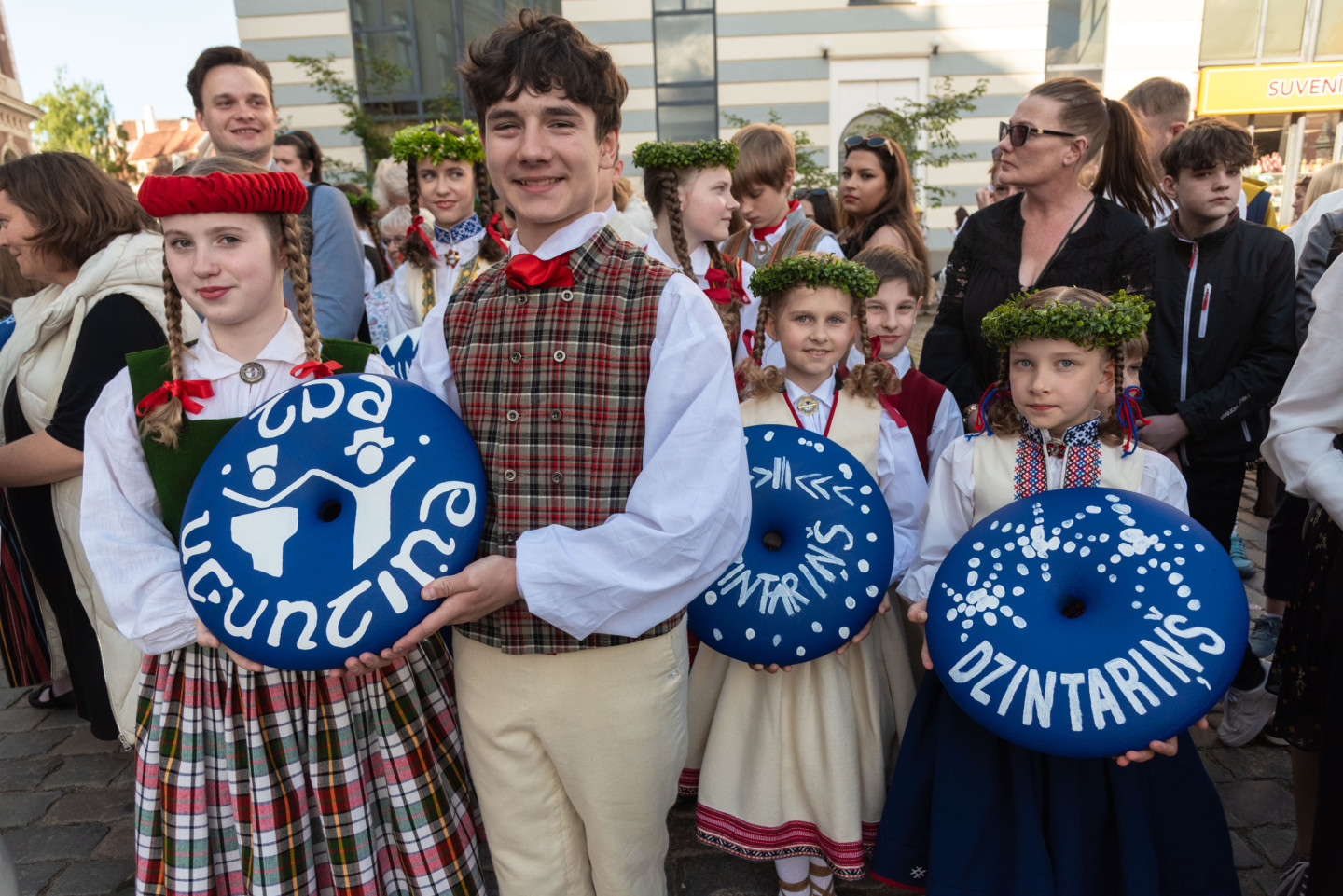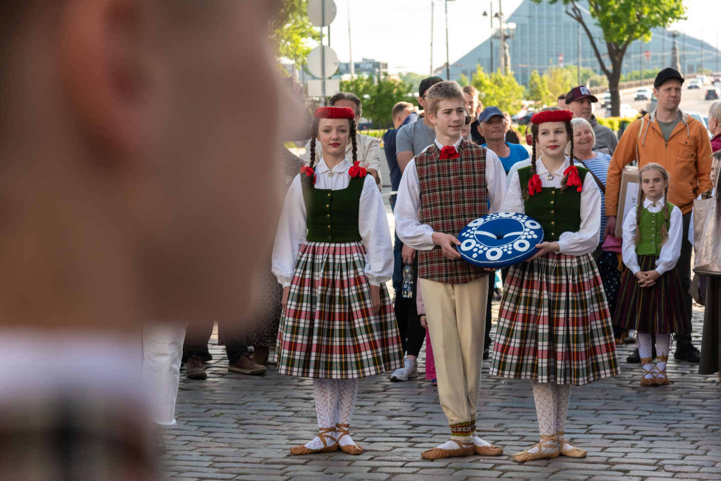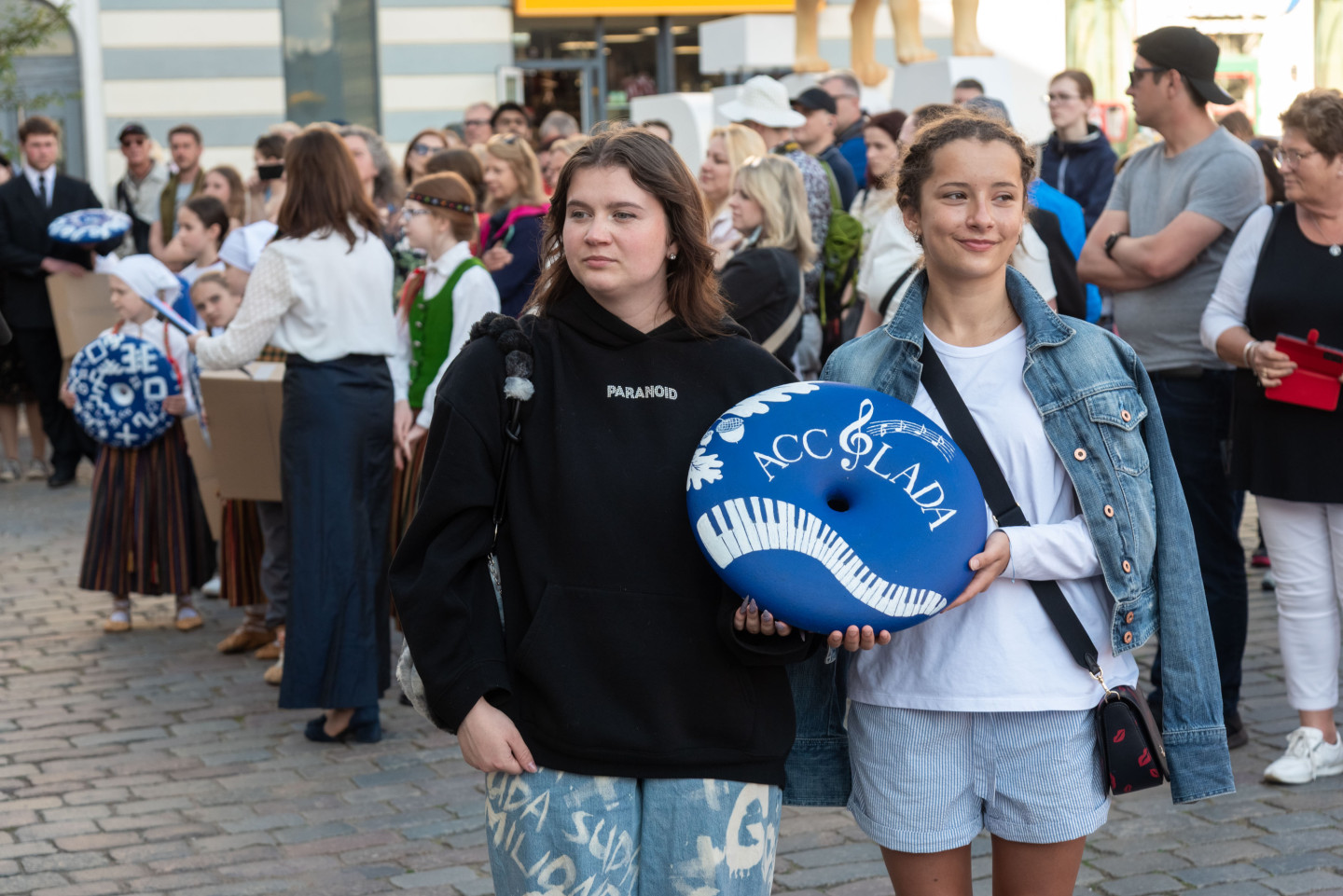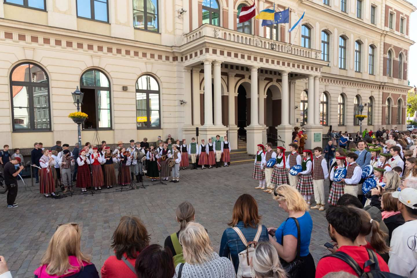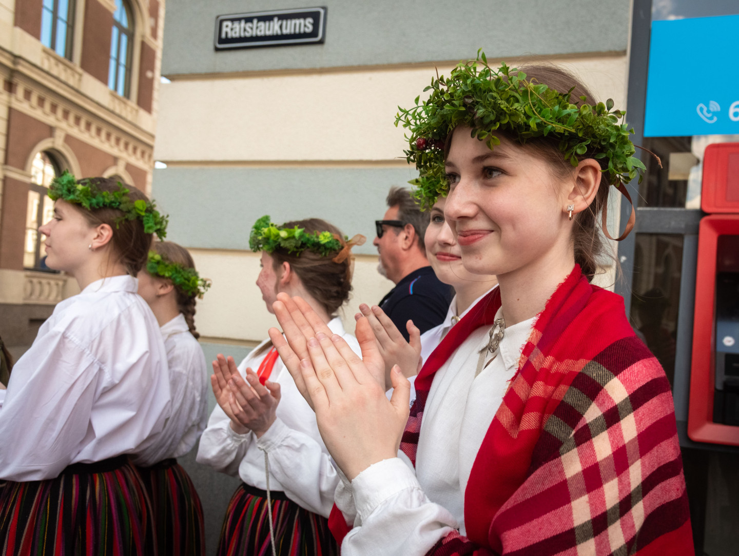 Rātslaukumā svinīgi tiek nodotas XIII Latvijas Skolu jaunatnes dziesmu un deju svētku dalībnieku apgleznotās pērles, kas tapušas bērnu un jauniešu centros svētku ieskandināšanas projekta "Savīšanās ceļš" laikā