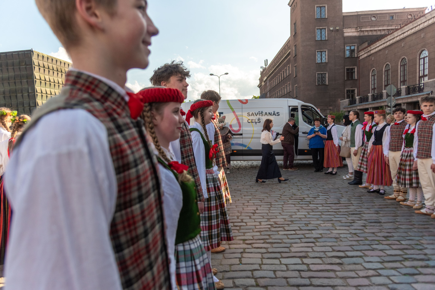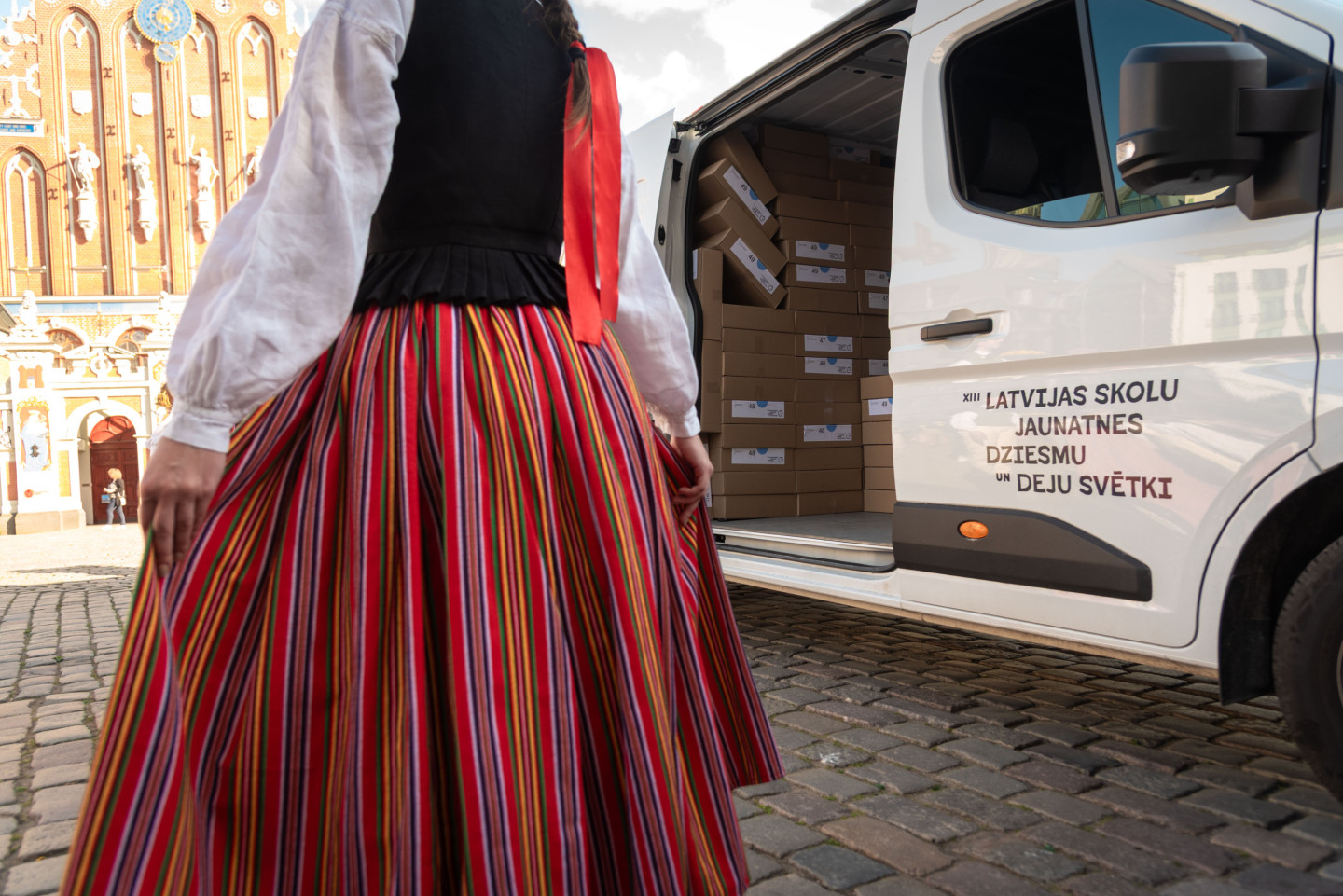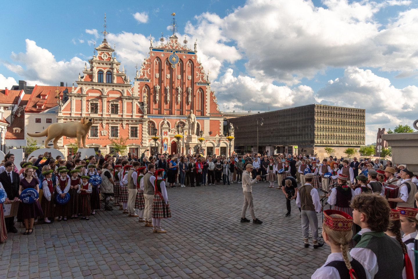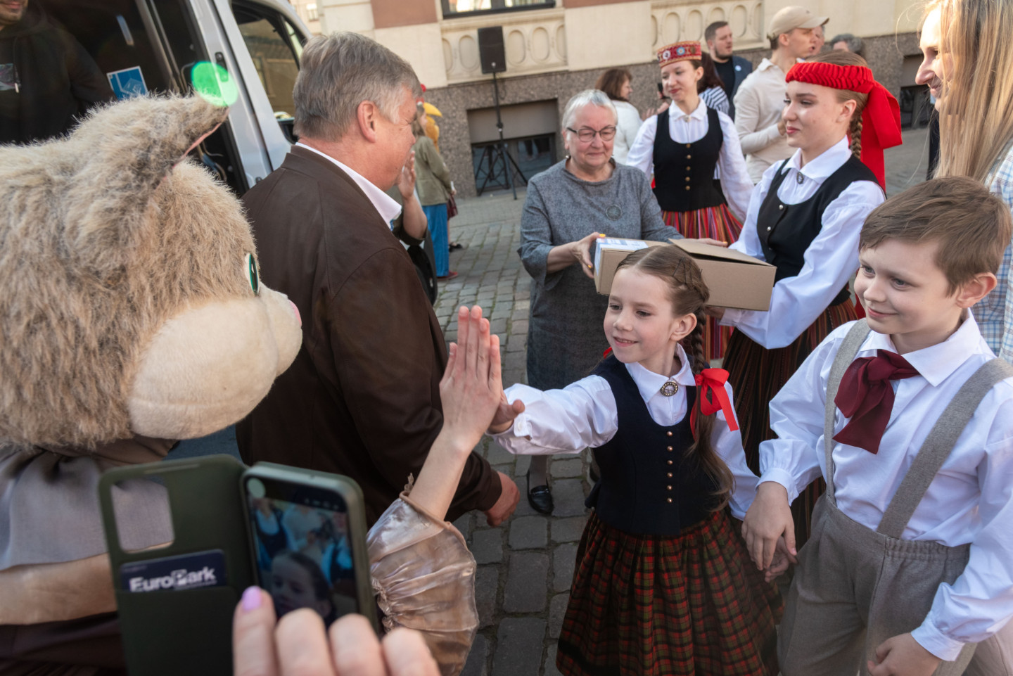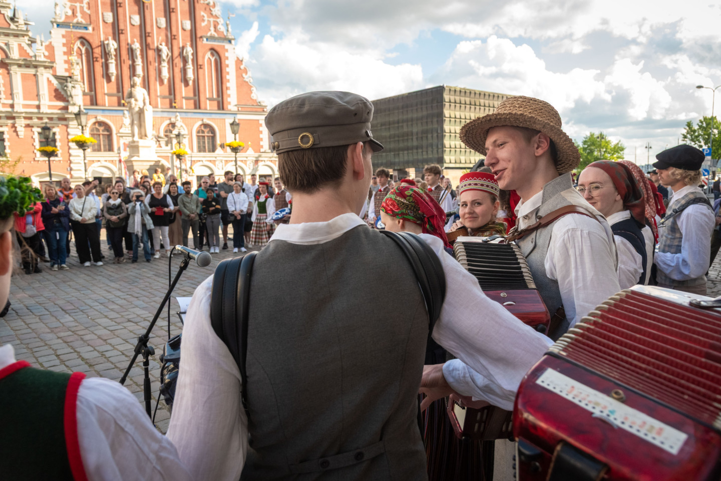 Rātslaukumā svinīgi tiek nodotas XIII Latvijas Skolu jaunatnes dziesmu un deju svētku dalībnieku apgleznotās pērles, kas tapušas bērnu un jauniešu centros svētku ieskandināšanas projekta "Savīšanās ceļš" laikā