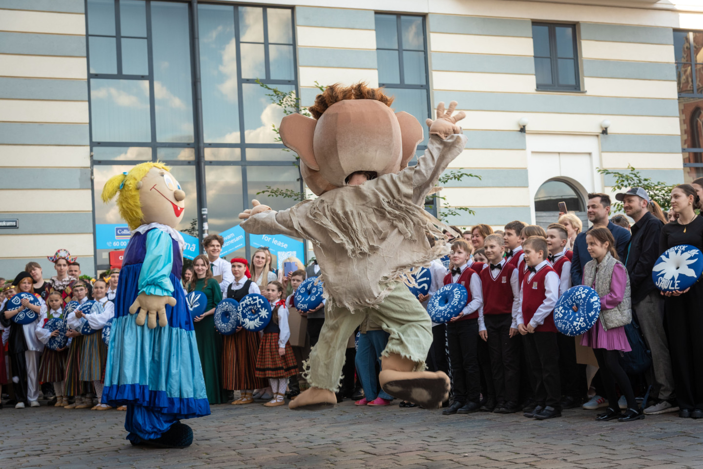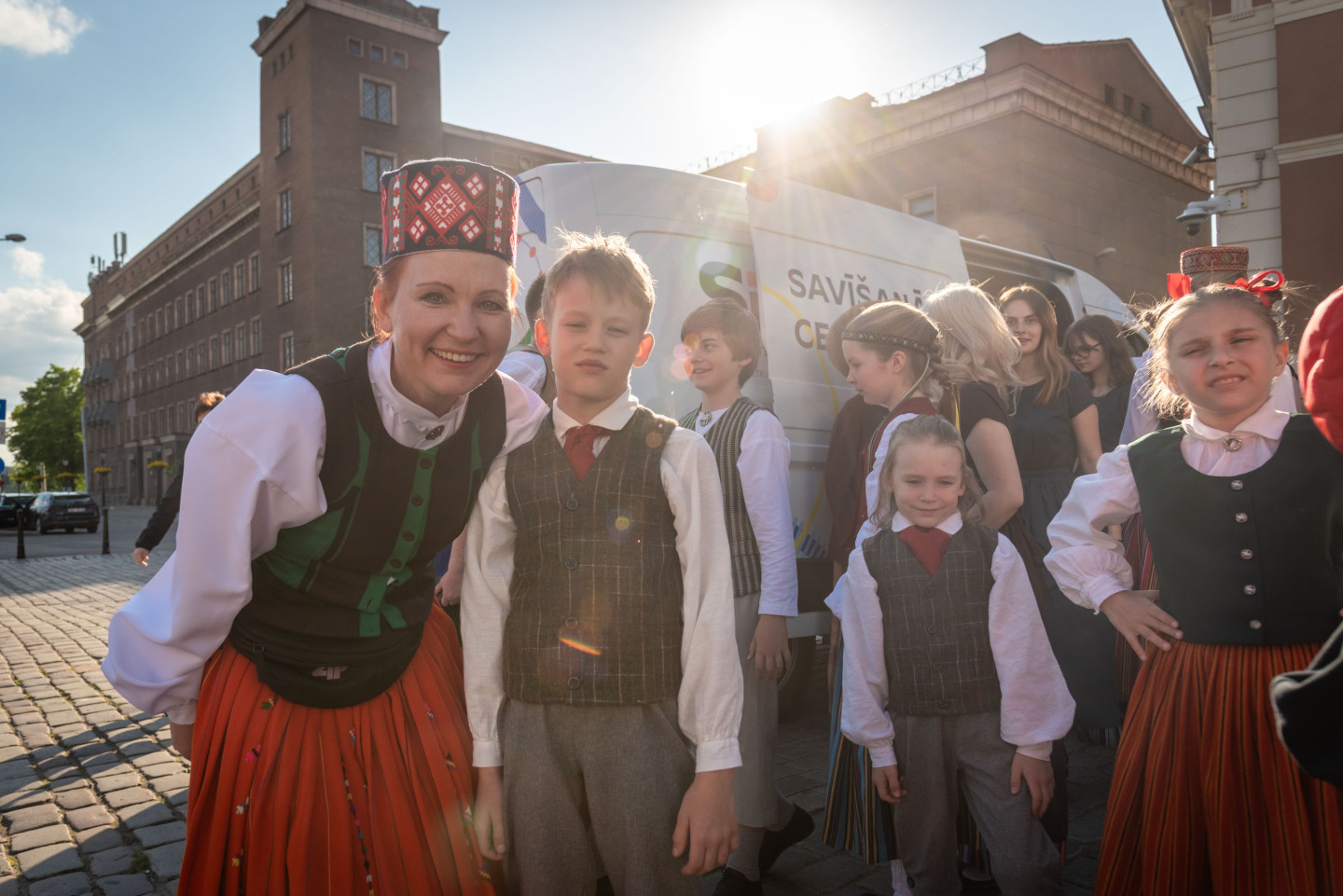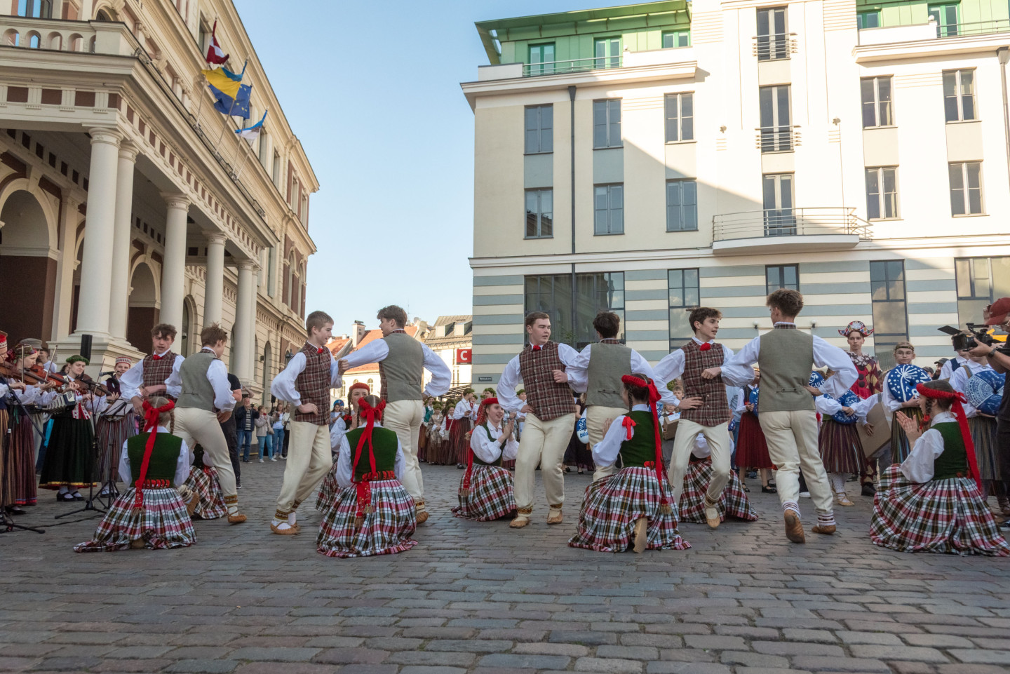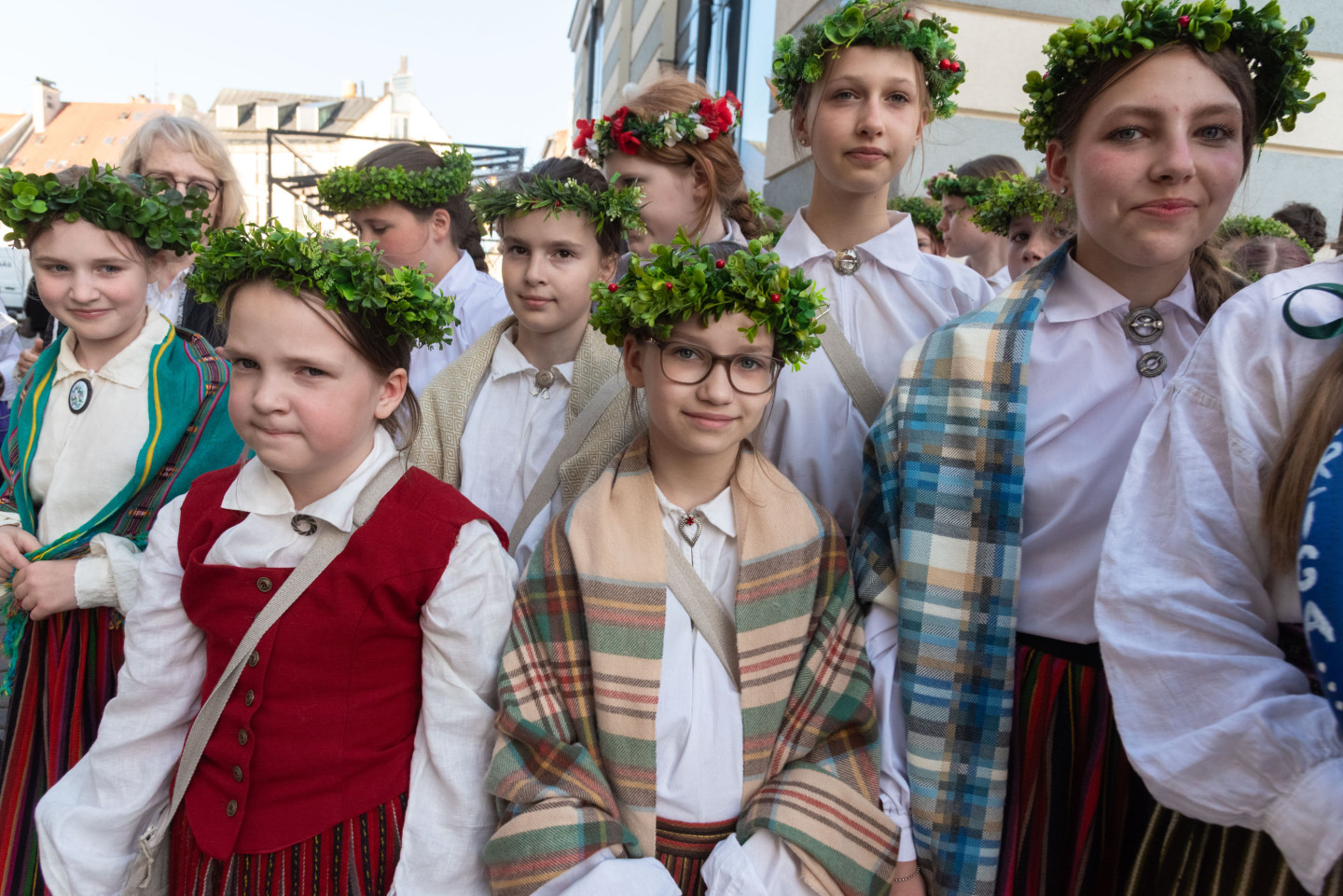 Rātslaukumā svinīgi tiek nodotas XIII Latvijas Skolu jaunatnes dziesmu un deju svētku dalībnieku apgleznotās pērles, kas tapušas bērnu un jauniešu centros svētku ieskandināšanas projekta "Savīšanās ceļš" laikā