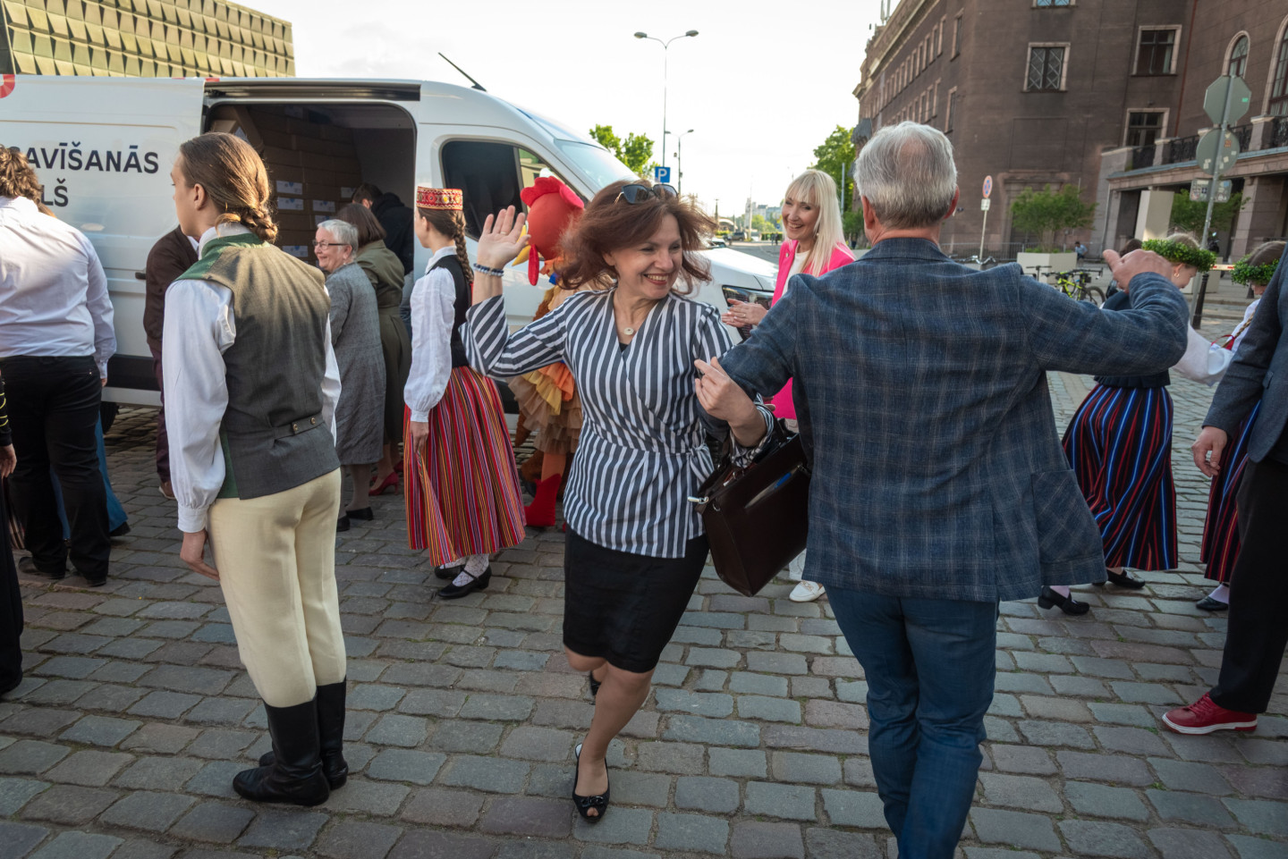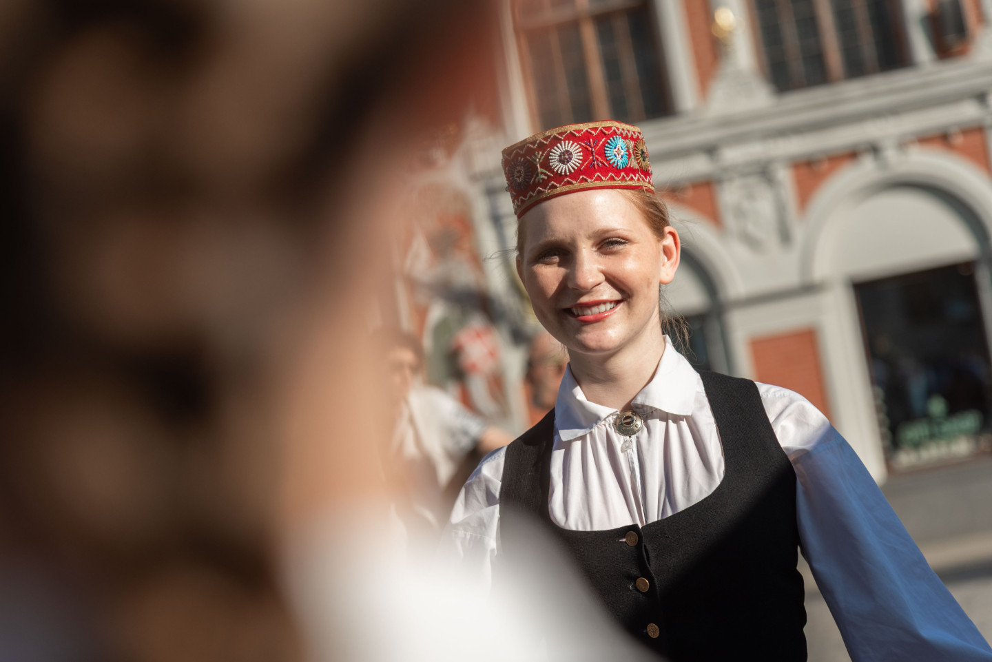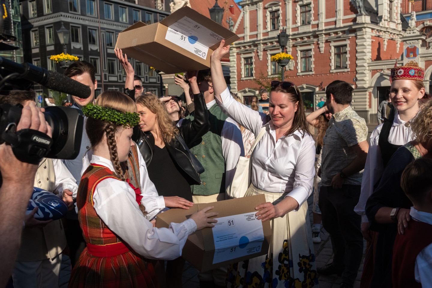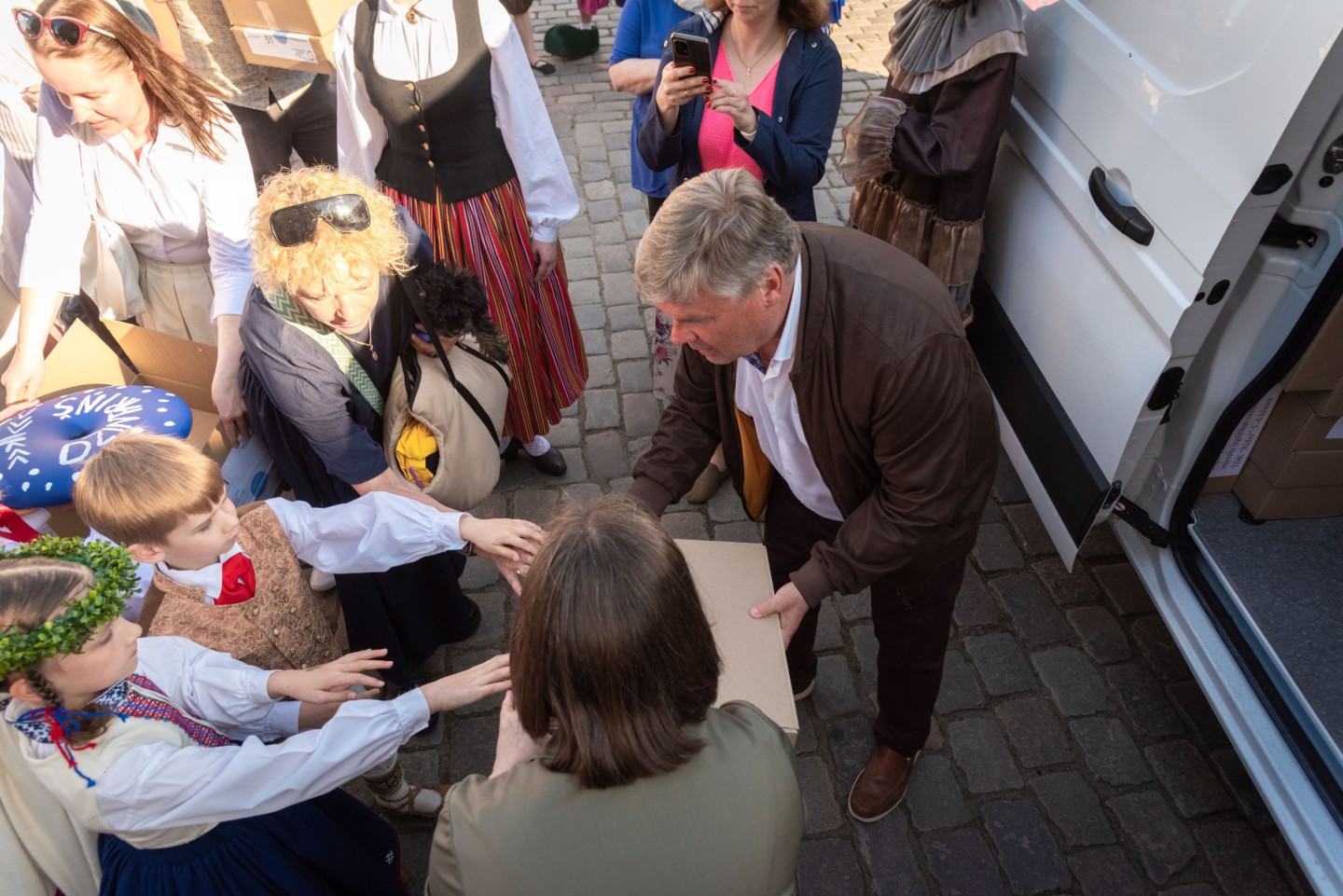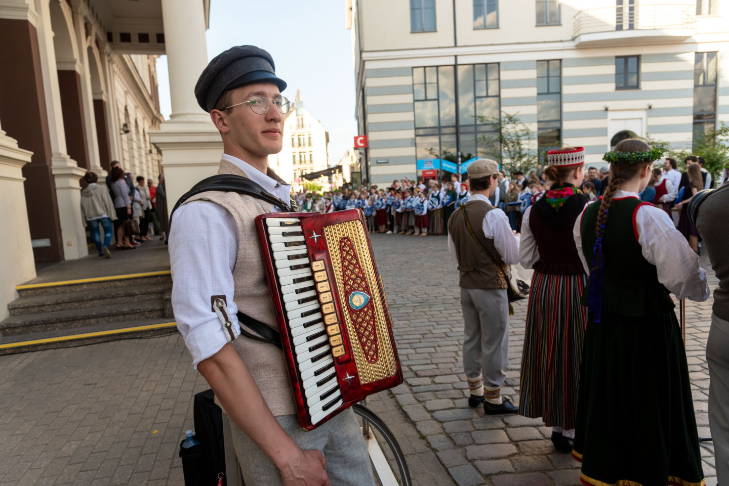 Rātslaukumā svinīgi tiek nodotas XIII Latvijas Skolu jaunatnes dziesmu un deju svētku dalībnieku apgleznotās pērles, kas tapušas bērnu un jauniešu centros svētku ieskandināšanas projekta "Savīšanās ceļš" laikā