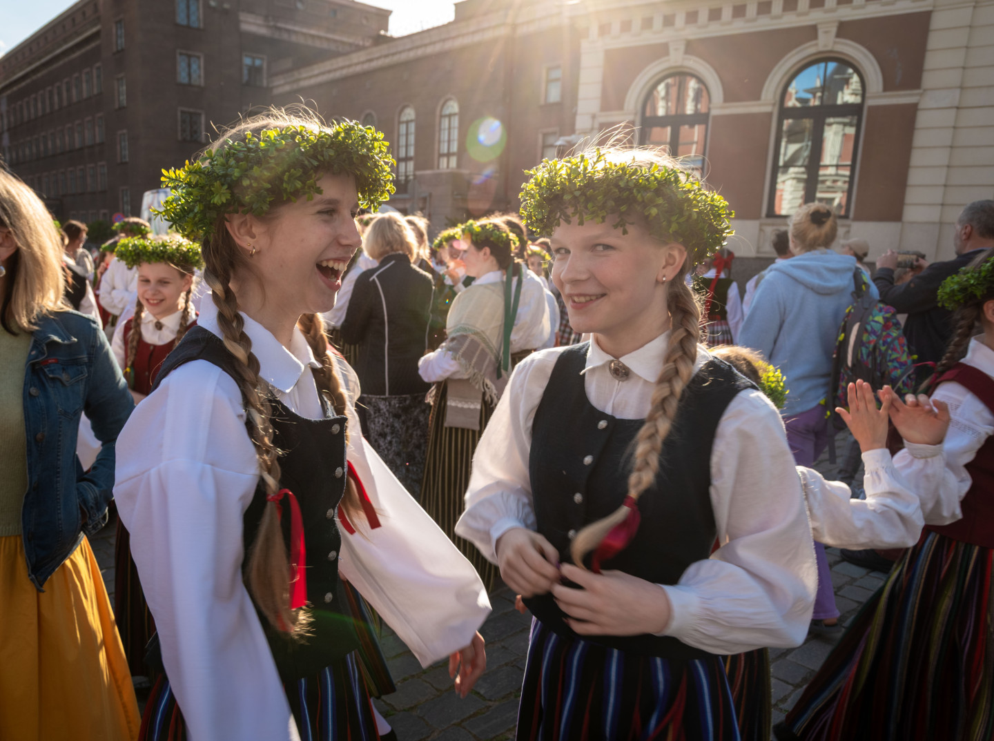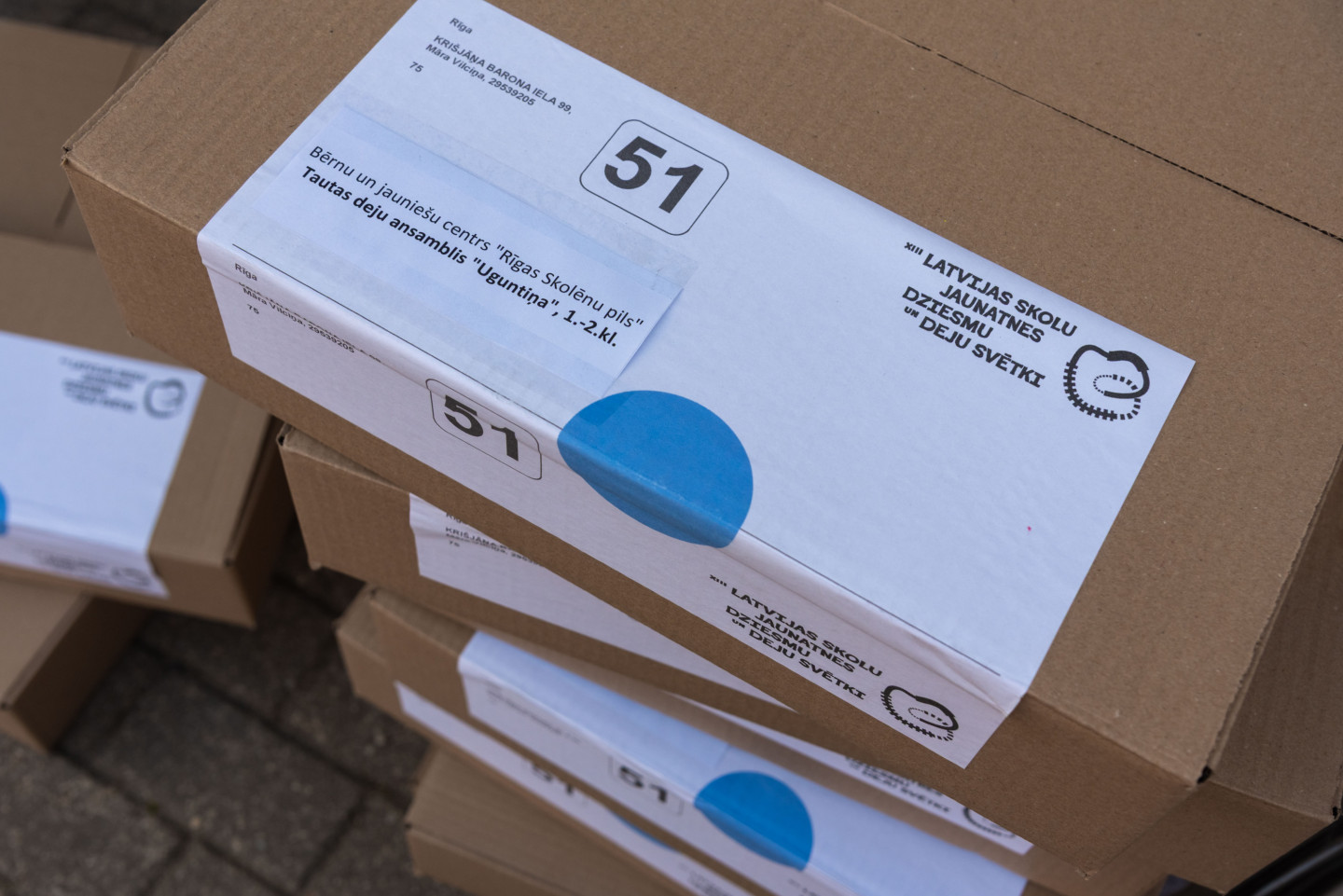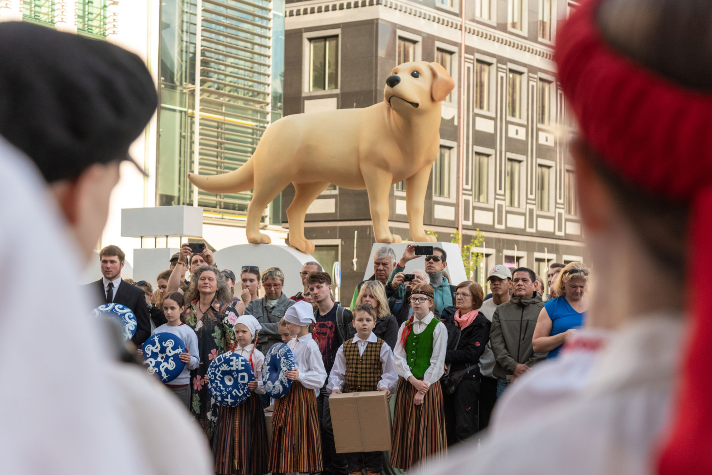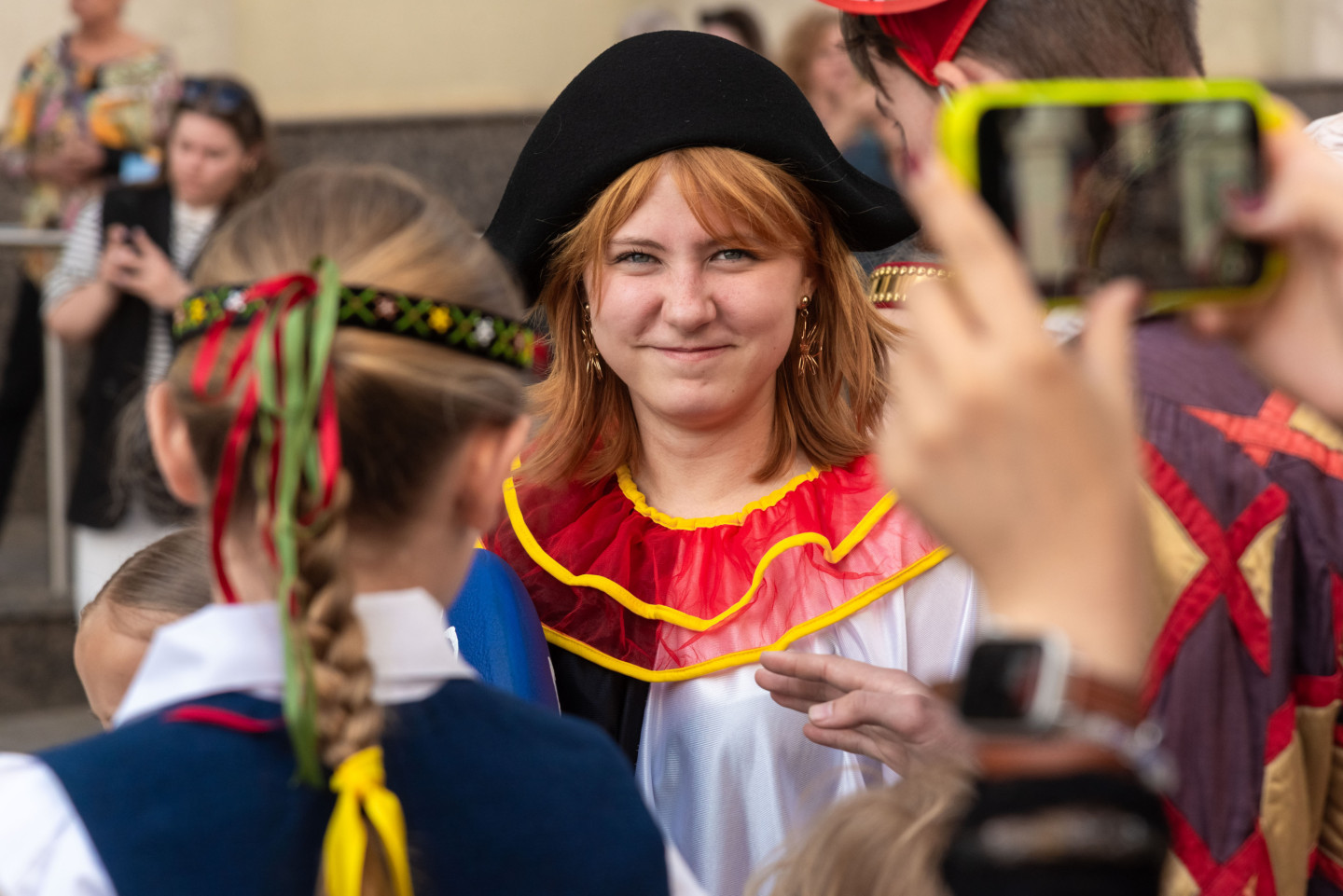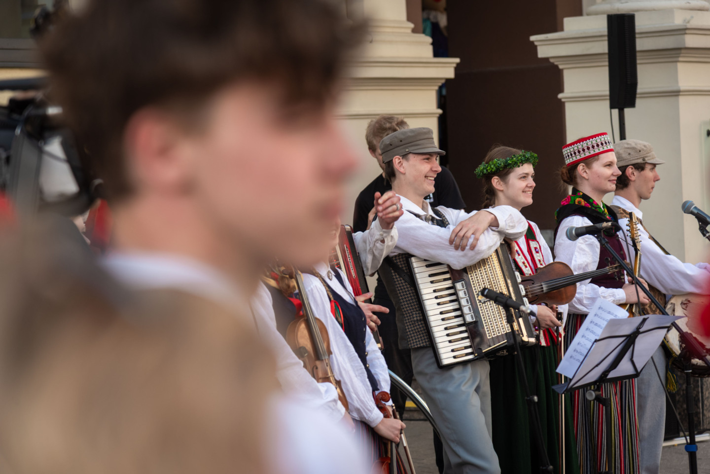 Rātslaukumā svinīgi tiek nodotas XIII Latvijas Skolu jaunatnes dziesmu un deju svētku dalībnieku apgleznotās pērles, kas tapušas bērnu un jauniešu centros svētku ieskandināšanas projekta "Savīšanās ceļš" laikā