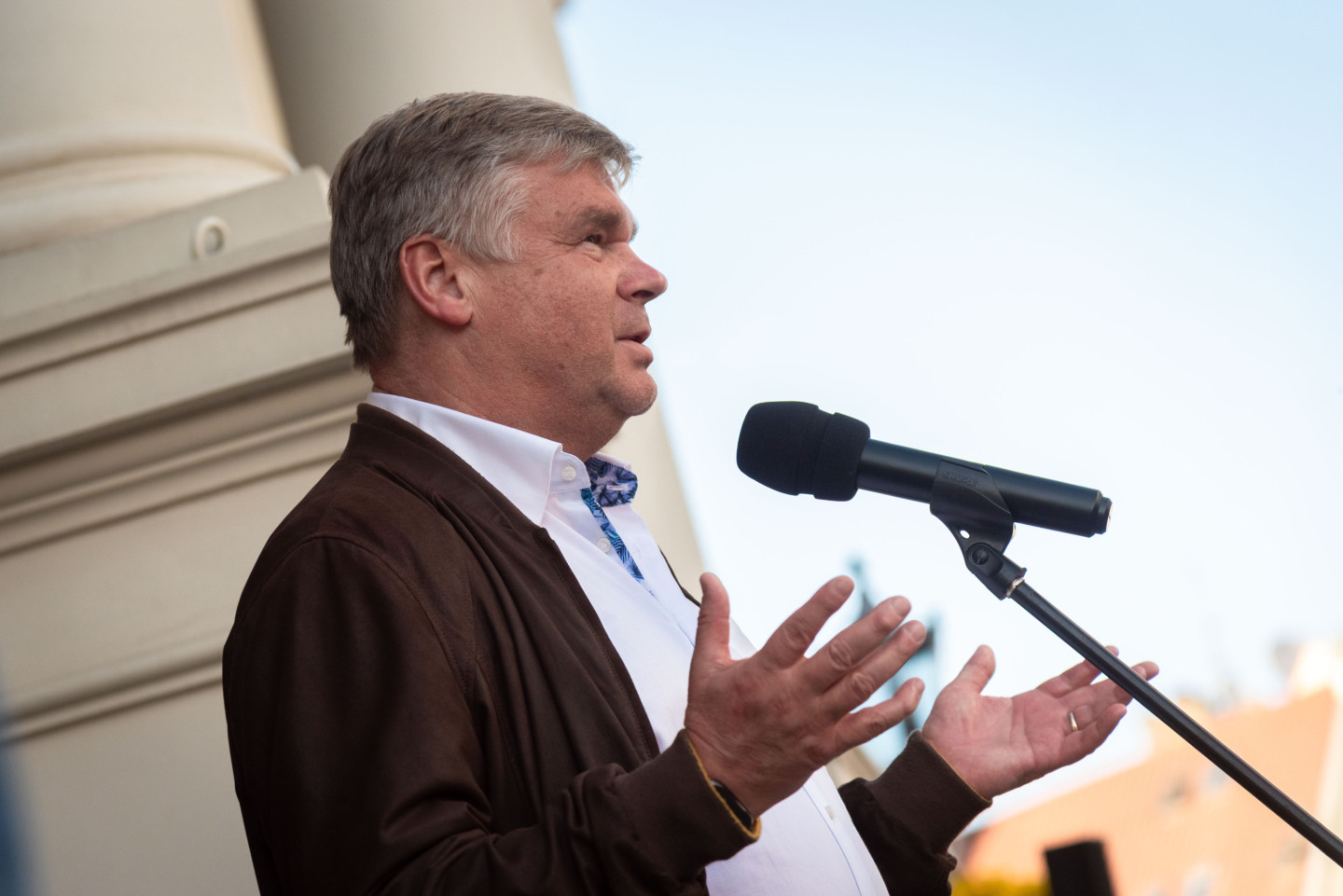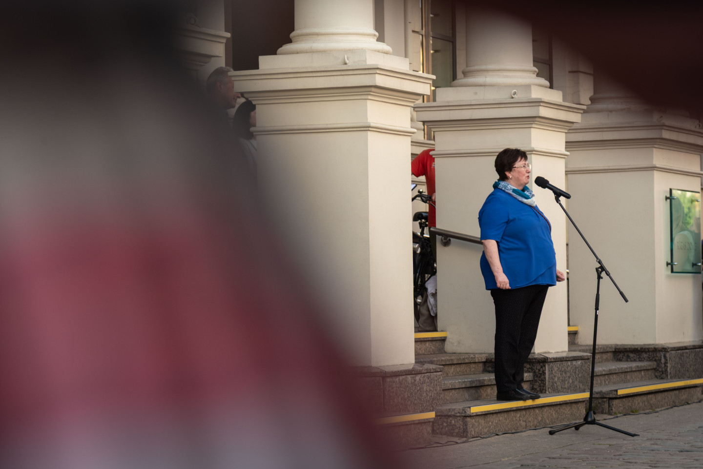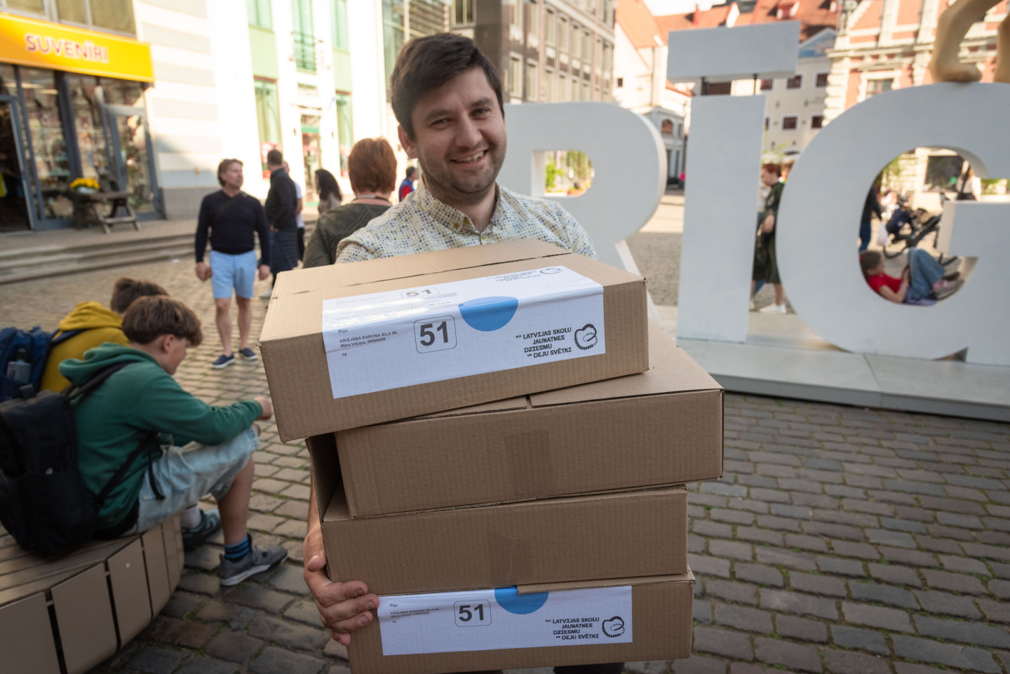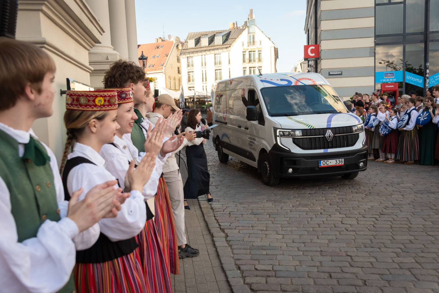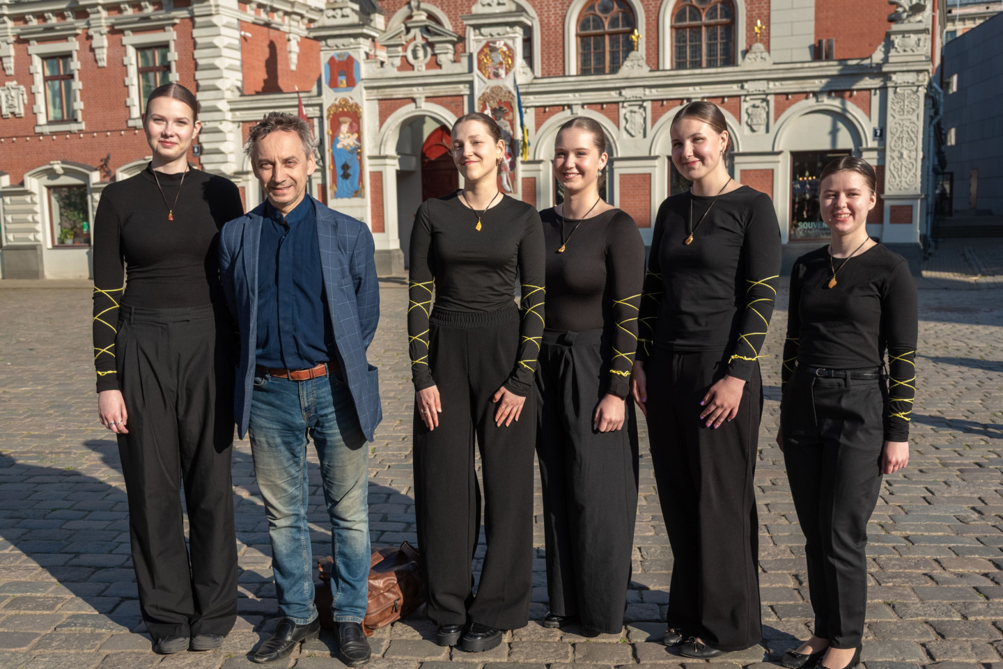 Rātslaukumā svinīgi tiek nodotas XIII Latvijas Skolu jaunatnes dziesmu un deju svētku dalībnieku apgleznotās pērles, kas tapušas bērnu un jauniešu centros svētku ieskandināšanas projekta "Savīšanās ceļš" laikā