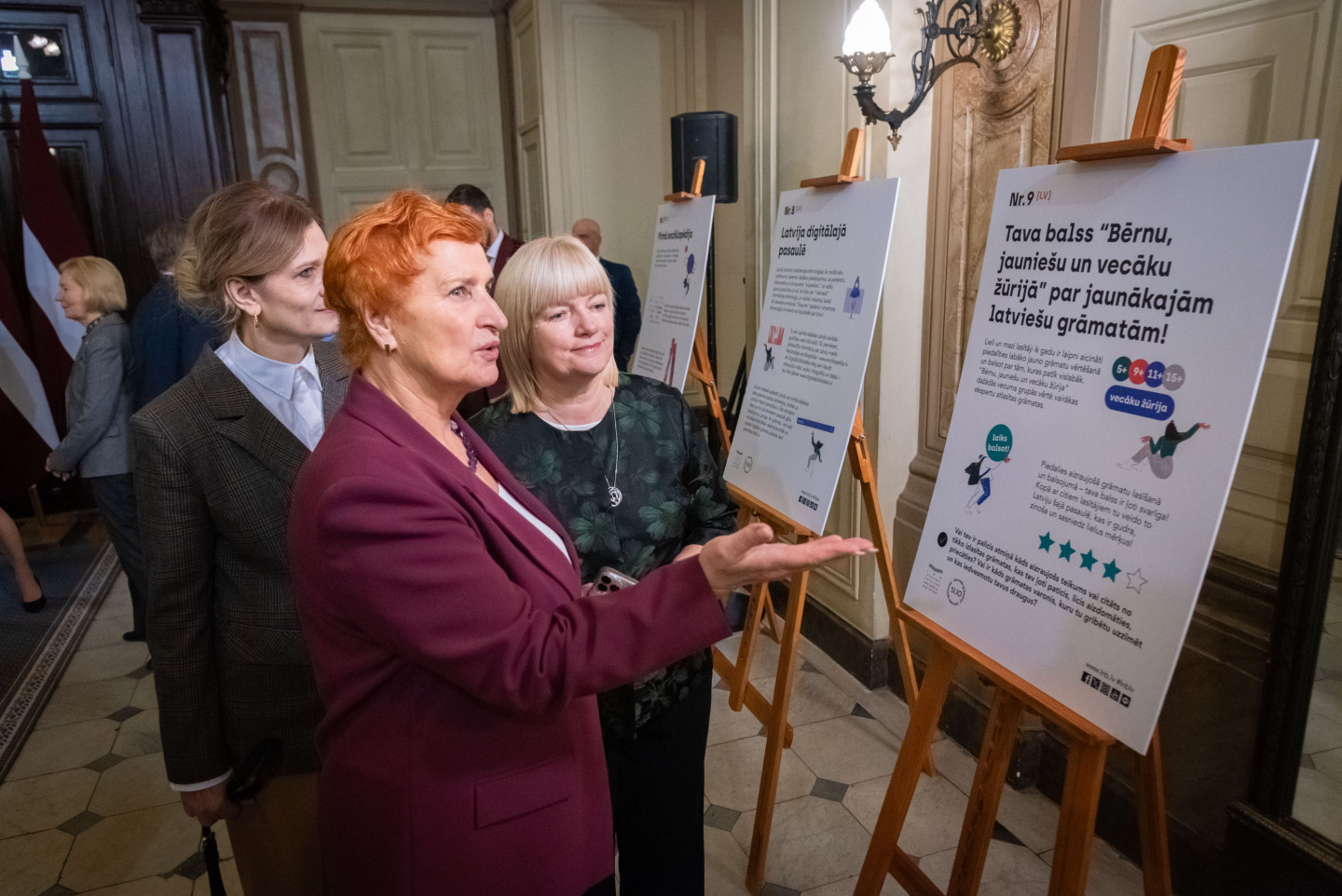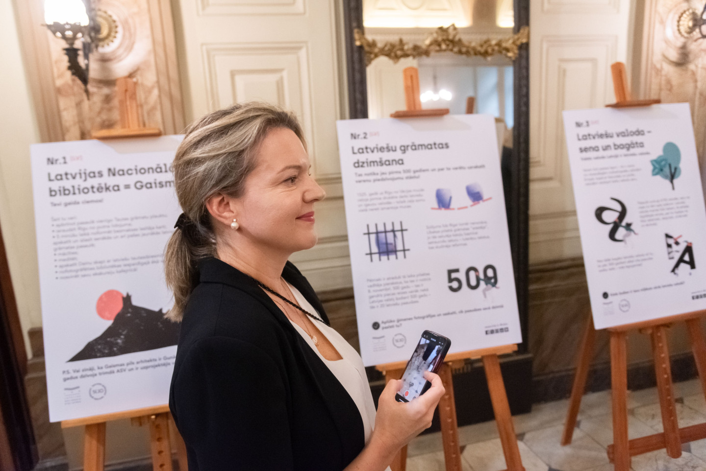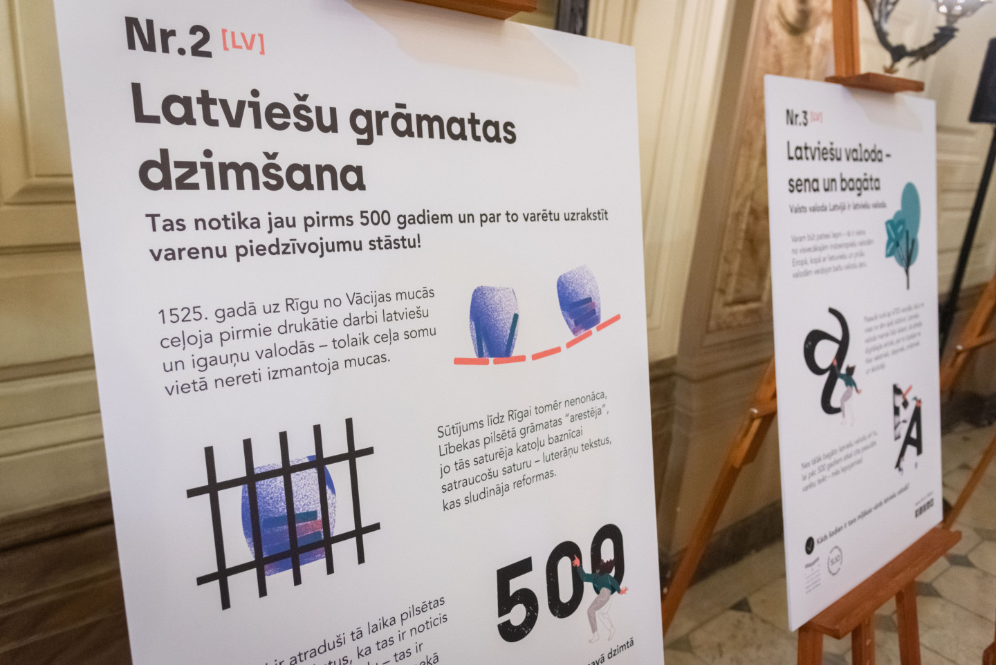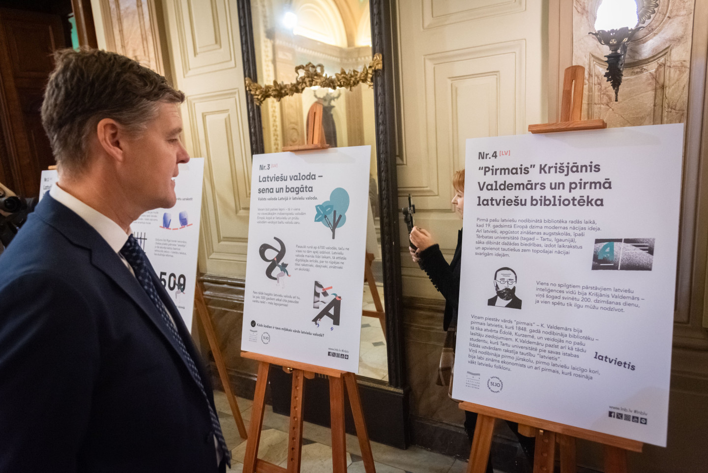 Atzīmējot latviešu grāmatniecības 500 gadus un Valsts valodas dienu, Saeimā atklāja tematisku plakātu izstādi "Latviešu grāmatai 500"