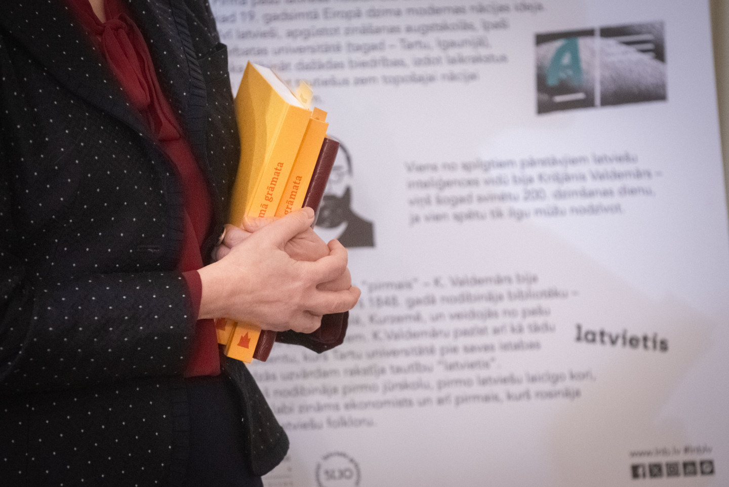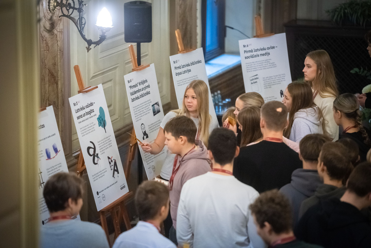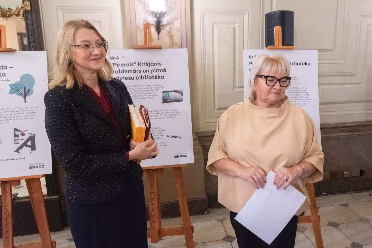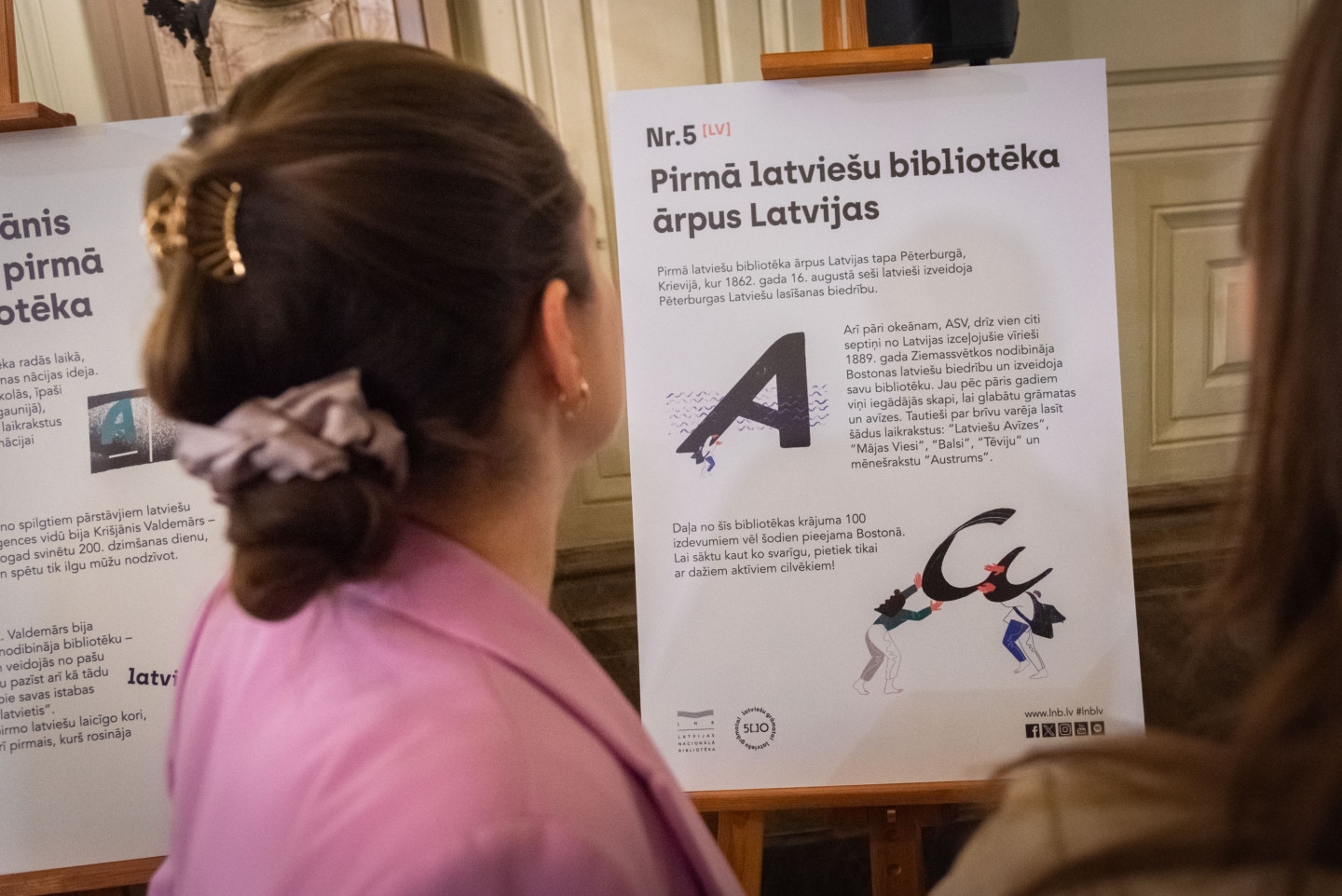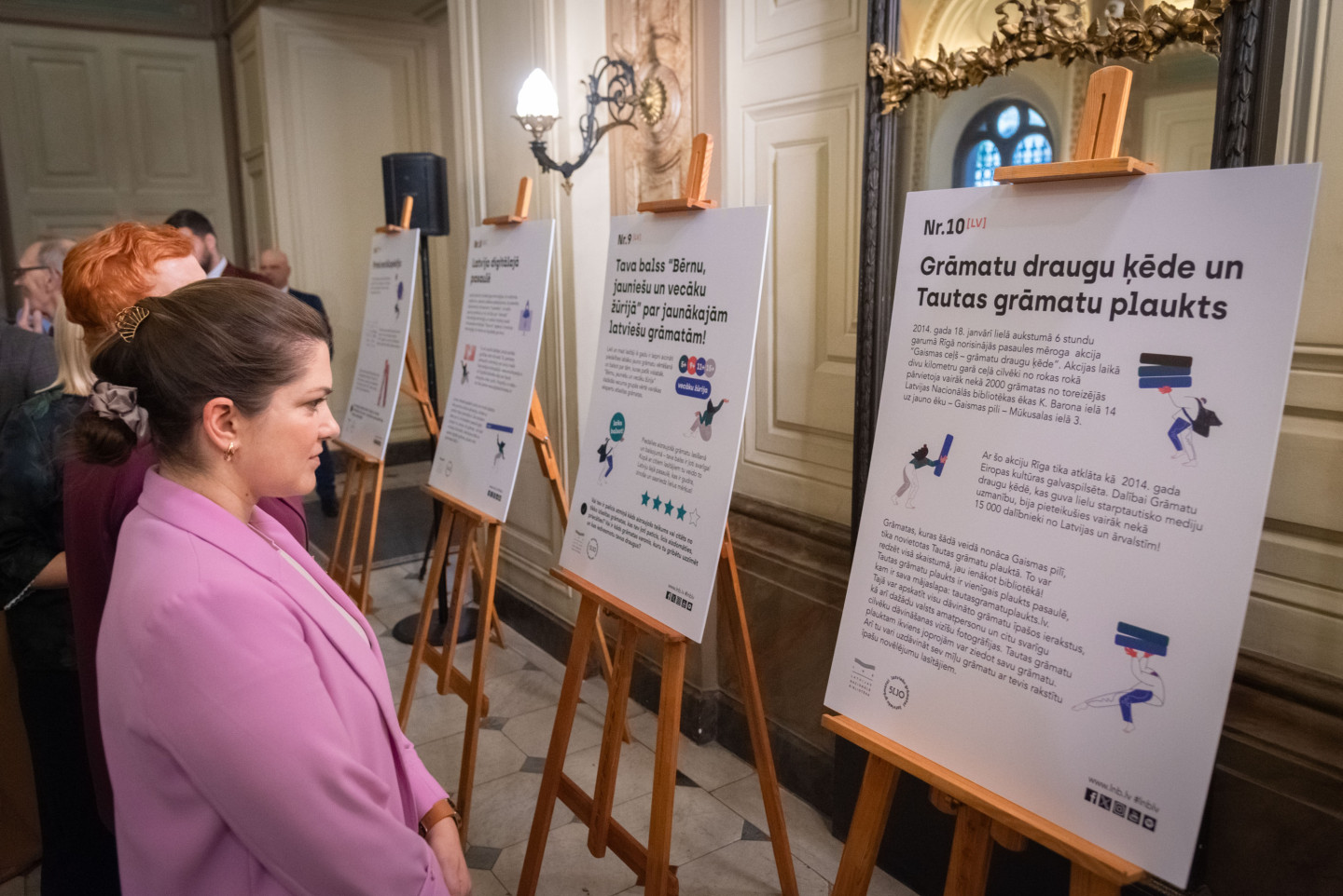 Atzīmējot latviešu grāmatniecības 500 gadus un Valsts valodas dienu, Saeimā atklāja tematisku plakātu izstādi "Latviešu grāmatai 500"