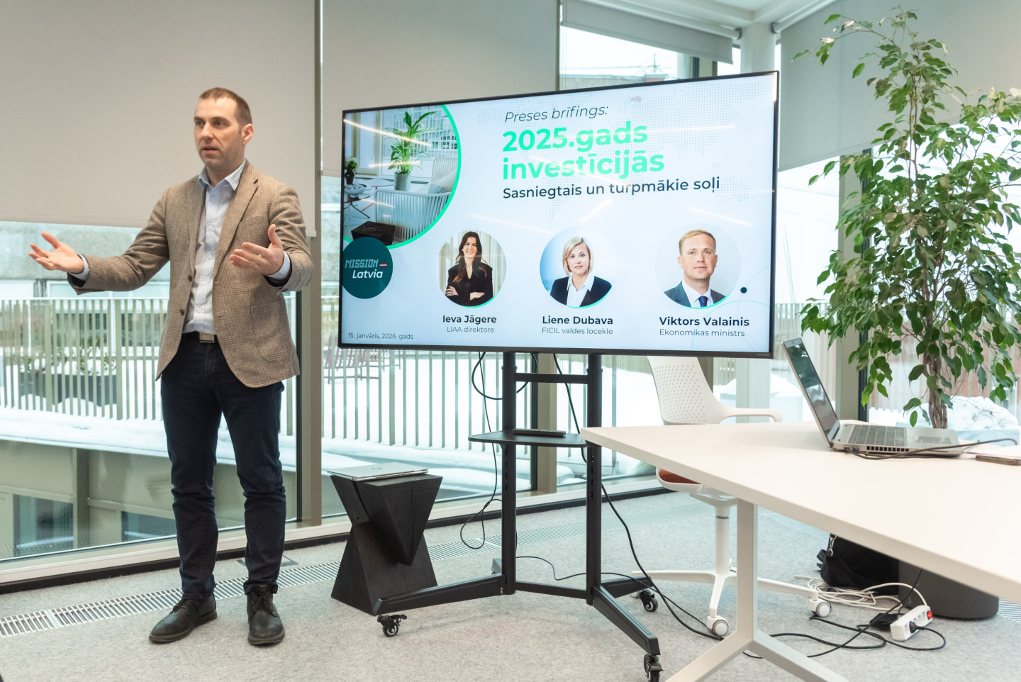 Latvijas Investīciju un attīstības aģentūra un Ekonomikas ministrija rīko preses brīfingu, kurā tiek paziņoti LIAA 2025. gada investīciju piesaistes rezultāti. ekonomikas ministrs Viktors Valainis, Latvijas Investīciju un attīstības aģentūras direktore Ieva Jāgere un Ārvalstu investoru padomes valdes locekle, FICIL un "Nasdaq Rīga" valdes locekle Liene Dubava
