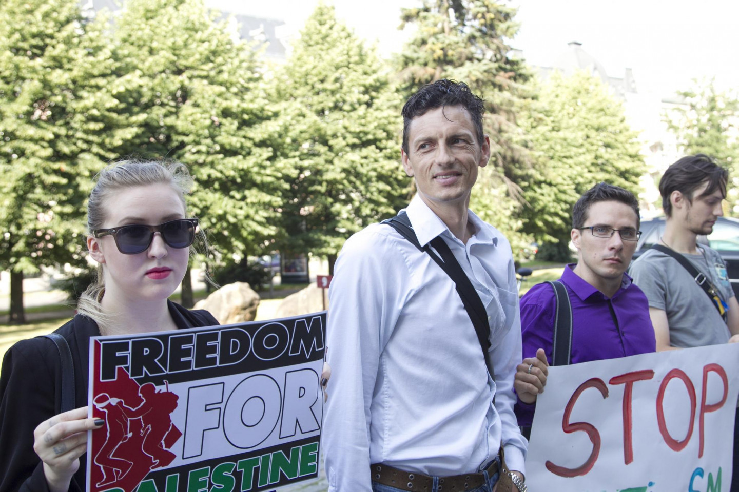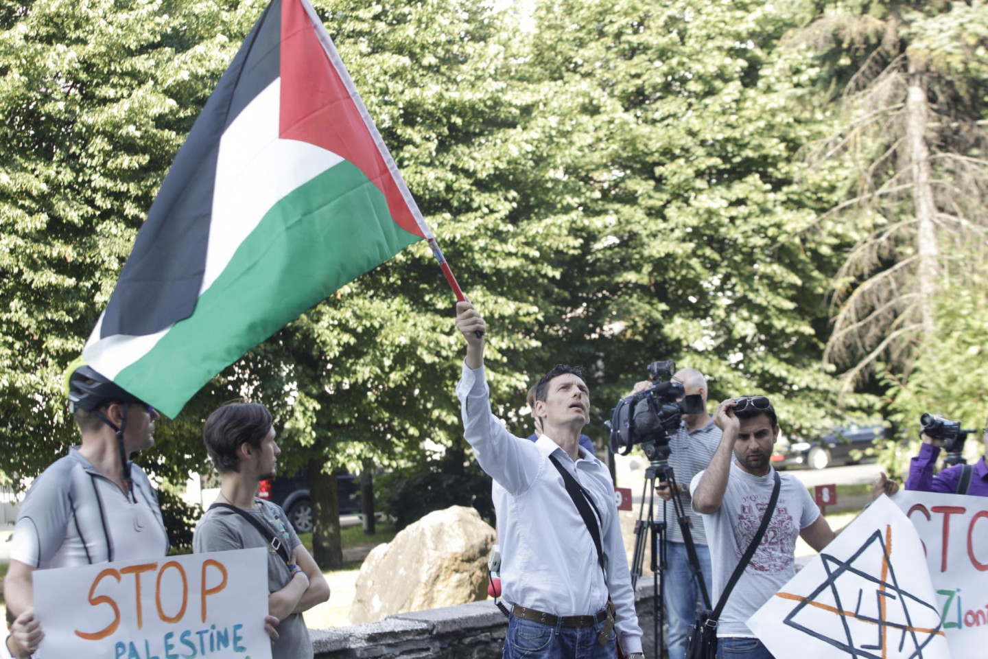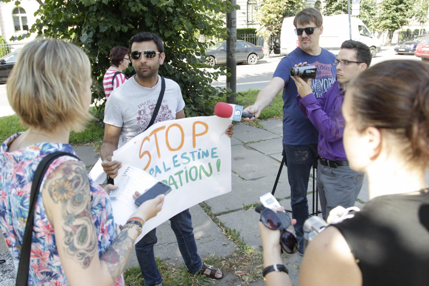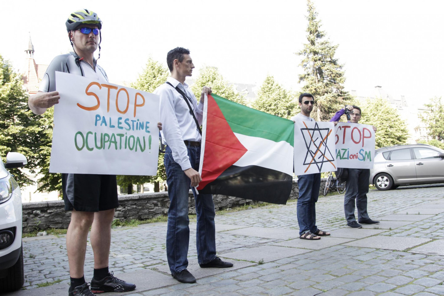 Aktīvista Roberta Klimoviča rīkotajā mītiņā pret militārajām sadursmēm Gazas joslā pie Izraēlas vēstniecības šovakar kopumā bija pulcējušies septiņi cilvēki,