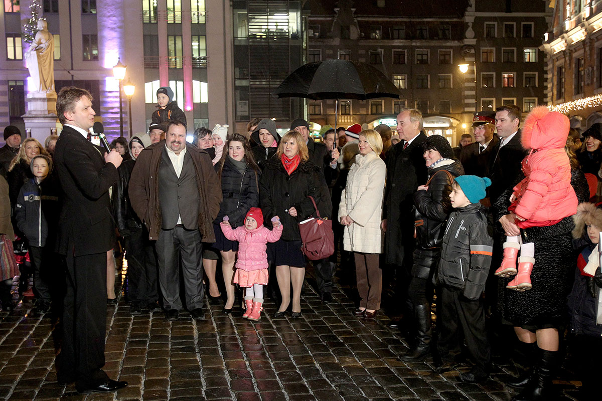 Valsts prezidents Andris Bērziņš kopā ar vairākām Latvijas ģimenēm šodien piedalījās svinīgajā Ziemassvētku egles iedegšanā Rātslaukumā. Kopā ar prezidentu Ziemassvētku egli aicinātas iedegt 20 ģimenes no Latvijas pilsētām un novadiem.