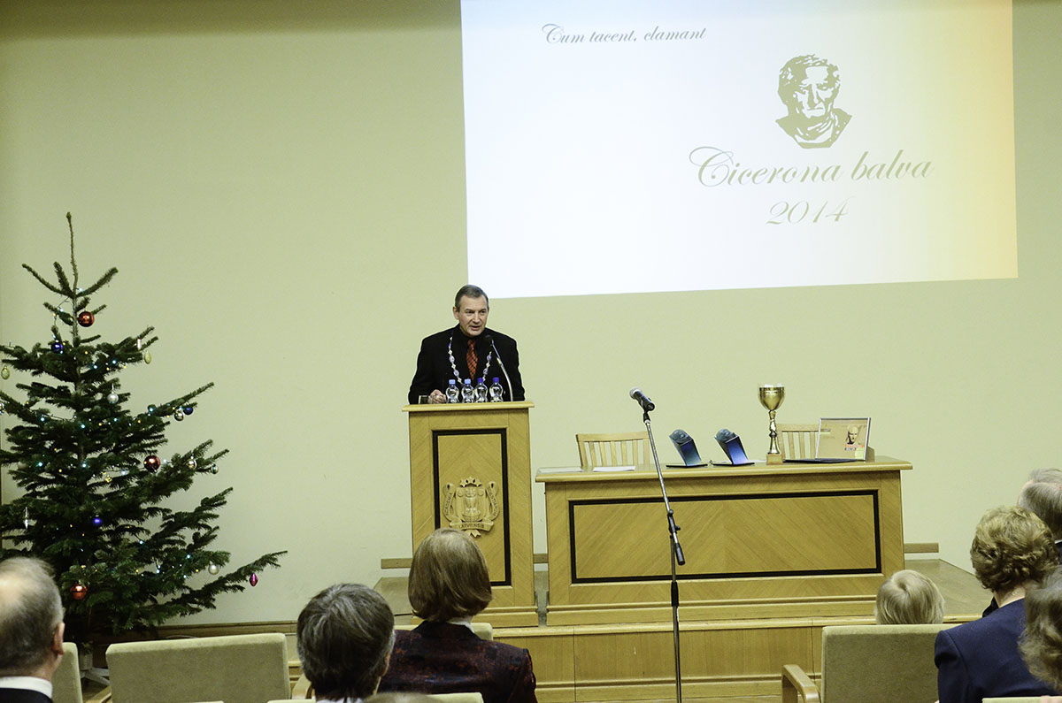 Sabiedrības cieņas balva "Cicerons" šogad piešķirta augstākās izglītības un zinātnes jomas pārstāvjiem - Latvijas Organiskās sintēzes institūta direktoram Ivaram Kalviņam un Latvijas Universitātes (LU) rektoram Mārcim Auziņam, bet antibalvu jeb Mērfija balvu šogad, konkurējot ar aptuveni 20 citiem pretendentiem, izpelnījusies Veselības ministrija.