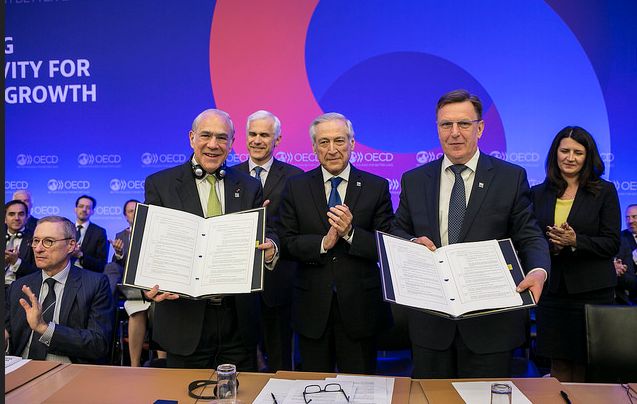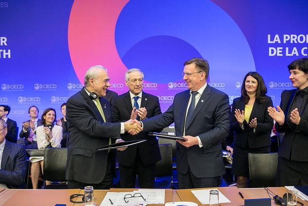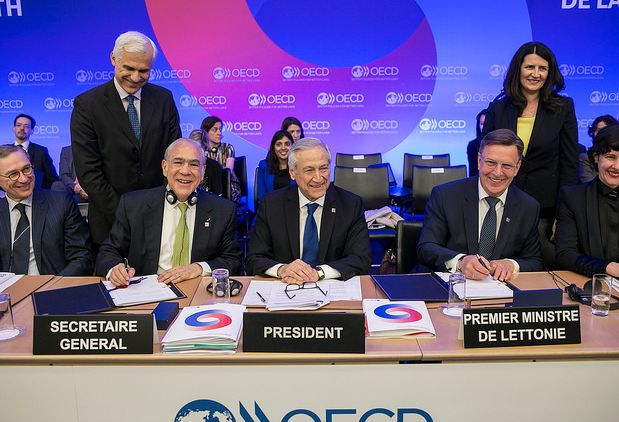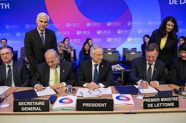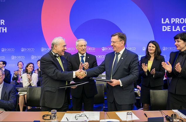 Ministru prezidents Māris Kučinskis (ZZS) un Ekonomiskās sadarbības un attīstības organizācijas (OECD) ģenerālsekretārs Anhels Gurija šodien Parīzē parakstīja līgumu par Latvijas pievienošanos OECD. Paredzēts, ka pēc līguma parakstīšanas un tā ratifikācijas Latvijas Saeimā valsts oficiāli kļūs par 35.organizācijas dalībvalsti. Saeima par līguma ratifikāciju varētu lemt 16.jūnijā.