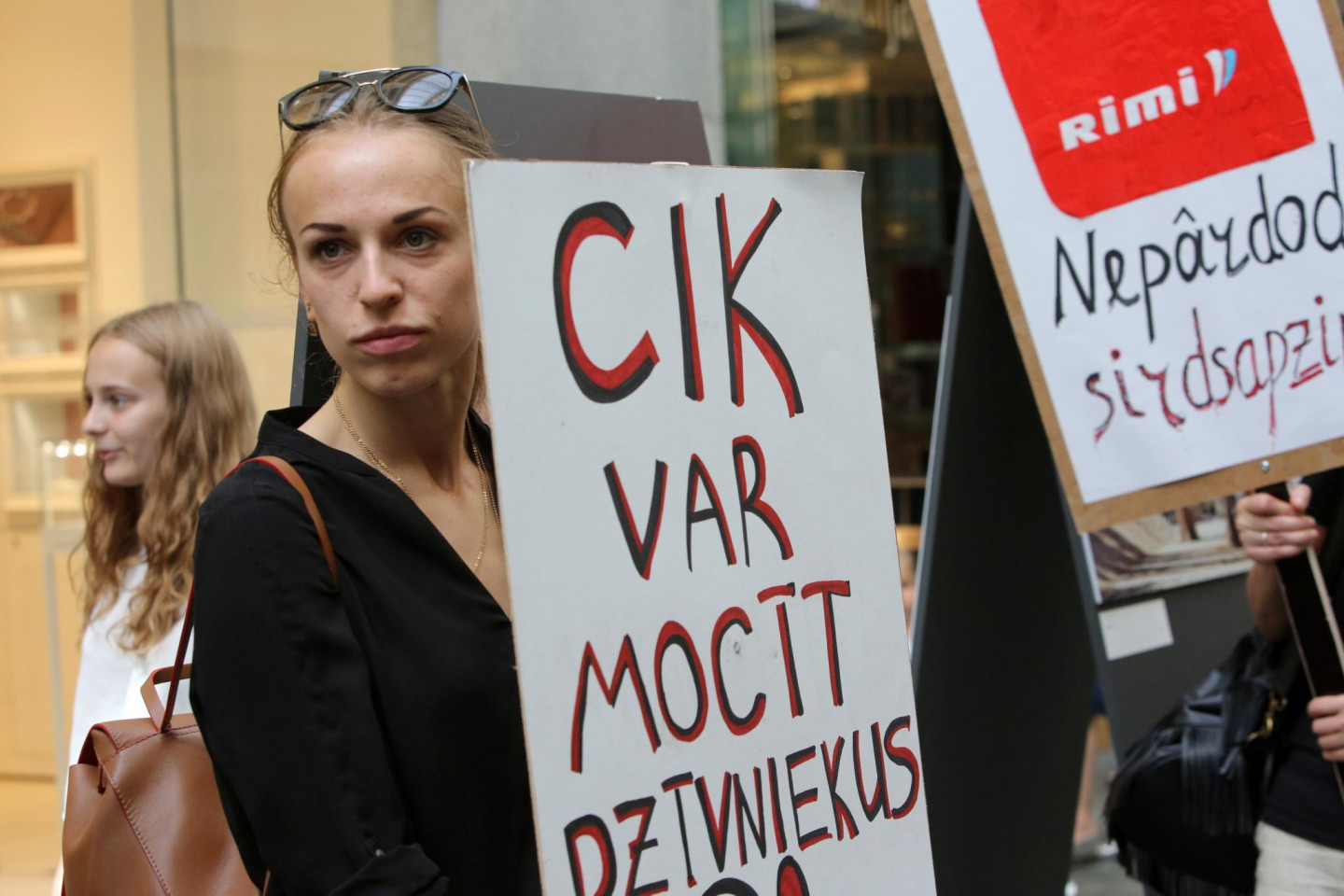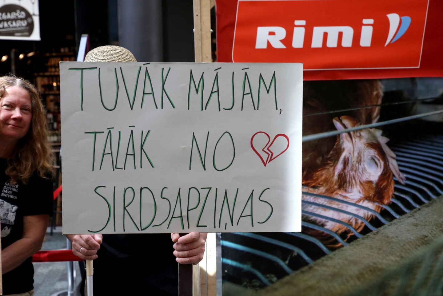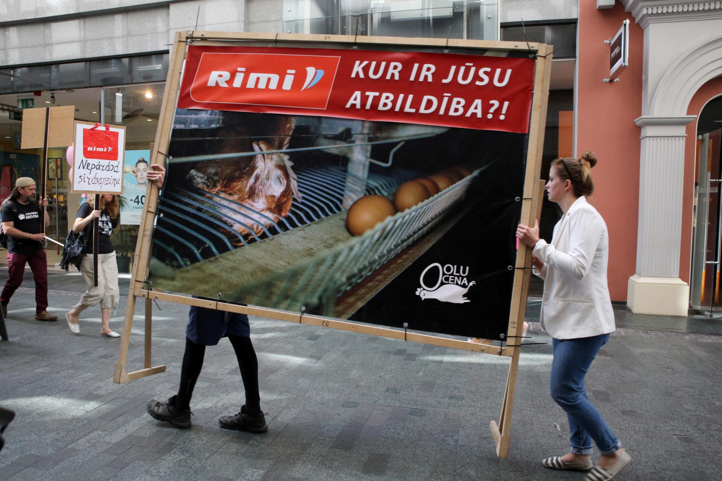 Biedrība "Dzīvnieku brīvība" šodien rīkoja piketu pie "Rimi Galerija Centrs" Rīgā , lai aicinātu tirgotāju apņemties līdz 2025.gadam pilnībā atteikties no sprostos turētu vistu olu tirdzniecības.