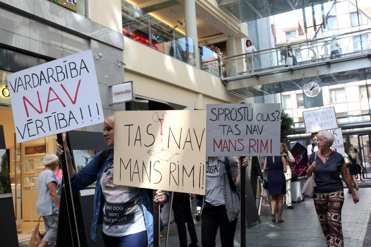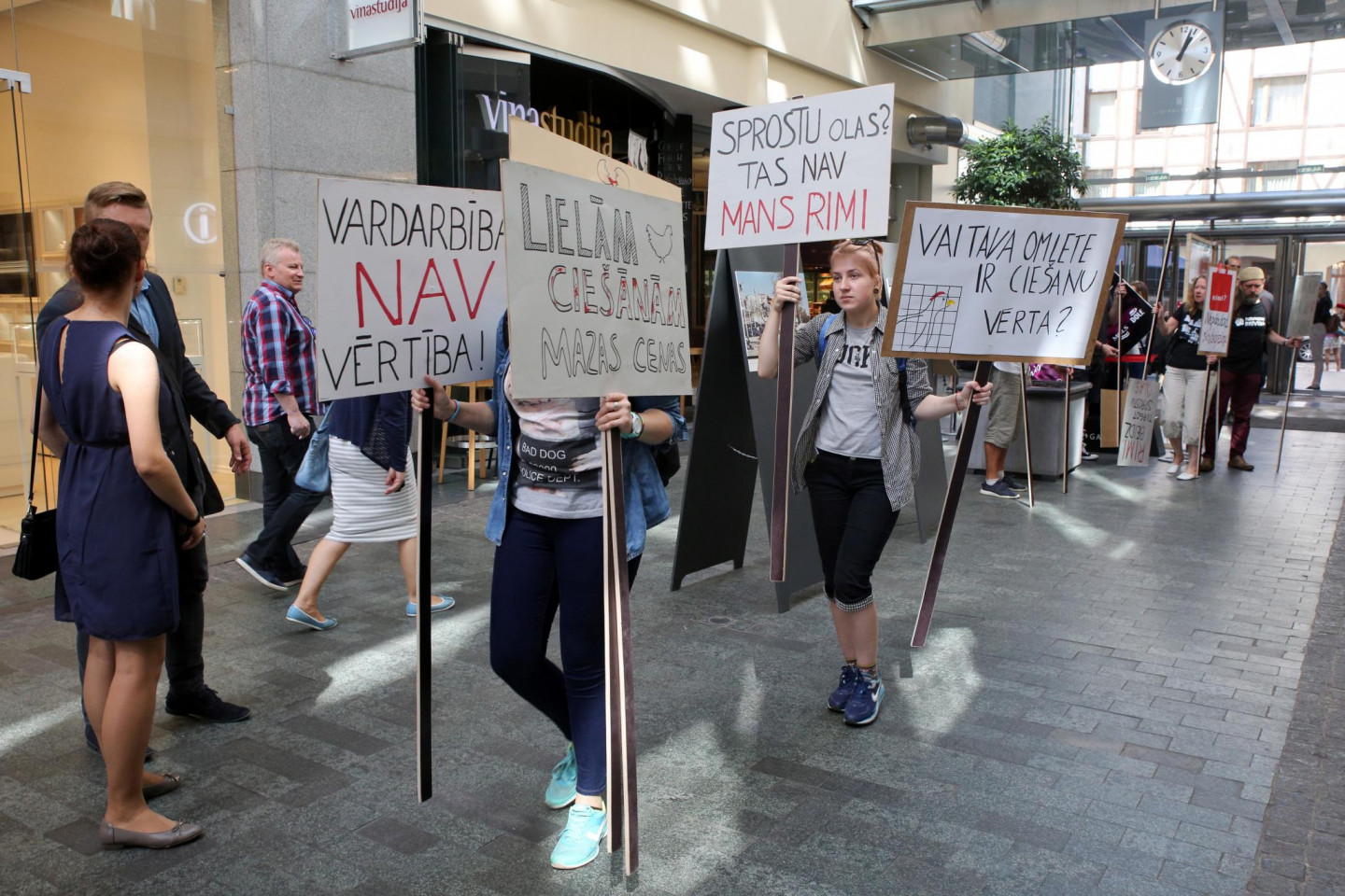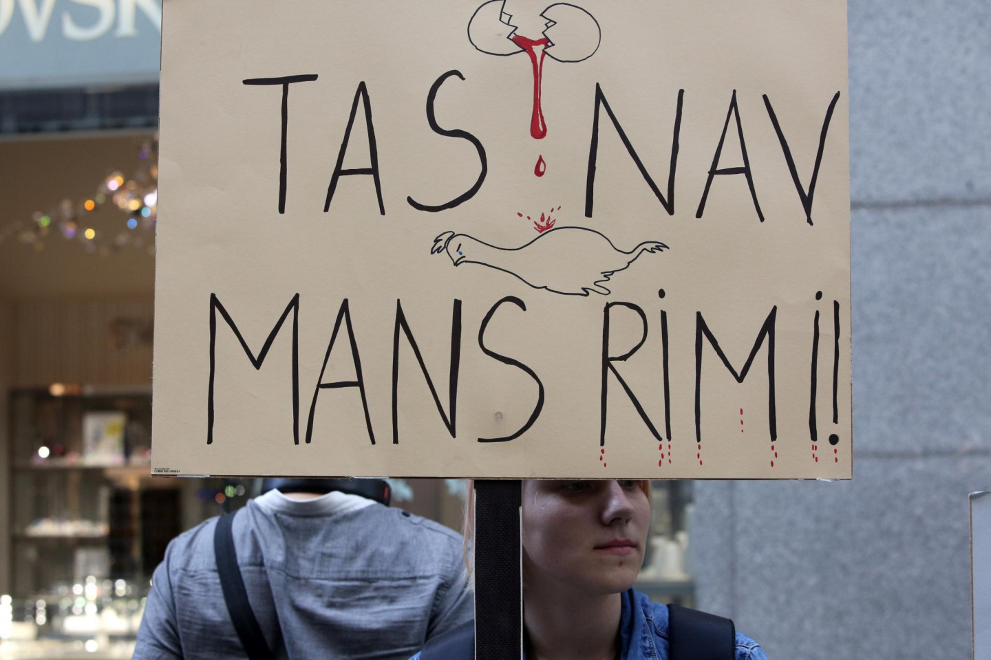 Biedrība "Dzīvnieku brīvība" šodien rīkoja piketu pie "Rimi Galerija Centrs" Rīgā , lai aicinātu tirgotāju apņemties līdz 2025.gadam pilnībā atteikties no sprostos turētu vistu olu tirdzniecības.