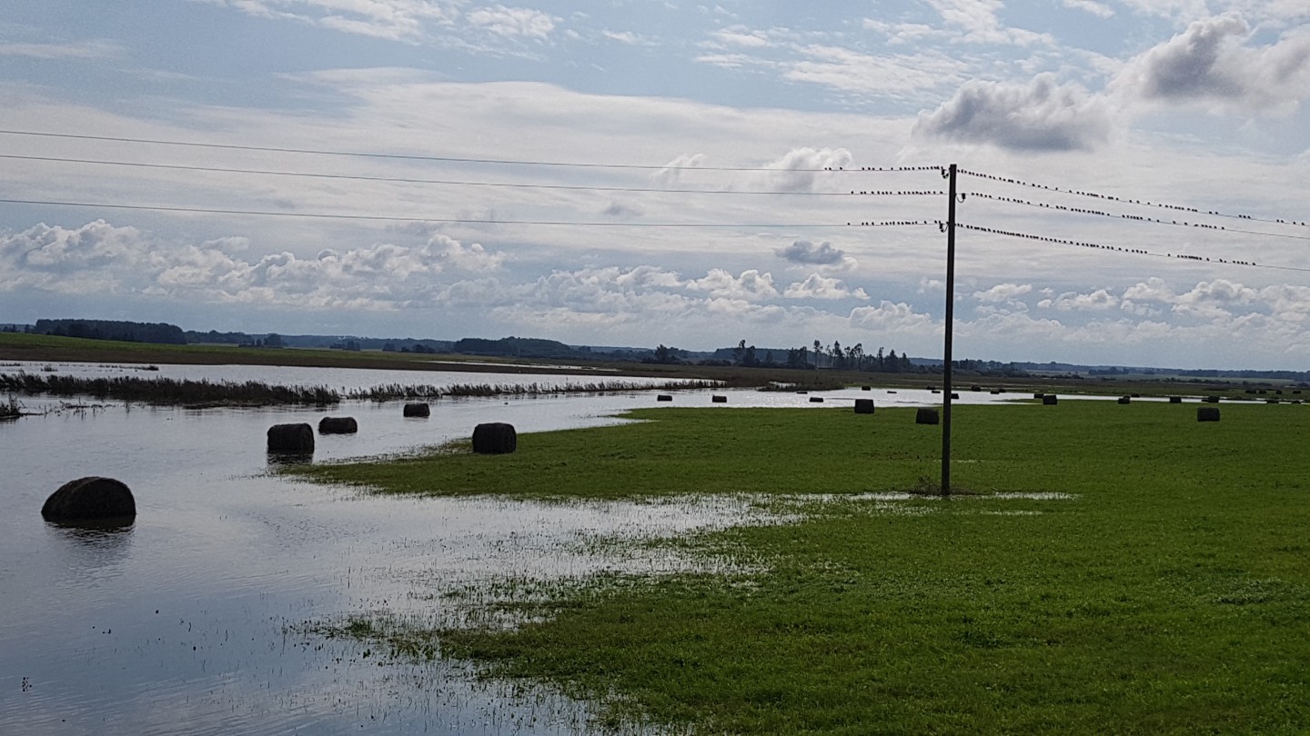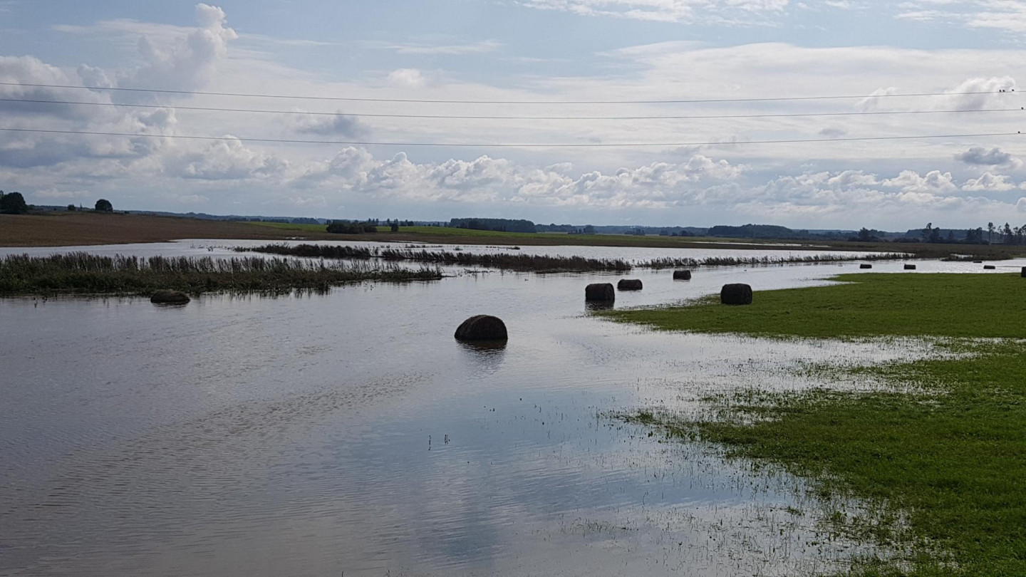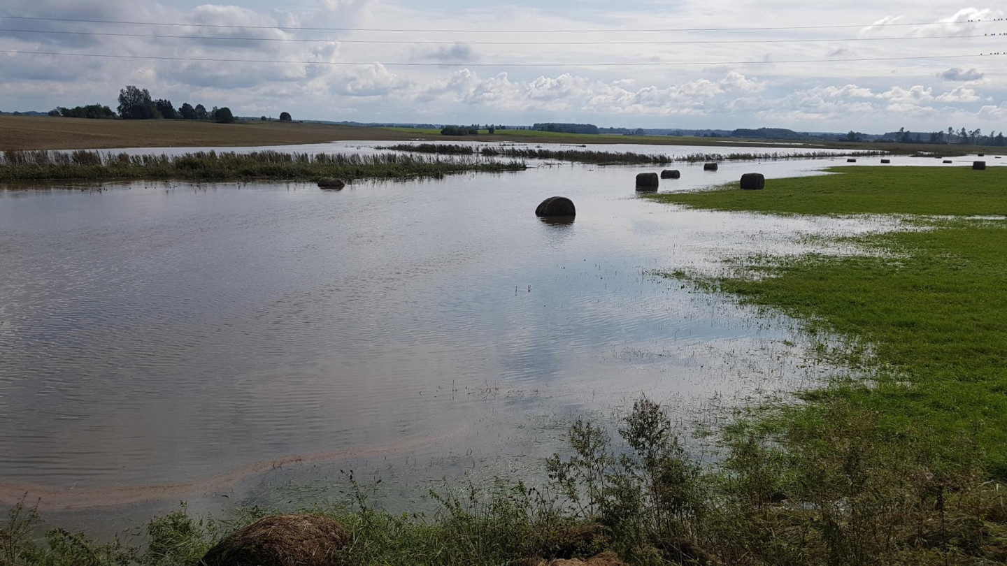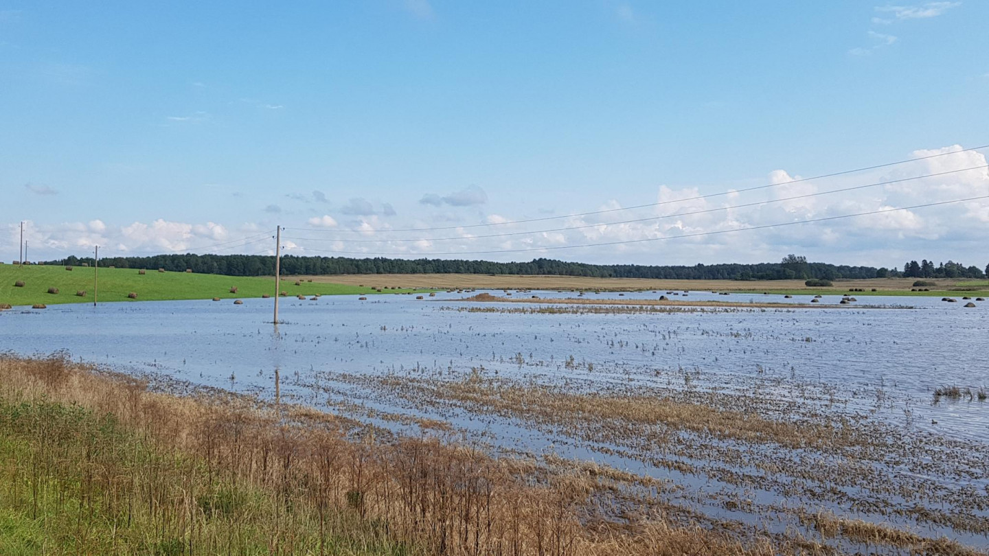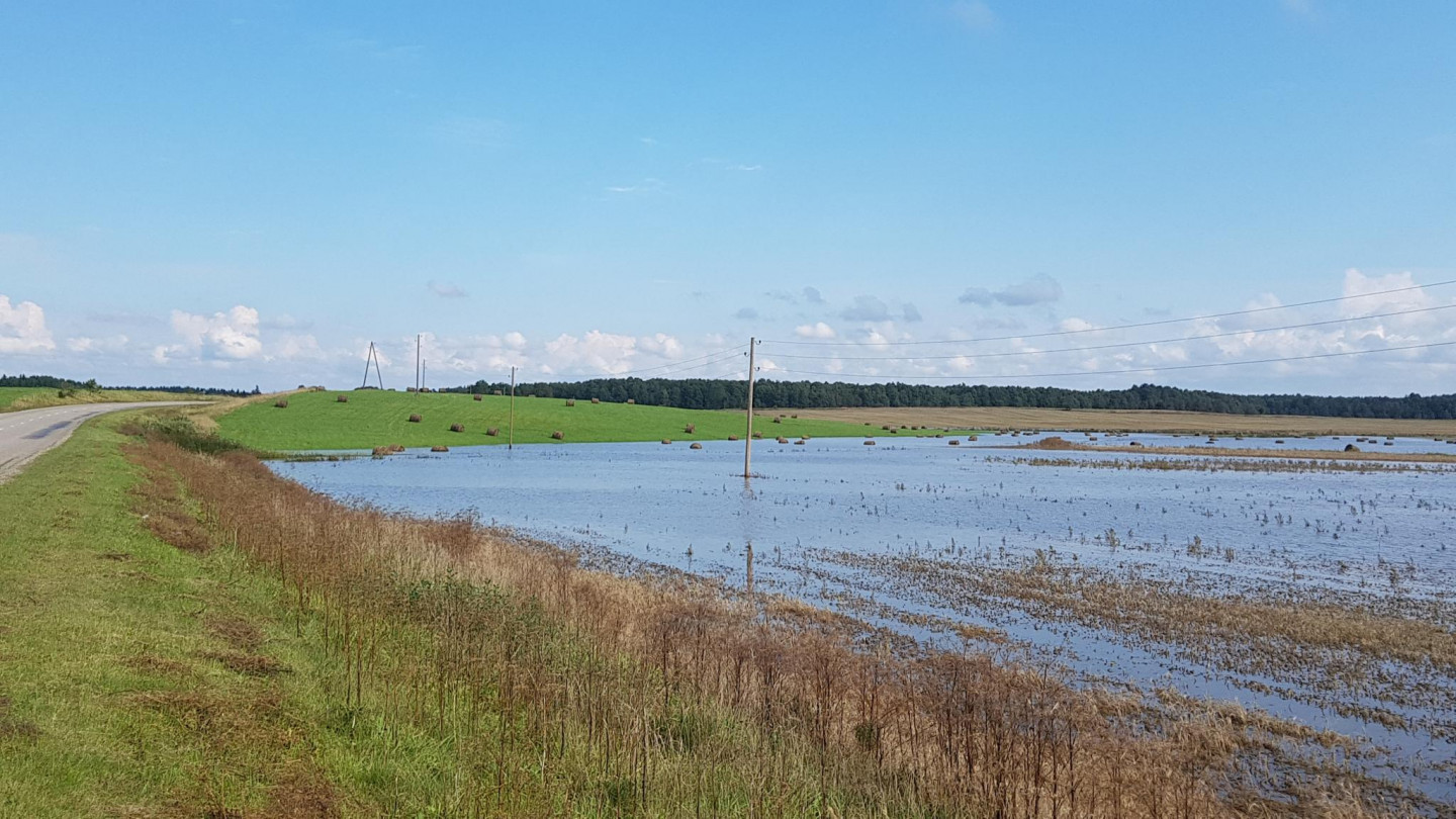Jau aizvadītās nedēļas nogalē stipro lietavu dēļ applūduši lauki Kurzemē. Arī šodien situācija nav īpaši mainījusies un daudzviet pļavas pārvērtušās par ūdenstilpnēm.