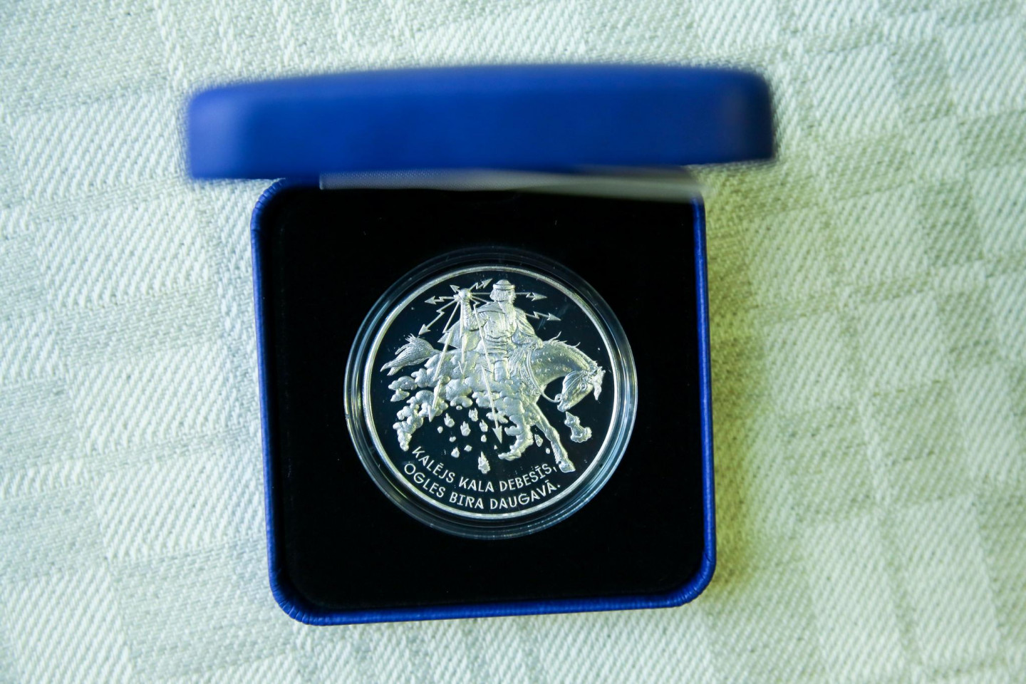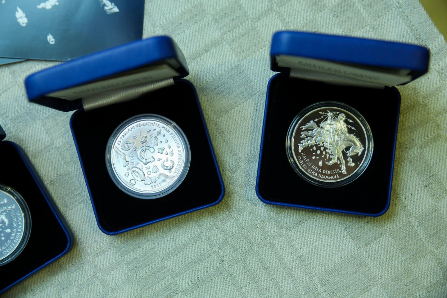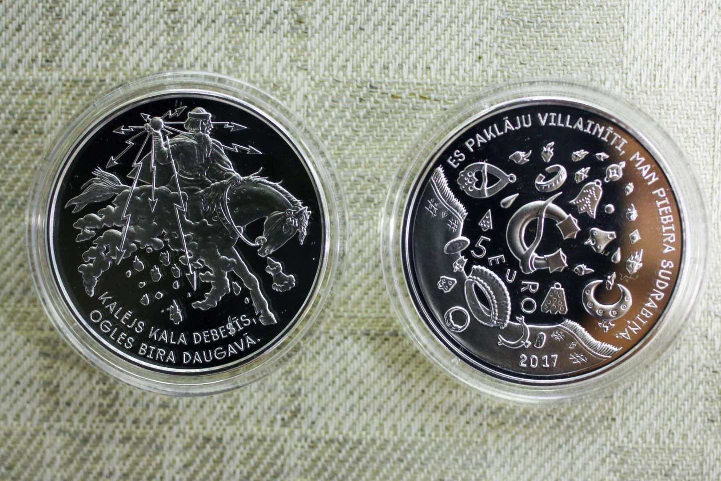 Latvijas banka prezentējusi tautasdziesmām veltītu piecu eiro sudraba kolekcijas monētu "Kalējs kala debesīs" Pasākumā piedalījās Latvijas Nacionālās bibliotēkas Attīstības departamenta direktors Uldis Zariņš, Latvijas Universitātes Humanitāro zinātņu fakultātes profesore Janīna Kursīte-Pakule, monētas grafiskā dizaina autors Edgars Folks un Latvijas Bankas monētu dizaina komisijas priekšsēdētāja vietnieks Laimonis Šēnbergs.