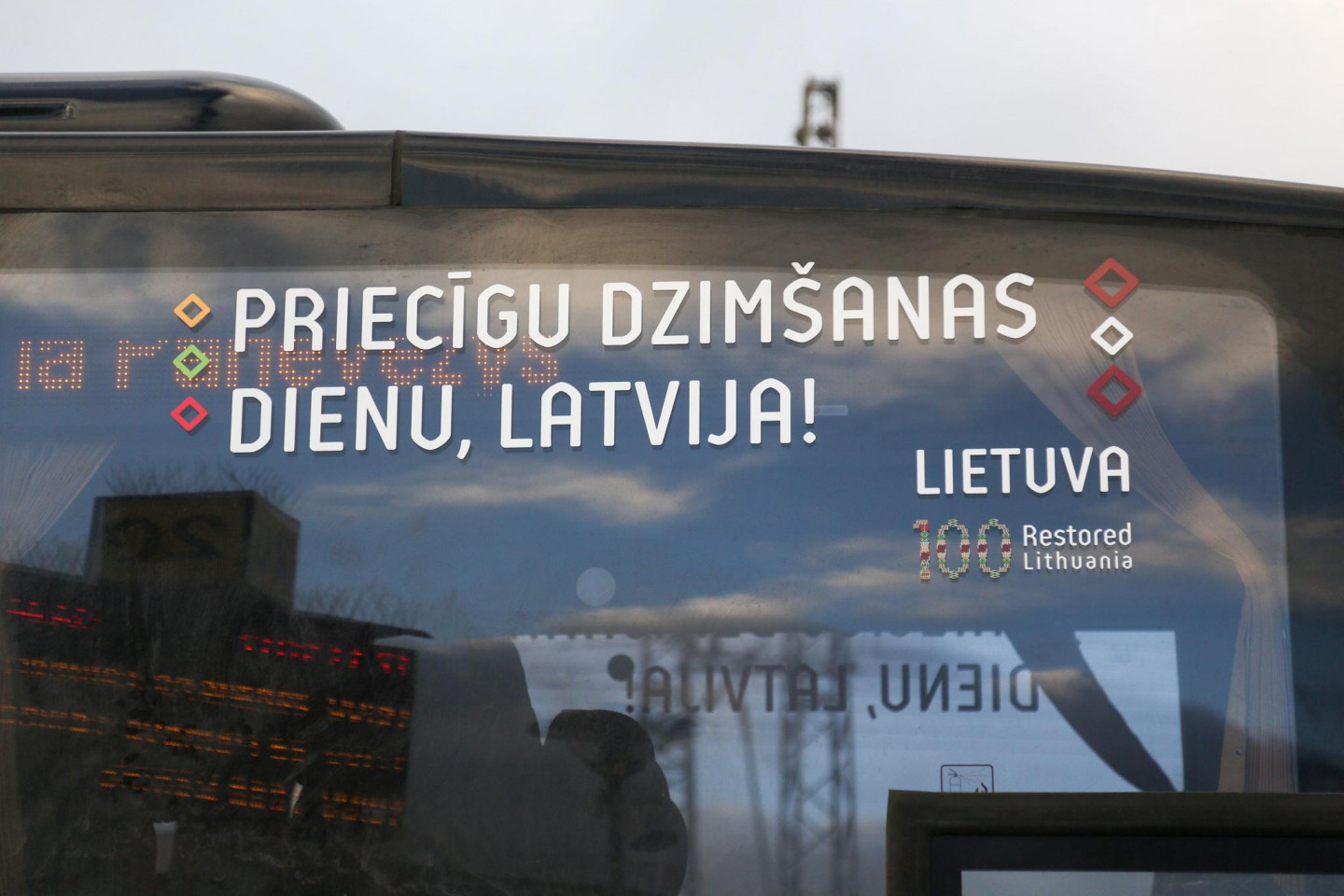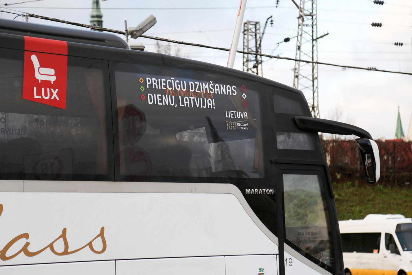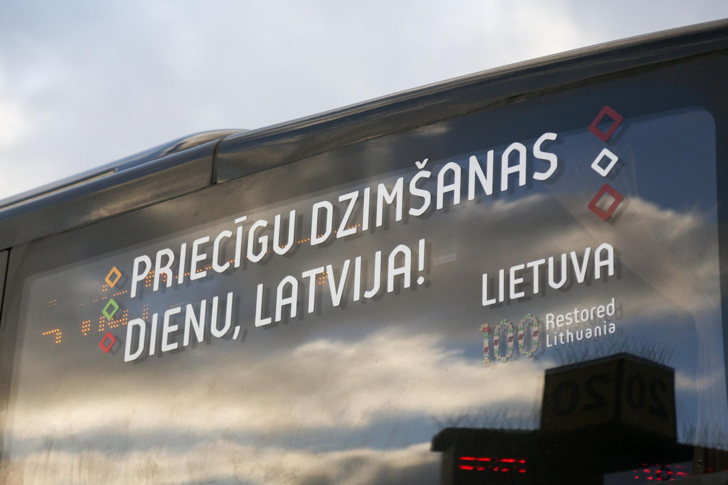 Sagaidot Latvijas Republikas proklamēšanas dienu, Lietuva šogad sūta Latvijai īpašu apsveikumu, kas latviešu valodā lasāms uz kompānijas "Eurolines" autobusu sāniem. Ziņu aģentūra LETA vēsta, ka pirmais maršruta autobuss, kura sānu logus rotā vārdi "Priecīgu dzimšanas dienu, Latvija!" un Lietuvas valstiskuma atjaunošanas simtgades programmas logotips, Rīgas autoostā ieradies jau piektdienā.