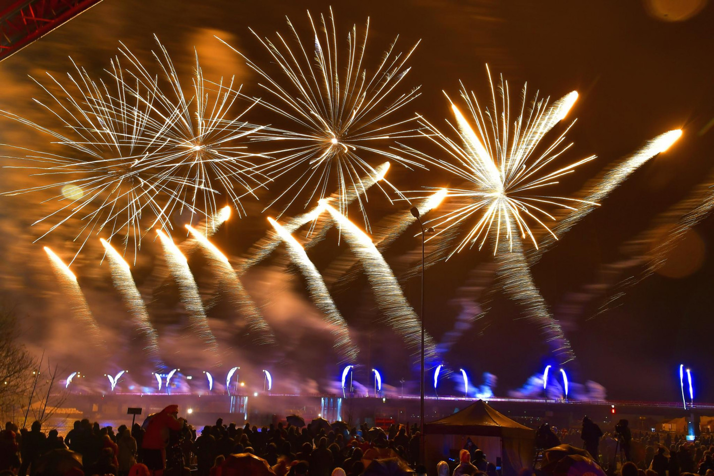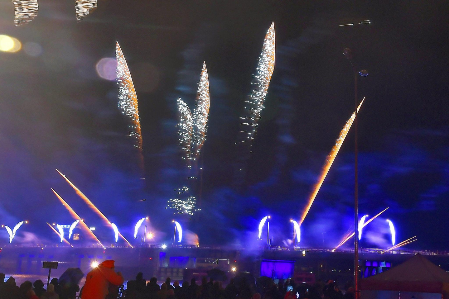 Latvijas 99.dzmšanas dienas svinēšana Ventspilī teātru namā Jūras vārti un Tilta dārzā. Salūts.