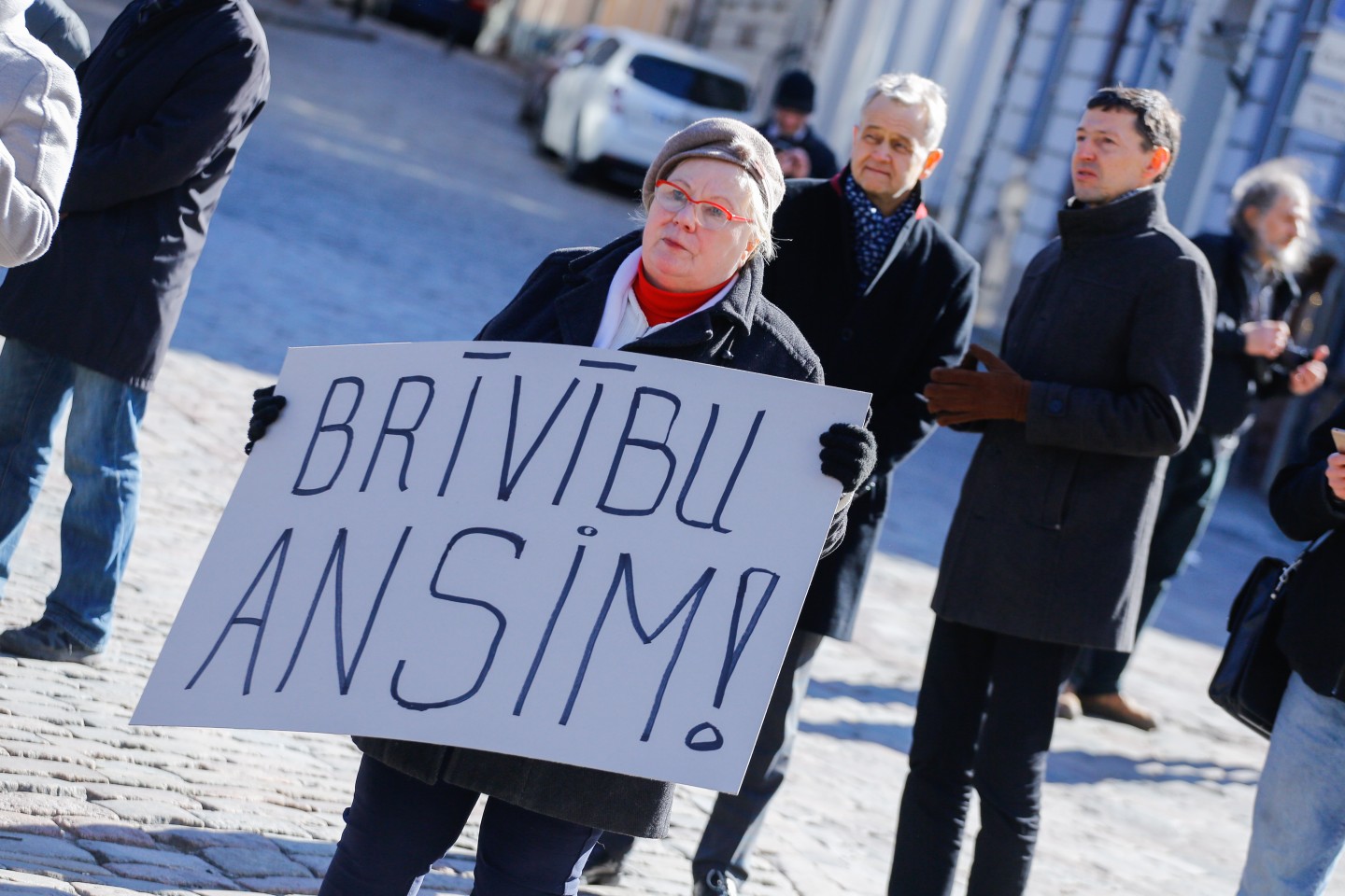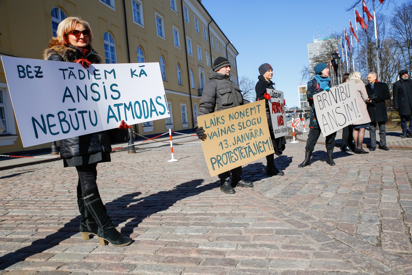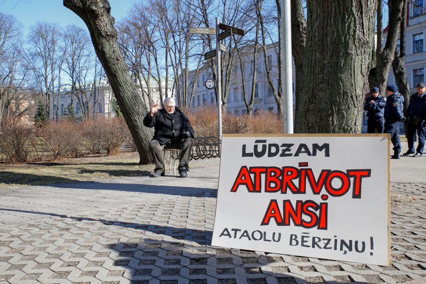 Pie Rīgas pils pasākumā par 13.janvāra Vecrīgas grautiņiem notiesātā Anša Ataola Bērziņa atbrīvošanu piketē 100 cilvēki.
