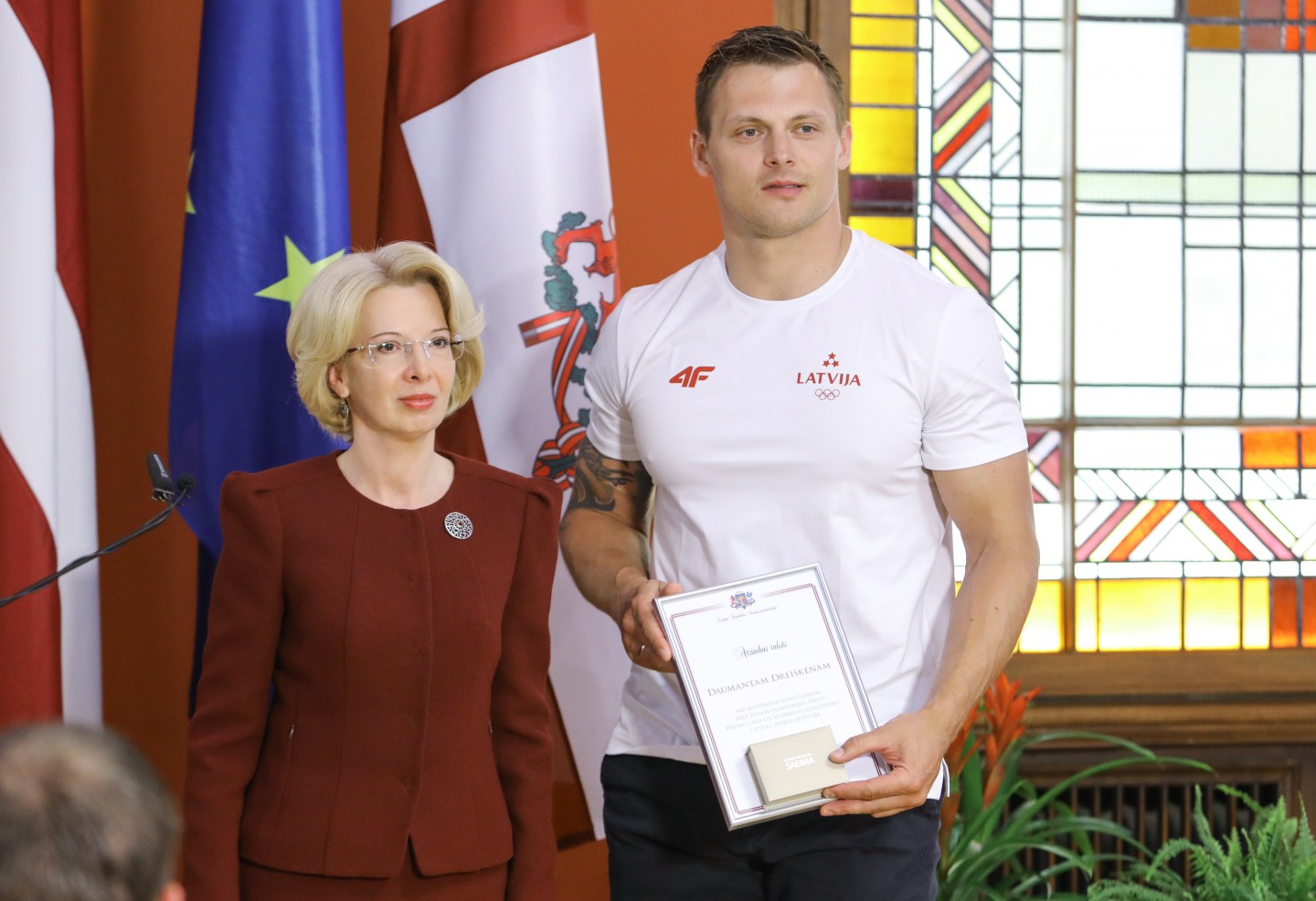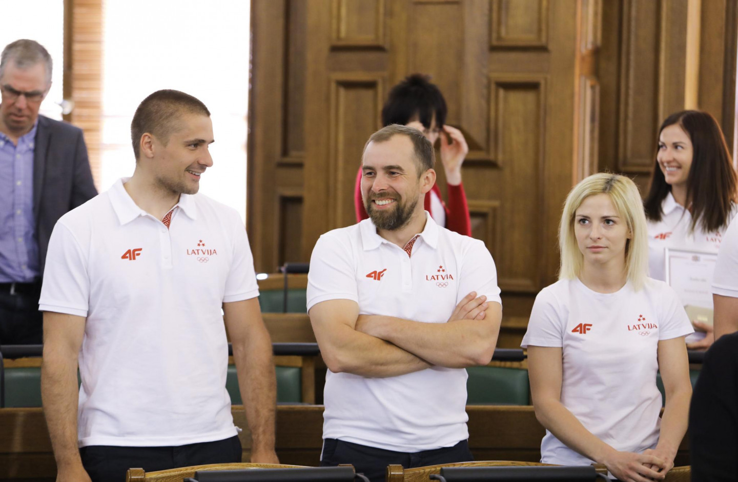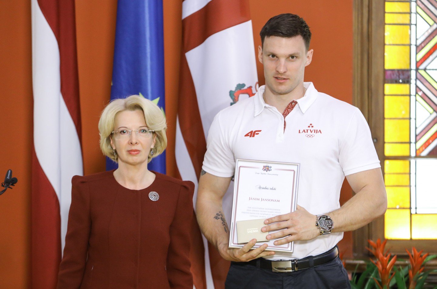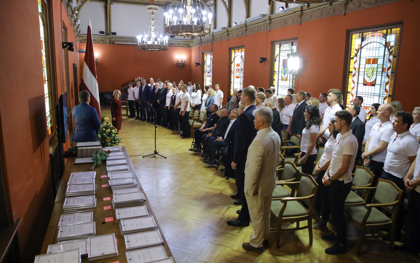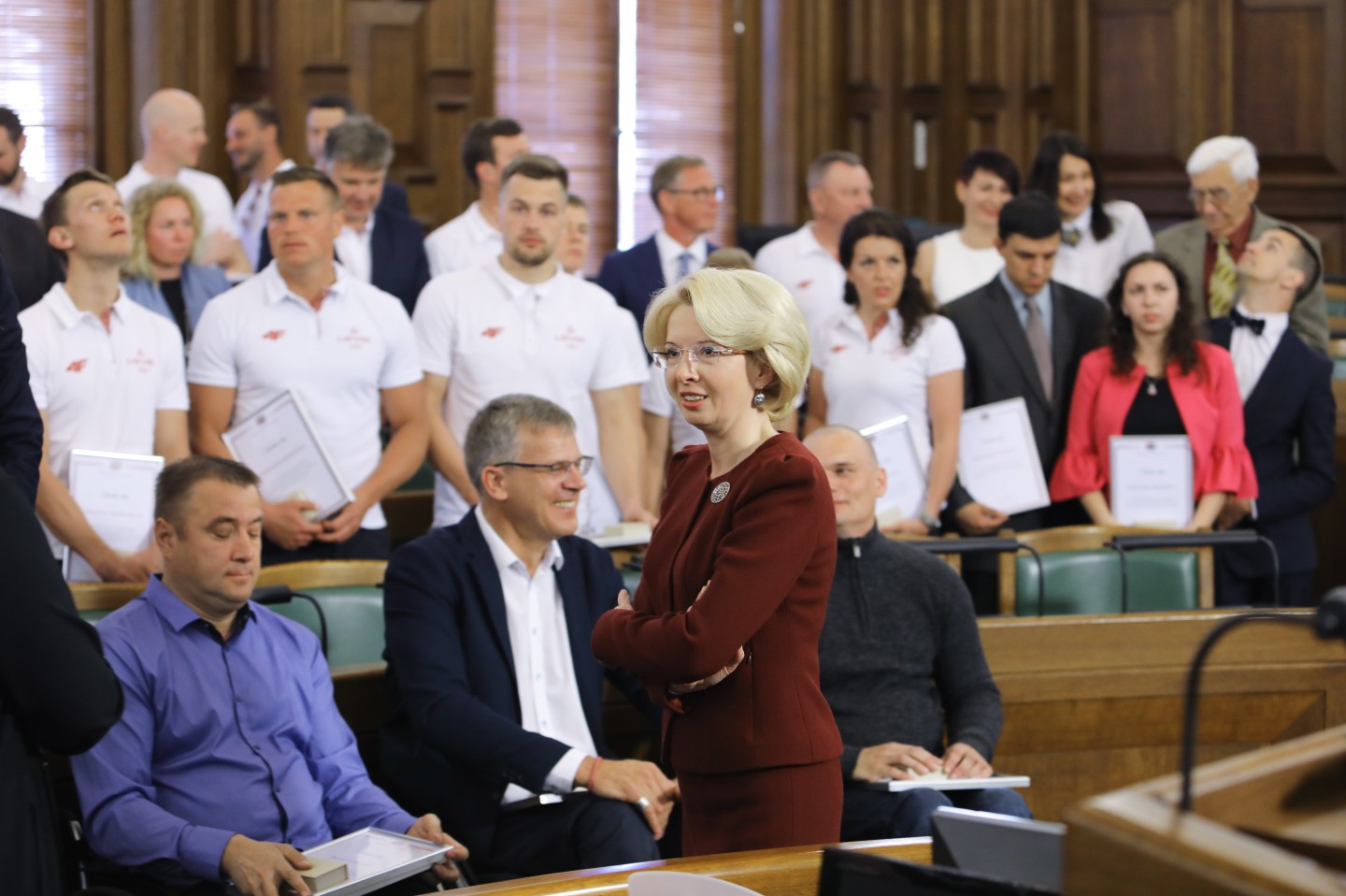 Saeimas nama Sarkanajā zālē Latvijas olimpiešiem un paralimpiešiem, kā arī viņu treneriem un ārstiem tika pasniegti Saeimas priekšsēdētājas atzinības raksti.