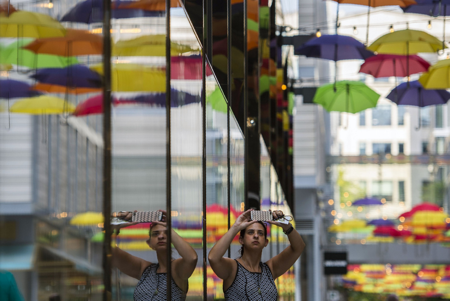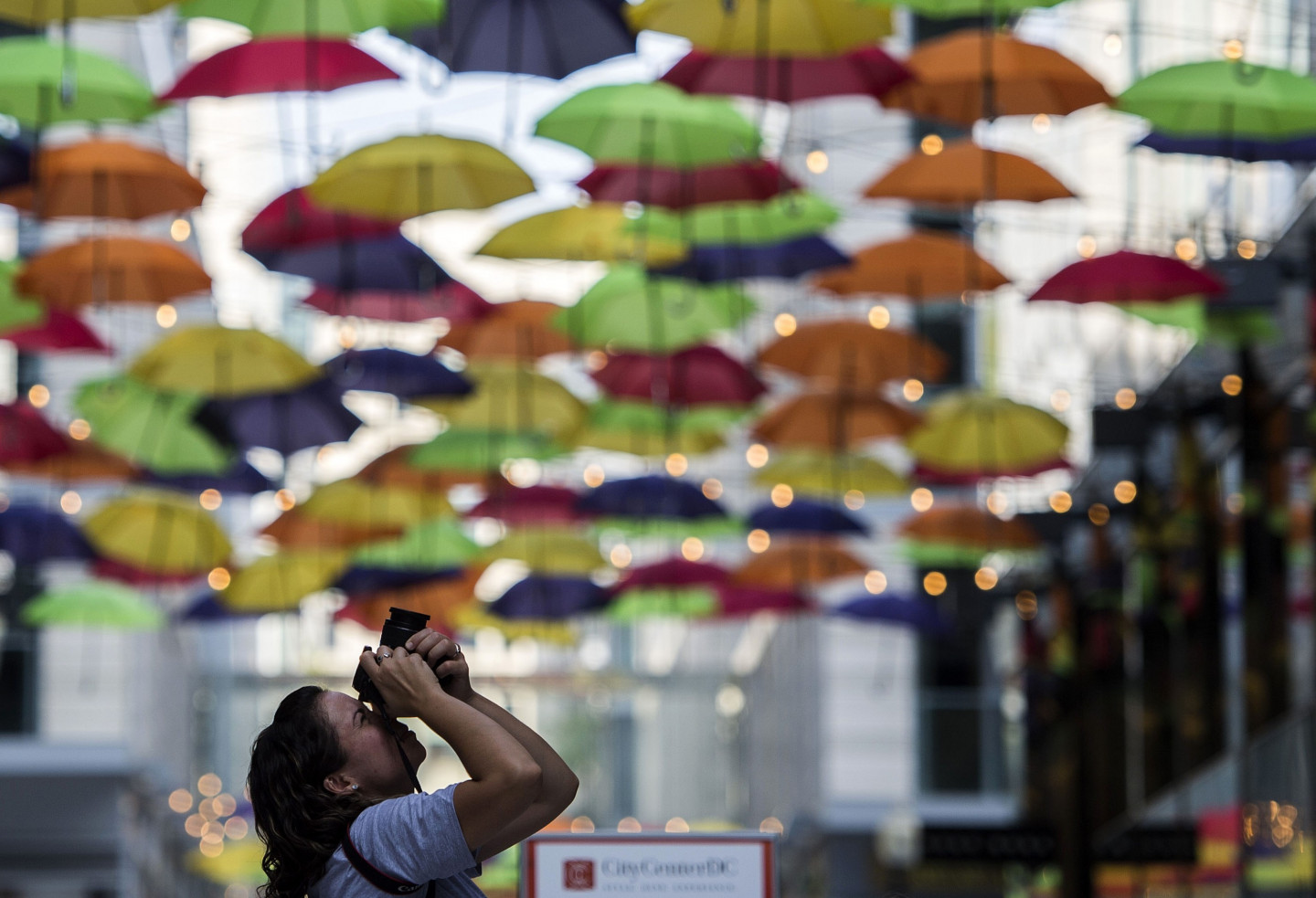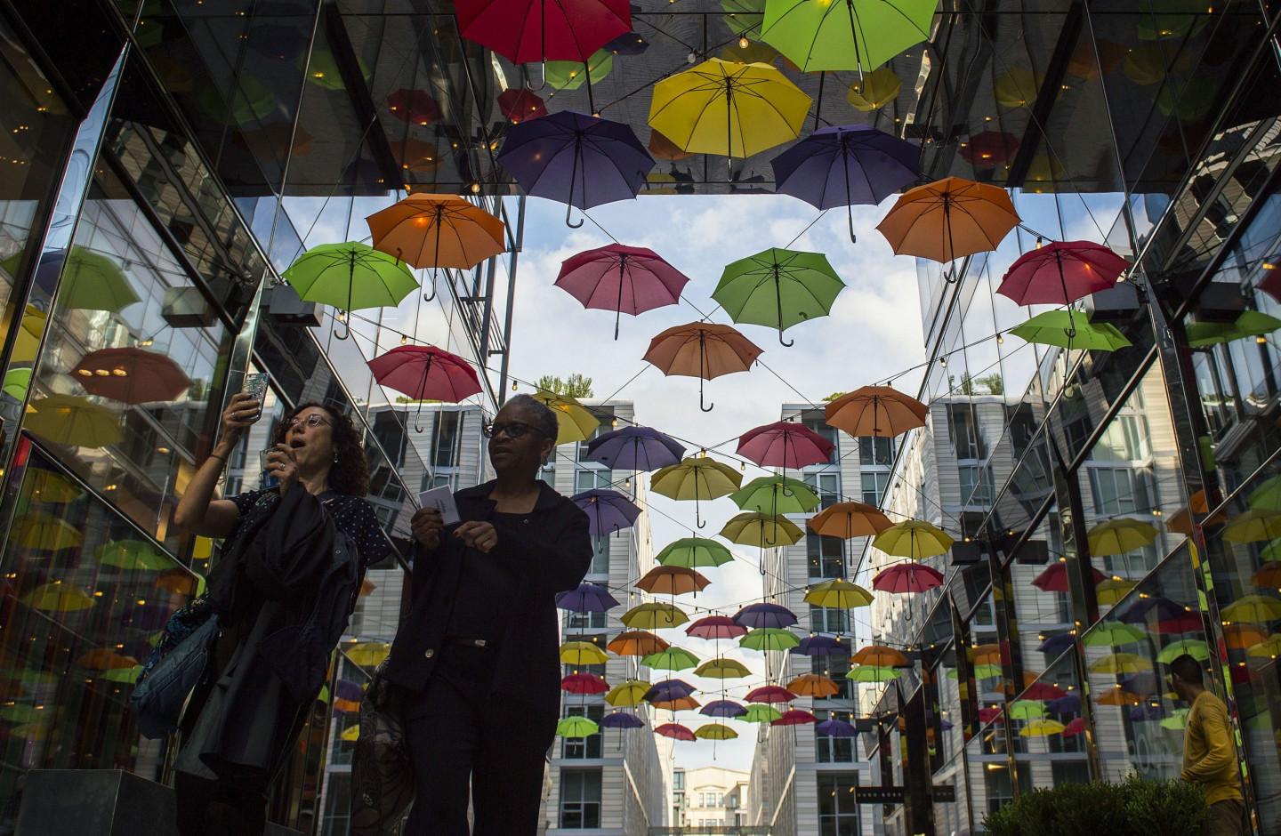 Vašingtonā tapusi neparasta mākslas instalācija- tur virs kādas ielas trosēs gaisā iekārti desmitiem krāsaini lietussargi.