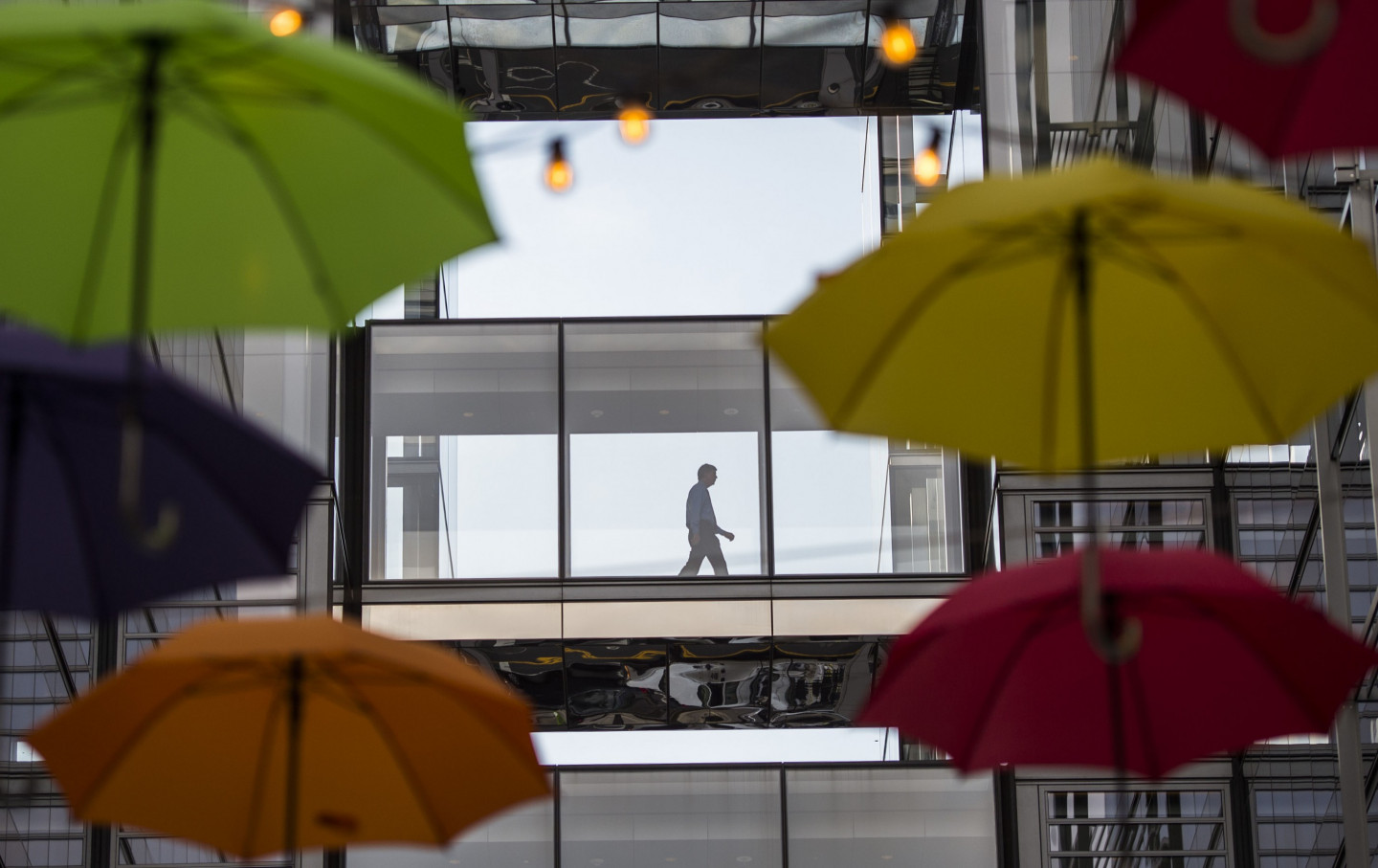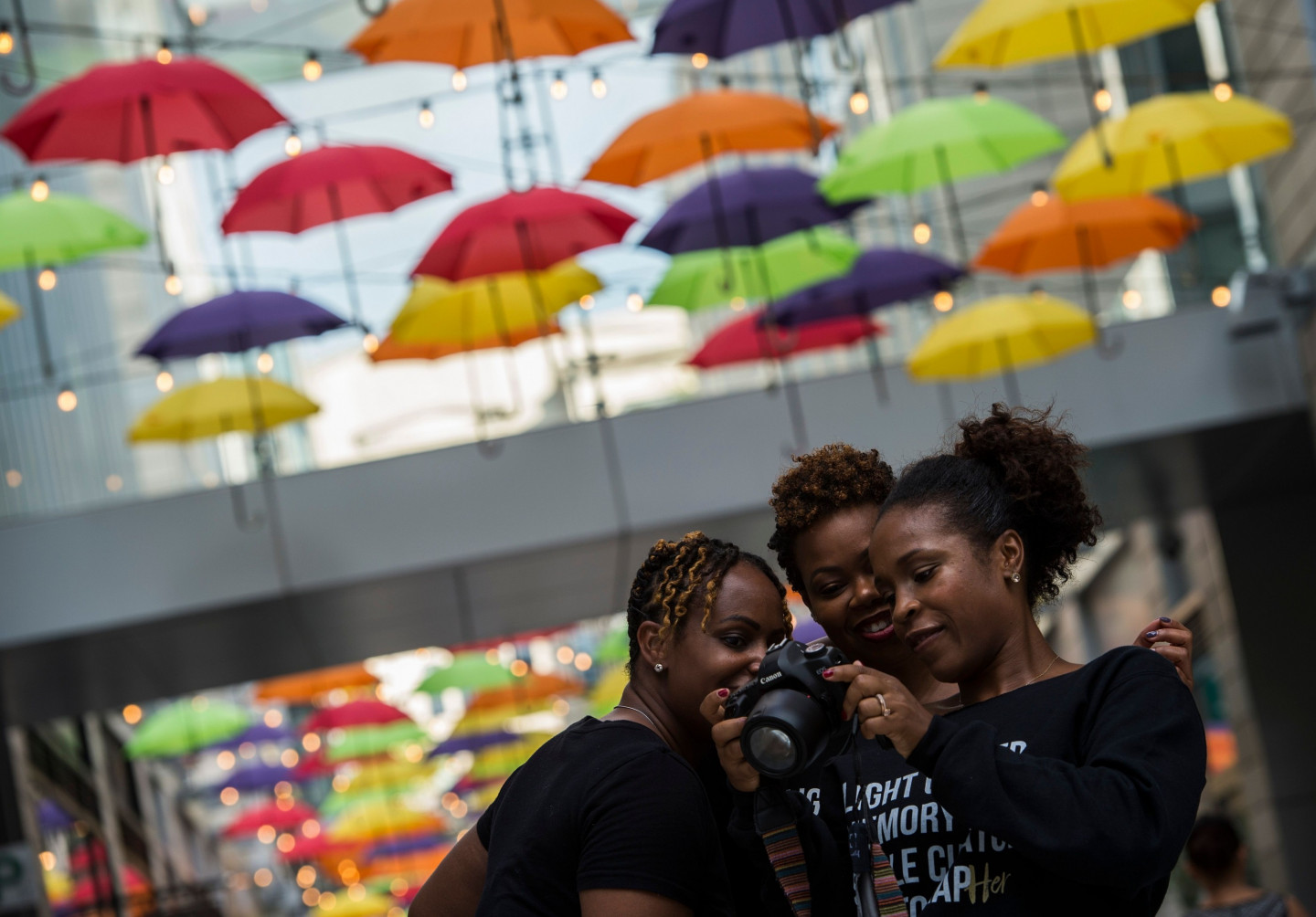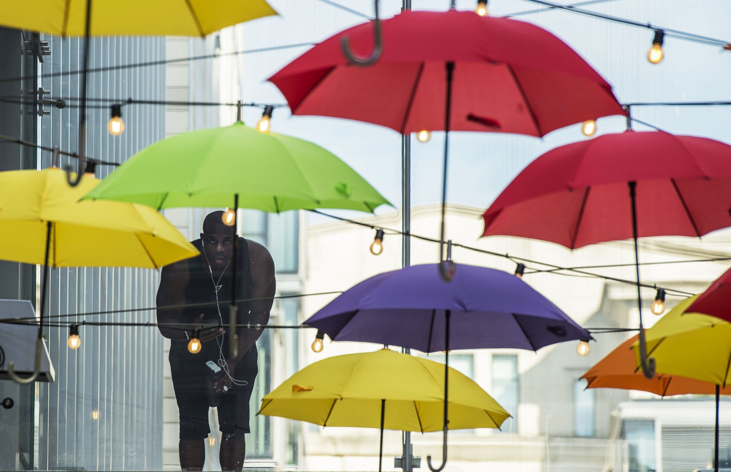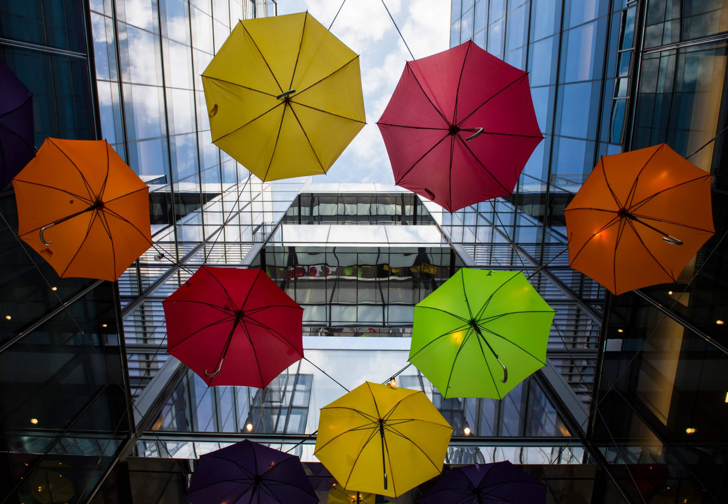 Vašingtonā tapusi neparasta mākslas instalācija- tur virs kādas ielas trosēs gaisā iekārti desmitiem krāsaini lietussargi.