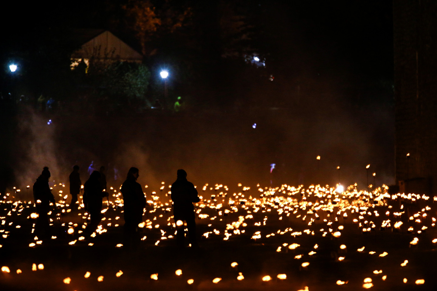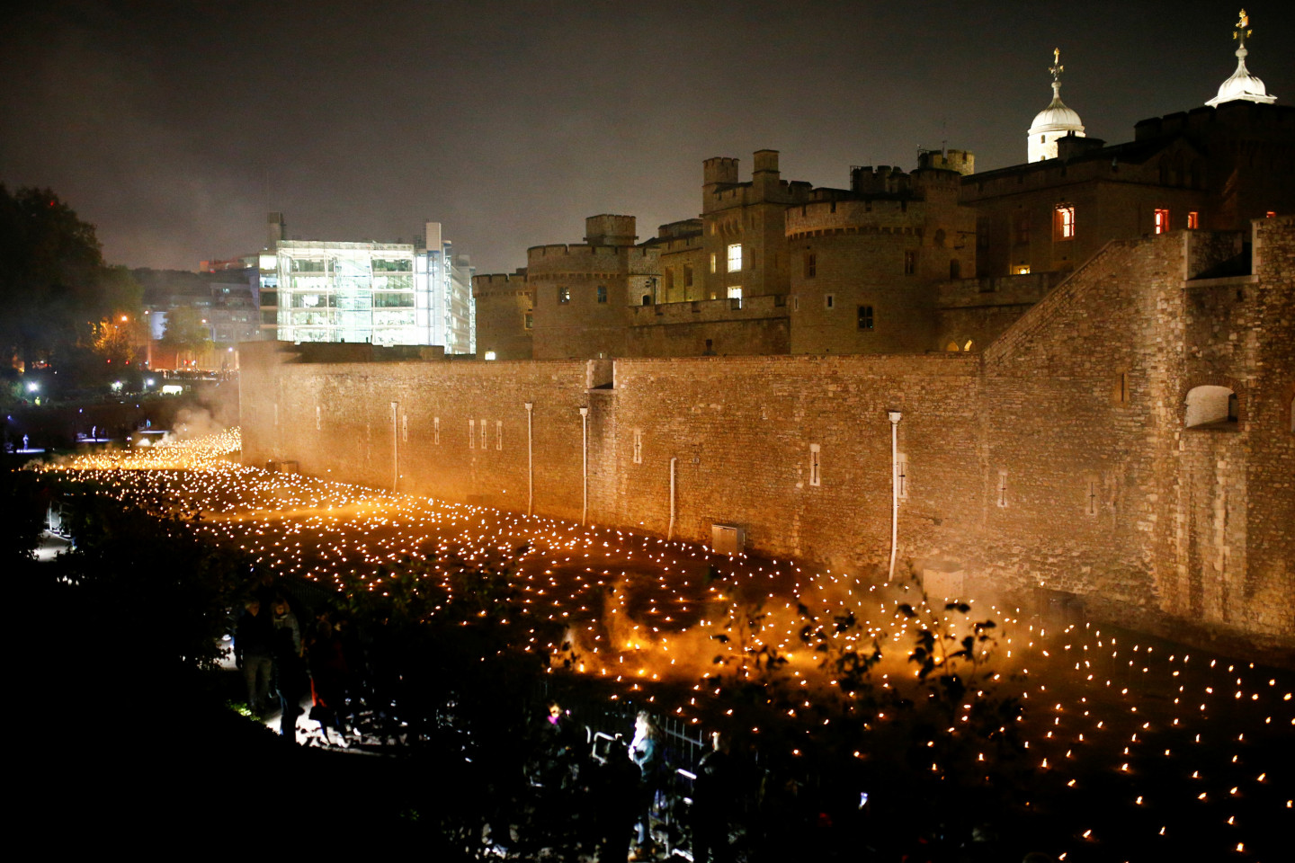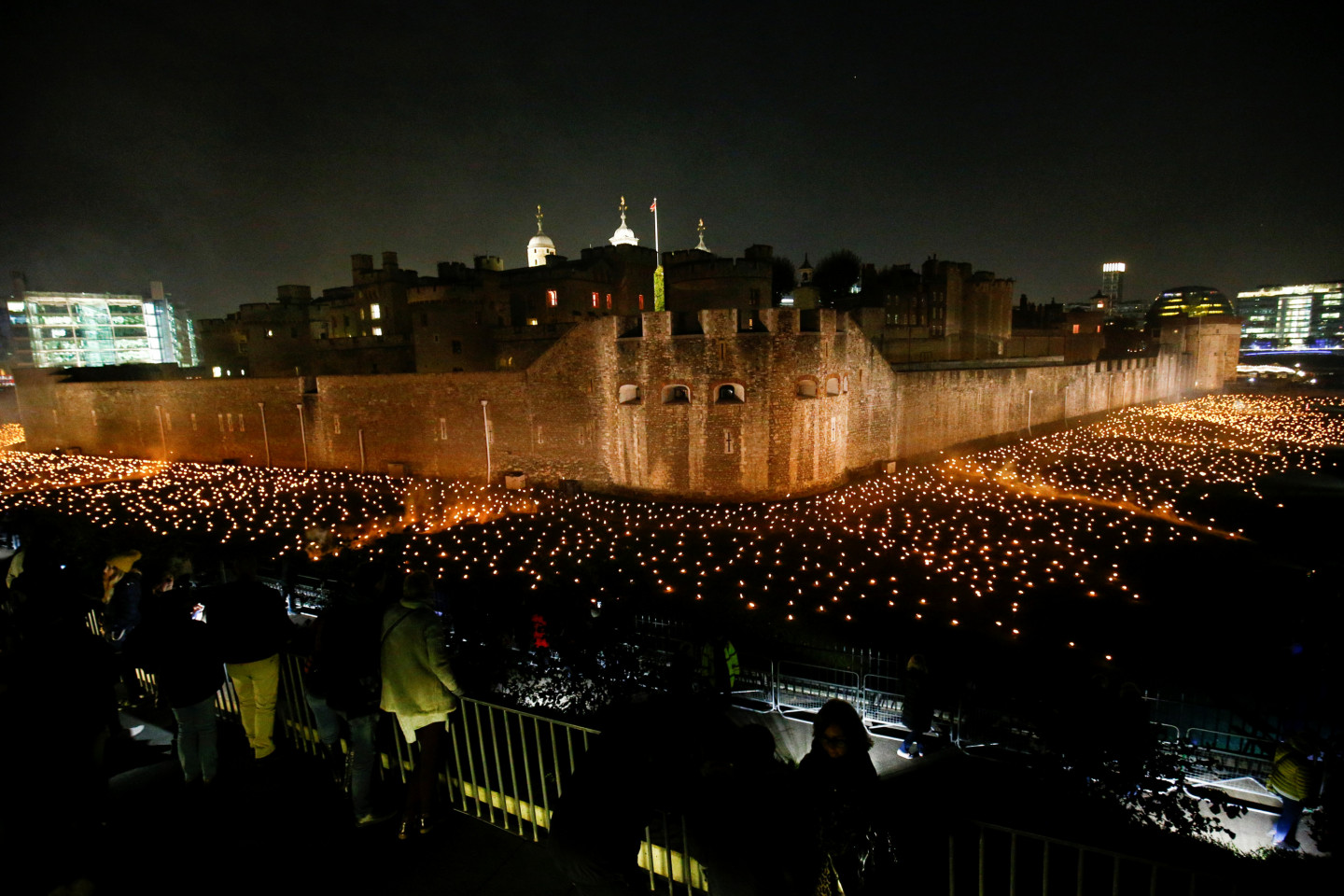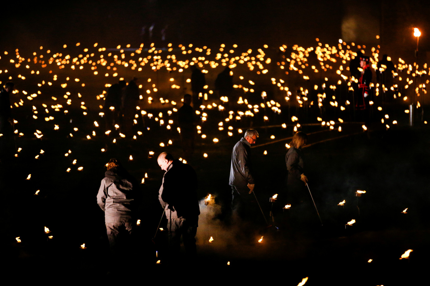 Ar tūkstošiem lāpas liesmu Lielbritānijā izveidota gaismas instalācija par godu gadsimtam kopš Pirmā pasaules kara beigām.