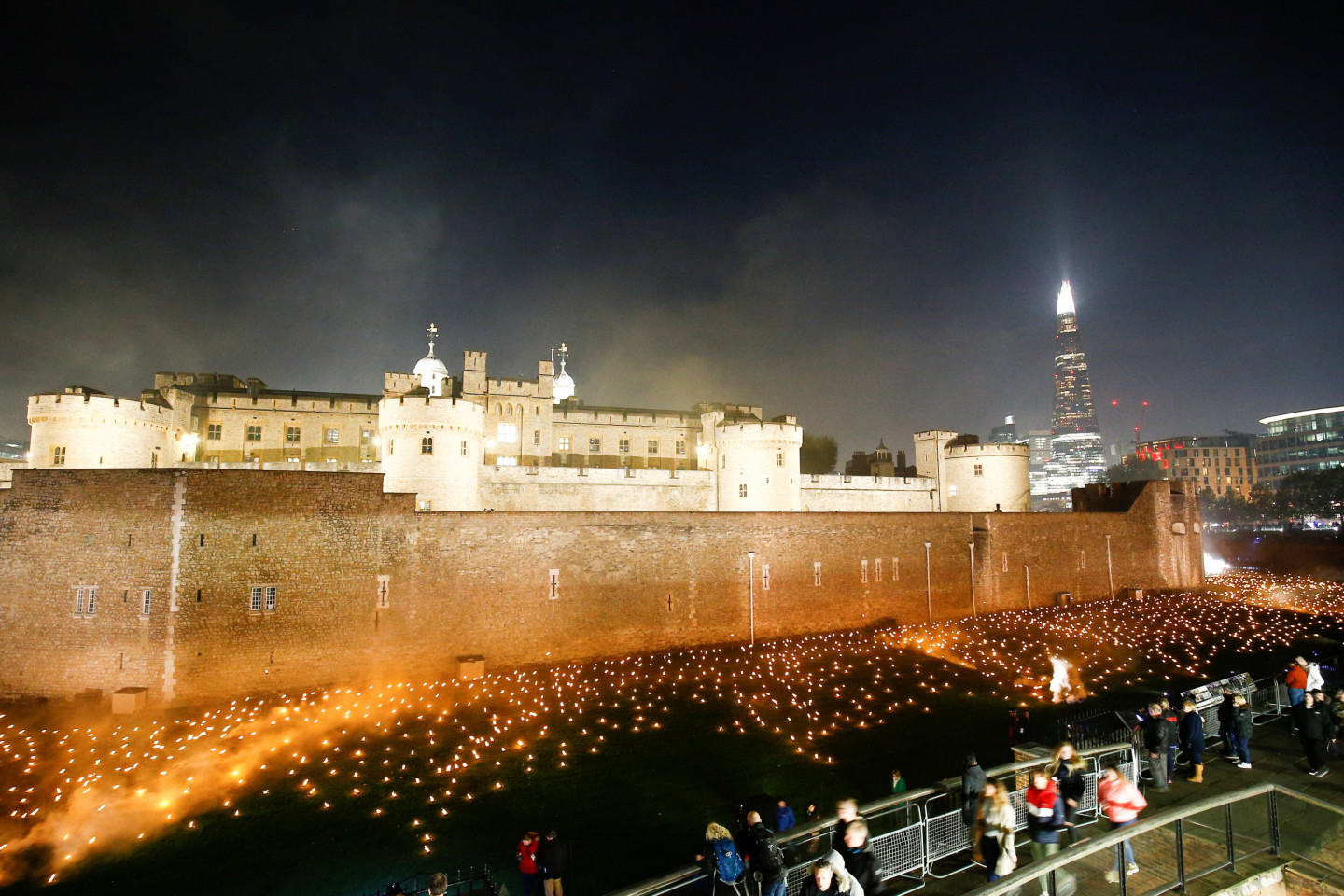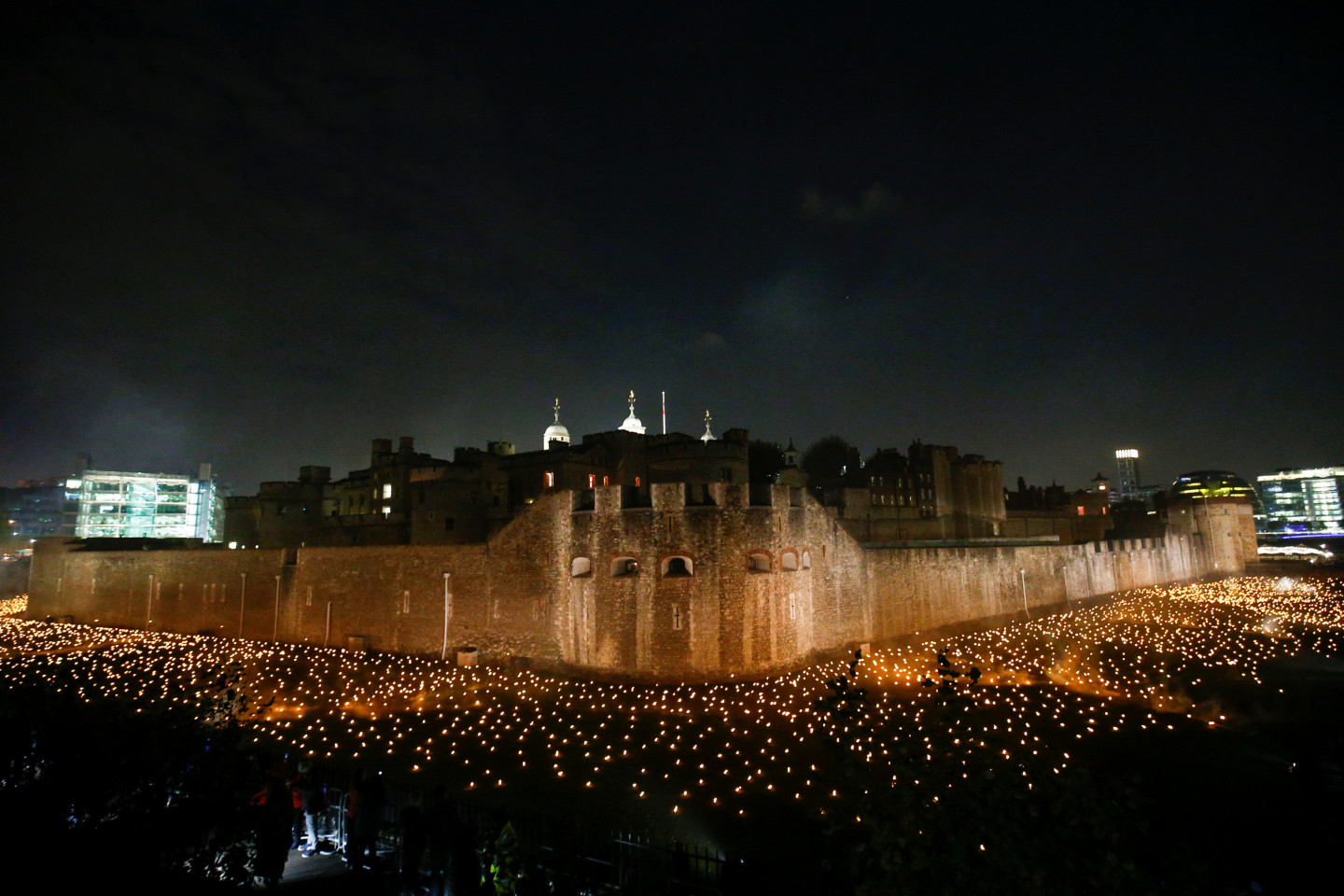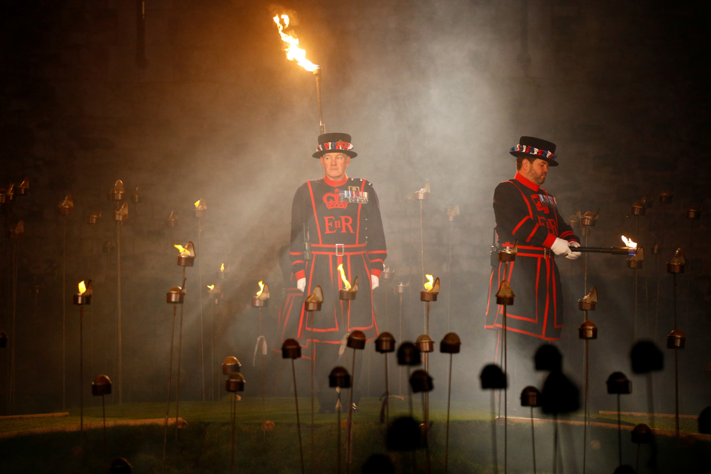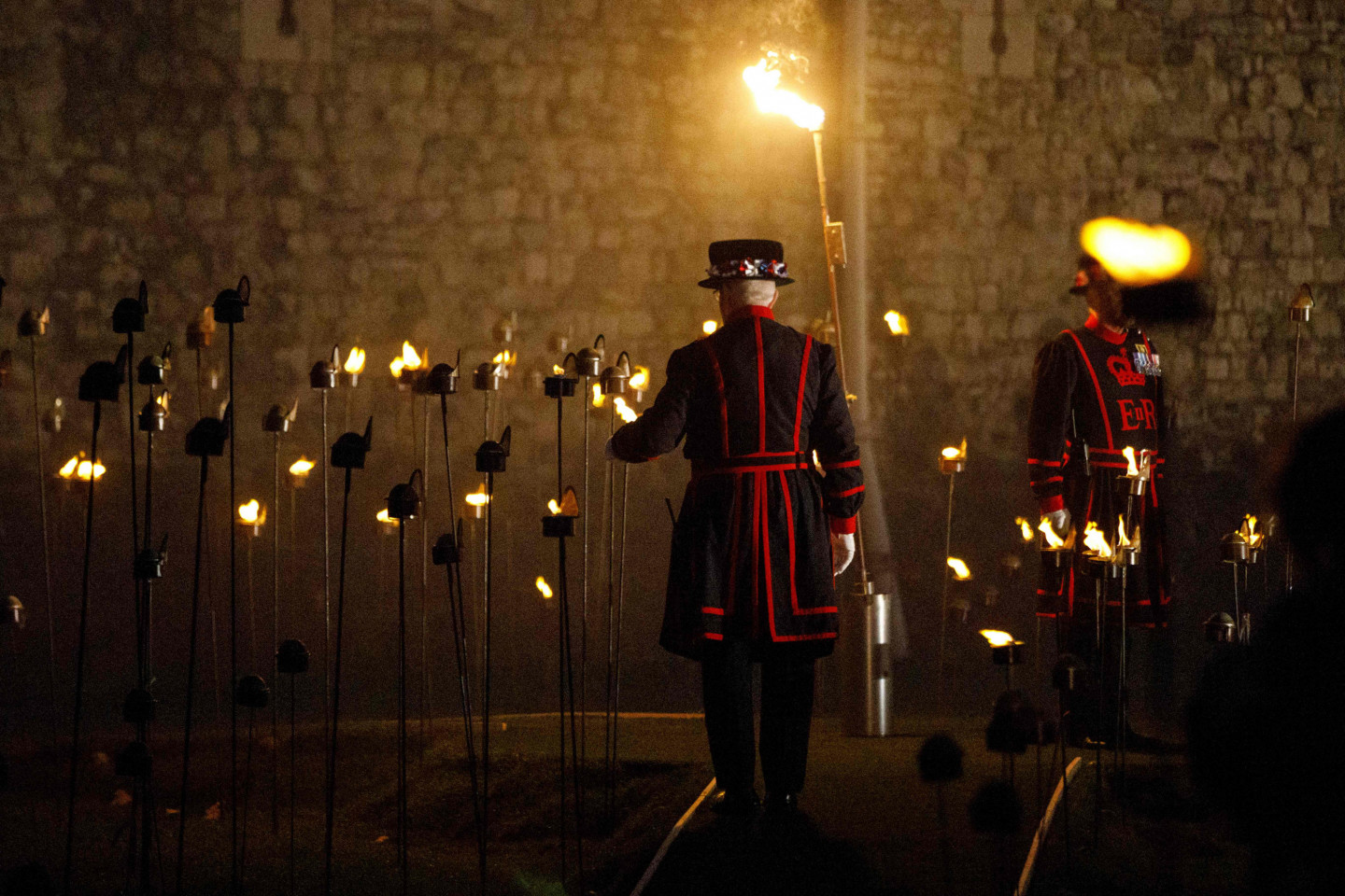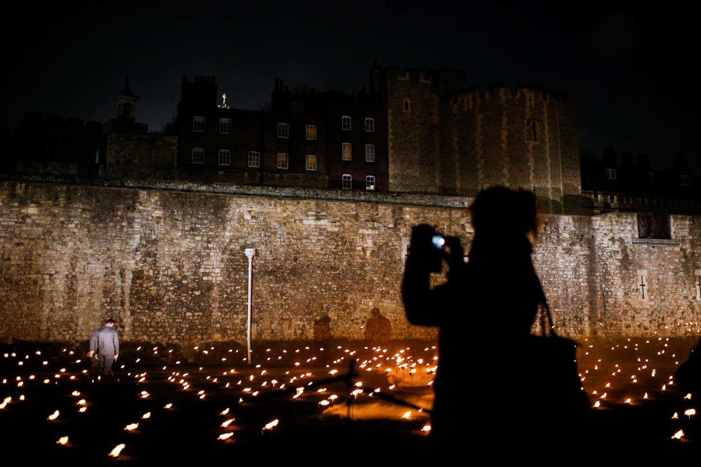 Ar tūkstošiem lāpas liesmu Lielbritānijā izveidota gaismas instalācija par godu gadsimtam kopš Pirmā pasaules kara beigām.