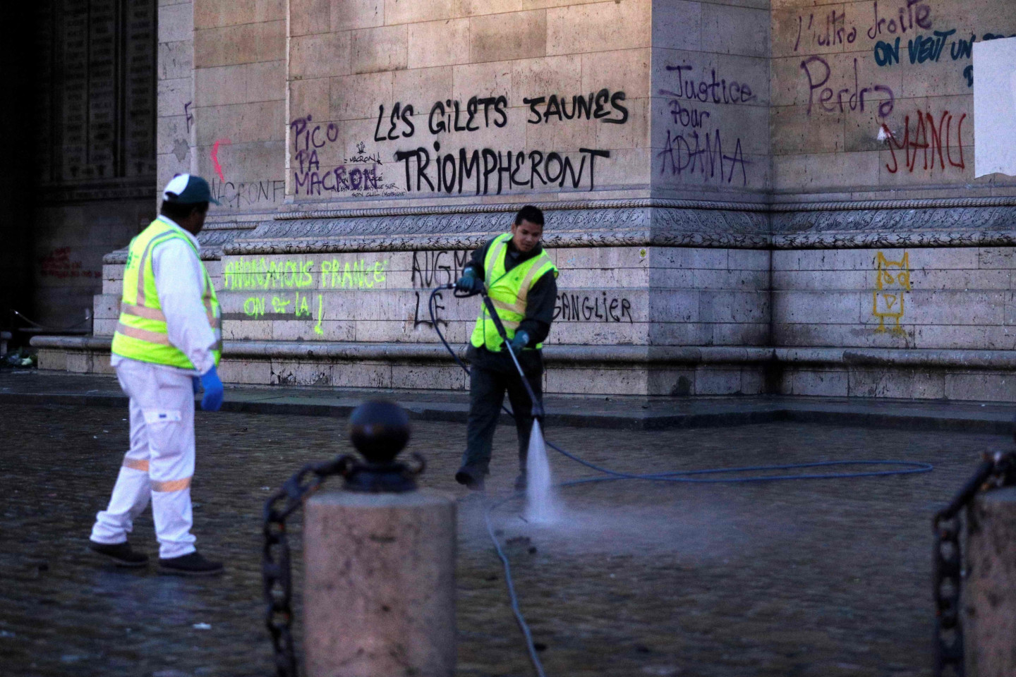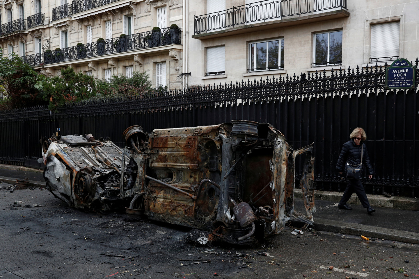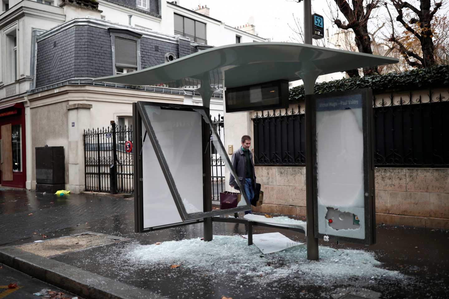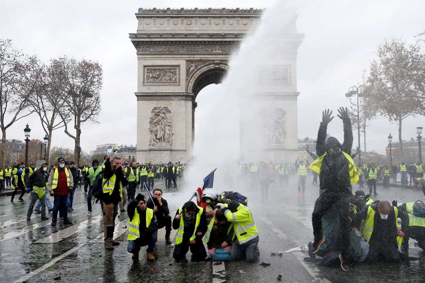 Francijā vardarbīgos protestos pret degvielas nodokļa palielināšanu un dzīves dārdzību cietuši 133 cilvēki, tai skaitā 23 policisti, bet 412 cilvēki aizturēti un 378 no viņiem noteikts apcietinājums, svētdien paziņojusi Francijas policija. Prezidents Emanuels Makrons svētdien rīko ārkārtēju drošības apspriedi ar premjerministru Eduāru Filipu un iekšlietu ministru Kristofu Kastanēru, brīdinot ka nemieru vaininiekiem nāksies atbildēt par nodarīto. Parīzes policija sestdien laida darbā asaru gāzi un ūdensmetēju pret protestētājiem, kas mēģināja izlauzties cauri nožogojumiem Elizejas laukos. Pilsētā tika slēgtas desmitiem ielu un vairākas metro stacijas. "Dzelteno vestu" protestos, kas izvērsās vardarbībā, cietuši tūristu iecienītākie Francijas galvaspilsētas rajoni. Protestētāji dedzināja automašīnas, izsita skatlogus, izlaupīja veikalus, apmētāja ar akmeņiem policiju un apkrāsoja Triumfa arku ar daudzkrāsainiem grafiti, ko pilsētas saimniecisko dienestu darbinieki svētdien pūlas notīrīt. "Dzeltenās vestes uzvarēs!" - vēsta viens no protestu dalībnieku atstātajiem uzrakstiem. Elizejas lauku, Triumfa arkas un Tilerī dārza apkaimē ielas piemētātas ar atkritumiem, ielu malās redzamas izdegušas automašīnas, daudzas fasādes apkrāsotas ar uzrakstiem. Pretstatā Parīzei citviet Francijā protesti sestdien noritējuši lielākoties mierīgi. Protesti pret degvielas nodokļa paaugstināšanu Francijā sākās pirms divām nedēļām. Protestiem turpinoties, izveidojusies plaša opozīcijas fronte pret centrisko prezidentu Makronu. Francijas amatpersonas bažījas, ka "dzelteno vestu" protestos plāno iefiltrēties galēji labējie un galēji kreisie grupējumi.