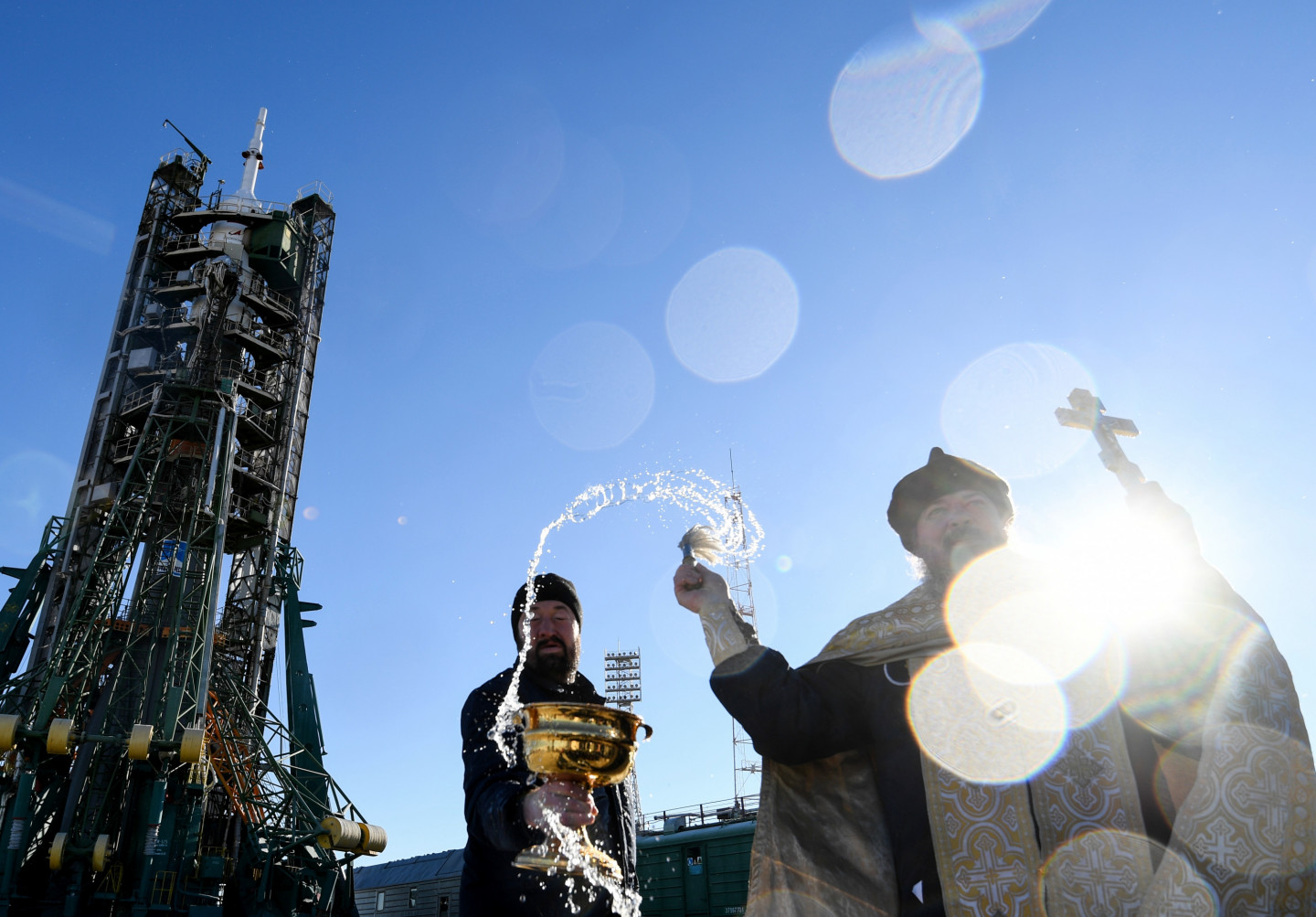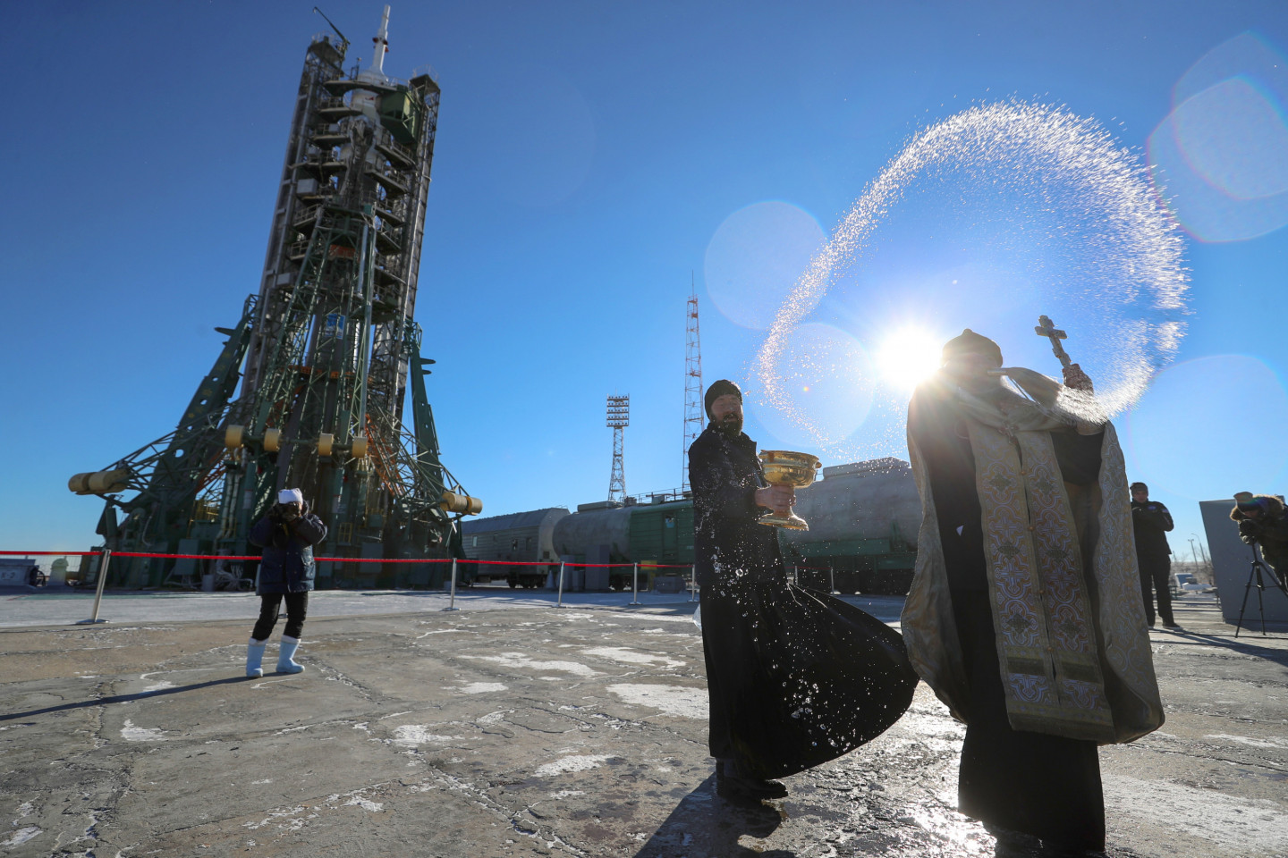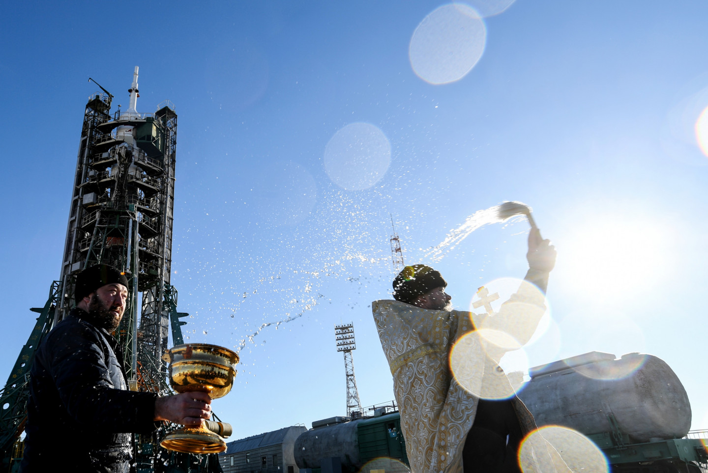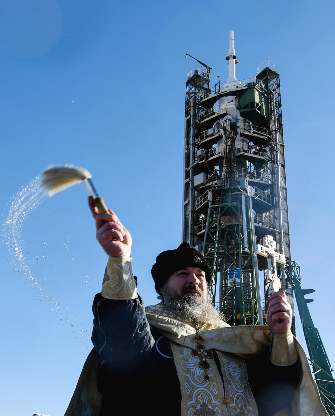 Pareizticīgās baznīcas priesteris šodien Kazahstānā iesvētīja raķeti "Soyuz MS-11", kuru pirmdien plānots palaist kosmosā.