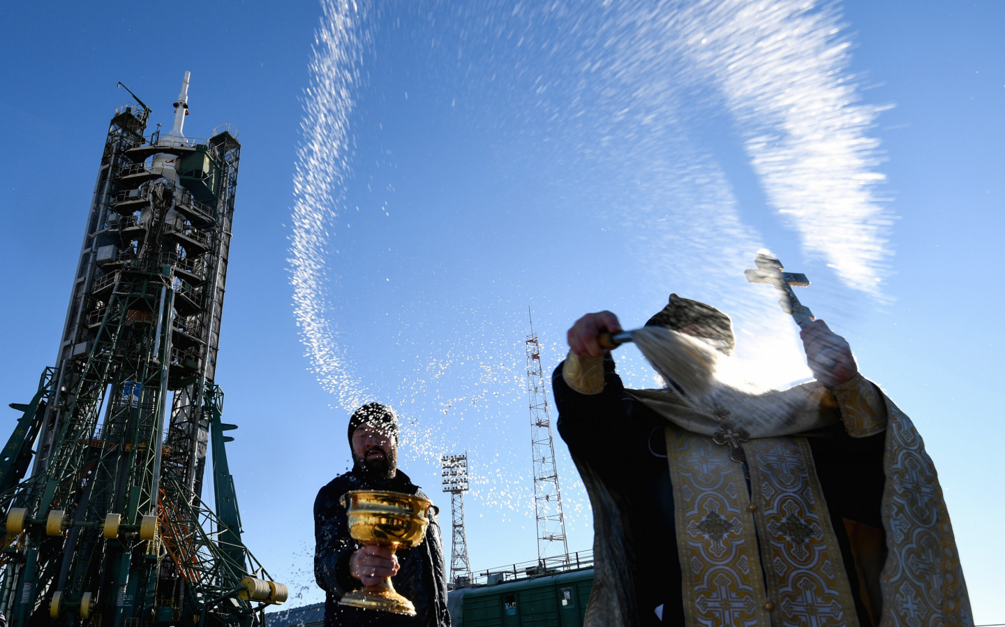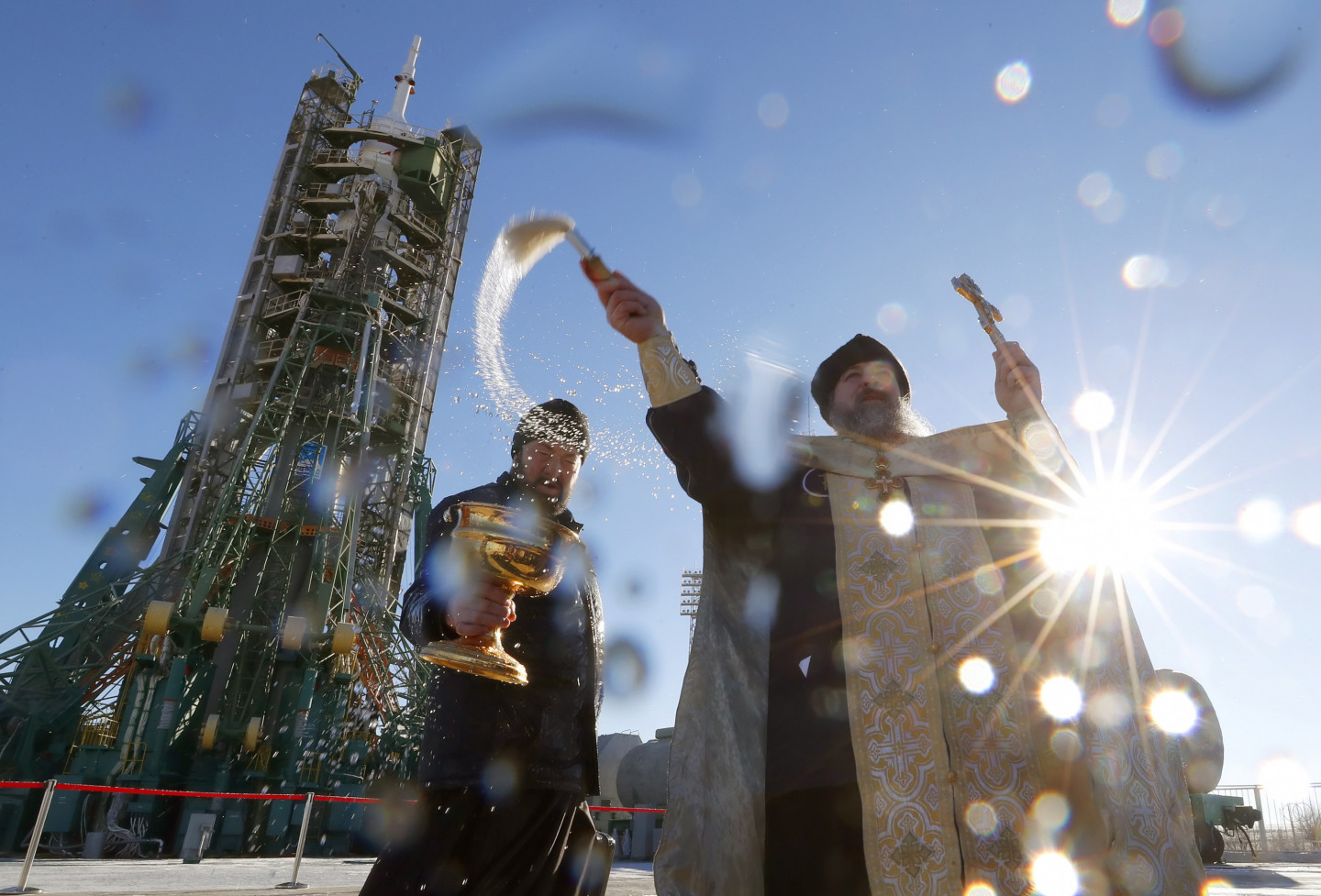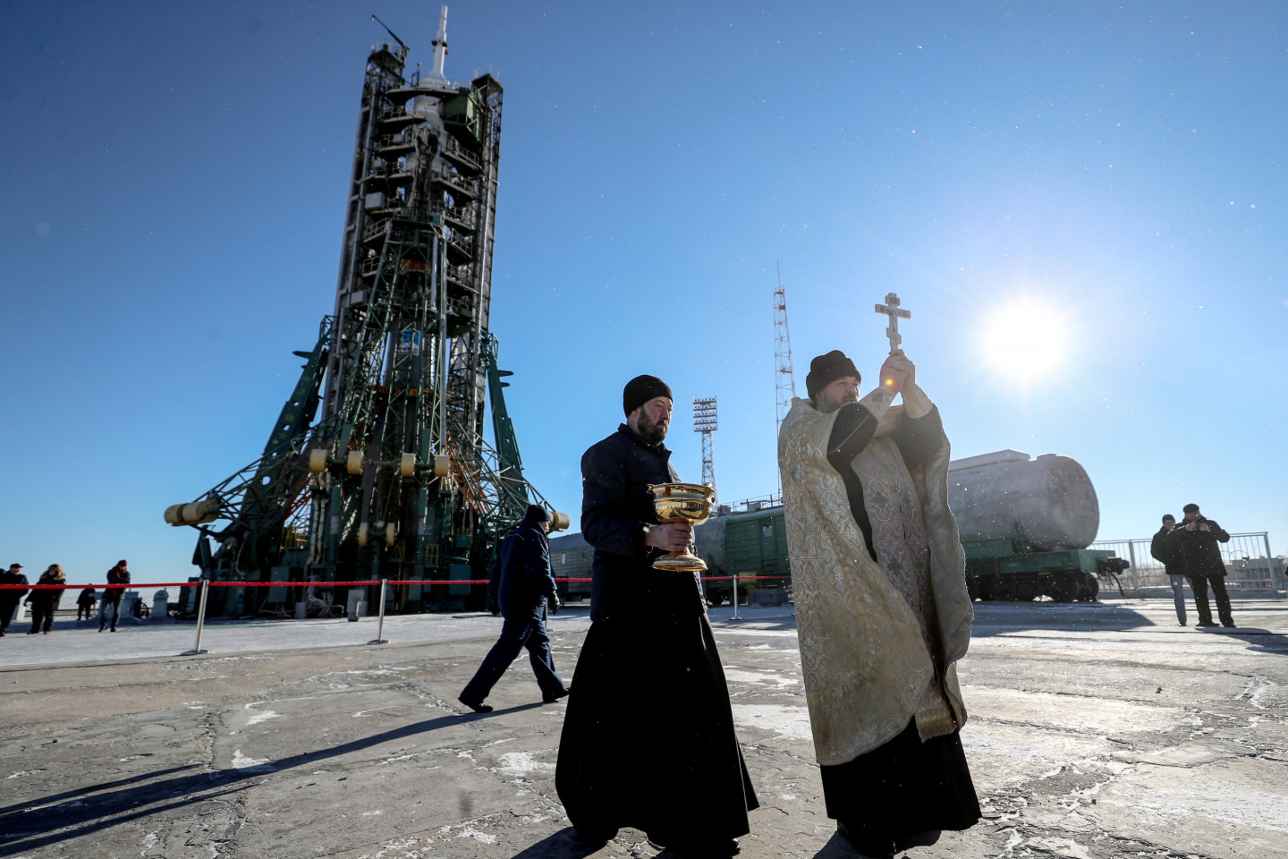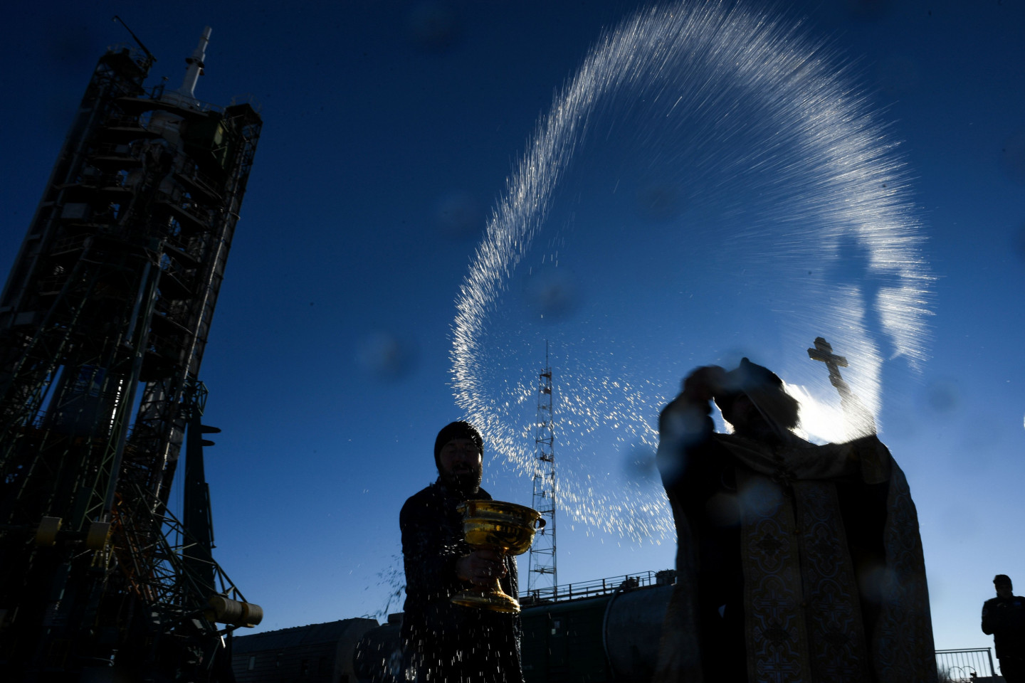Pareizticīgās baznīcas priesteris šodien Kazahstānā iesvētīja raķeti "Soyuz MS-11", kuru pirmdien plānots palaist kosmosā.