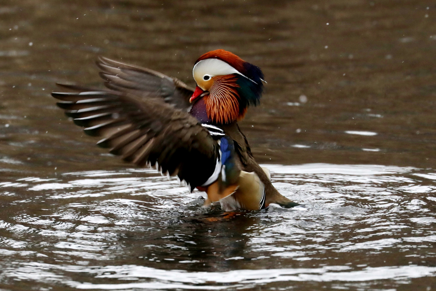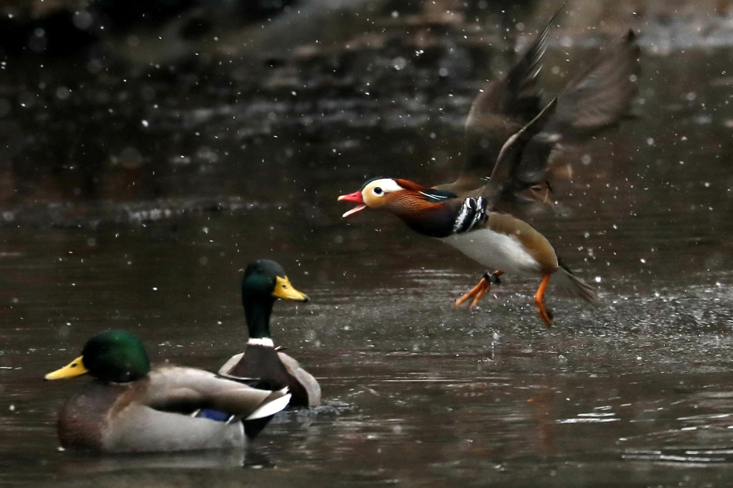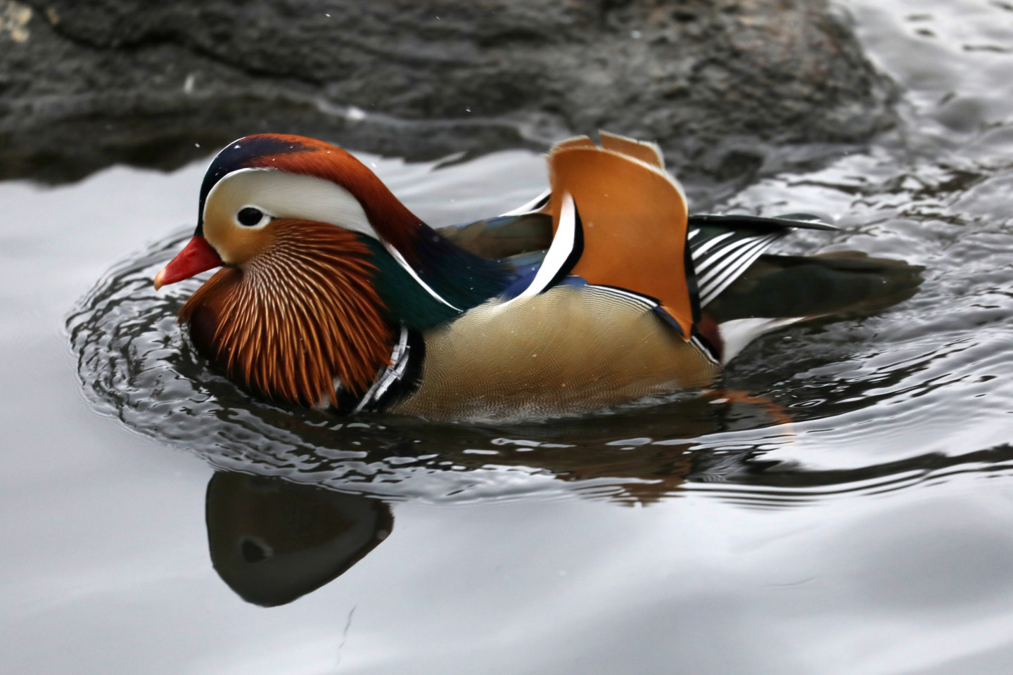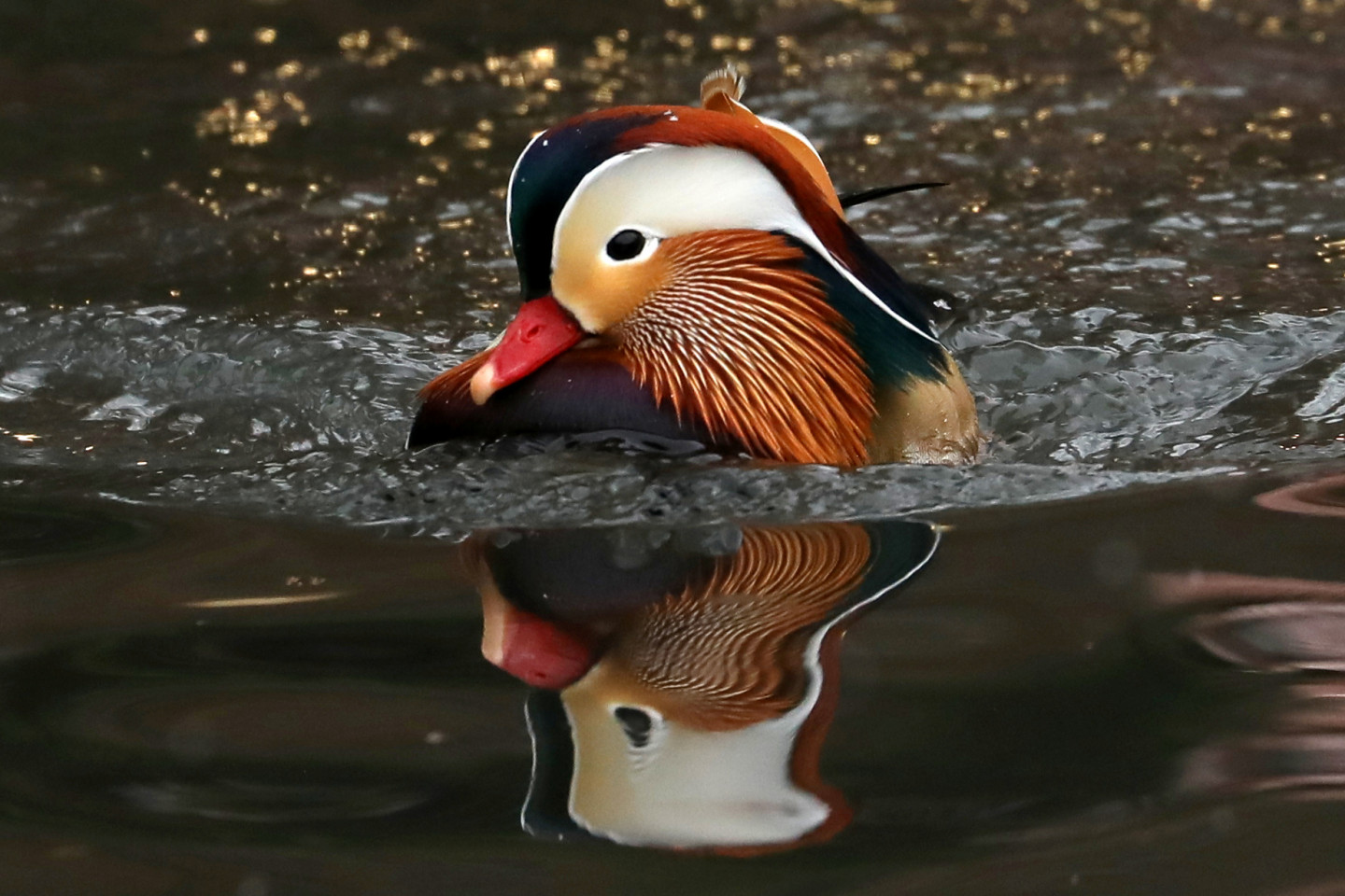Austrumāzijas naconālais putns - mandarīnpīle plunčājas ūdenī Manhetenas Centrālparkā