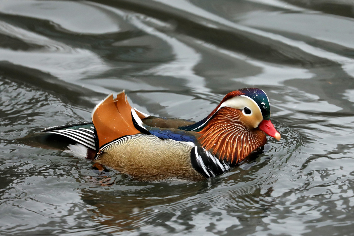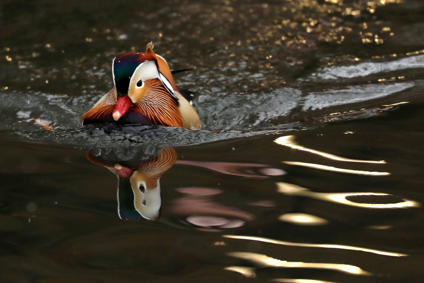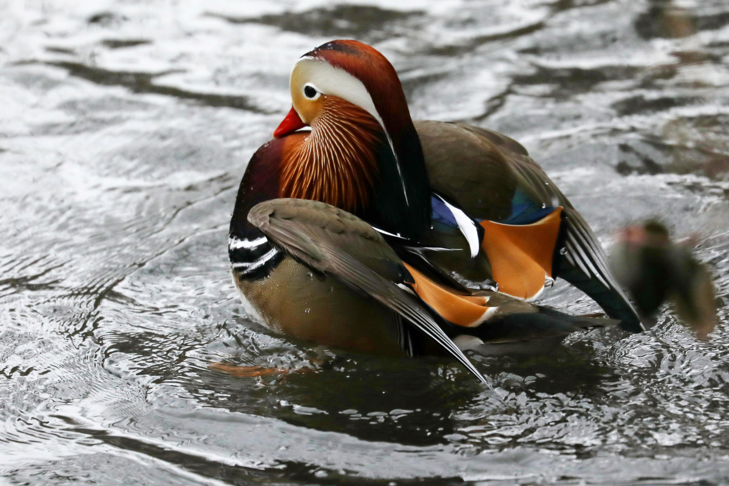 Austrumāzijas naconālais putns - mandarīnpīle plunčājas ūdenī Manhetenas Centrālparkā
