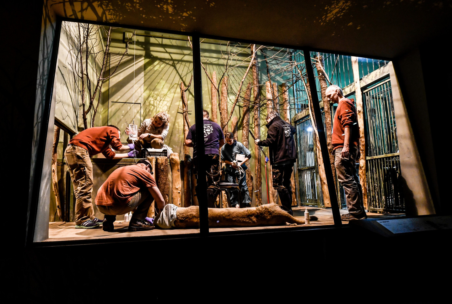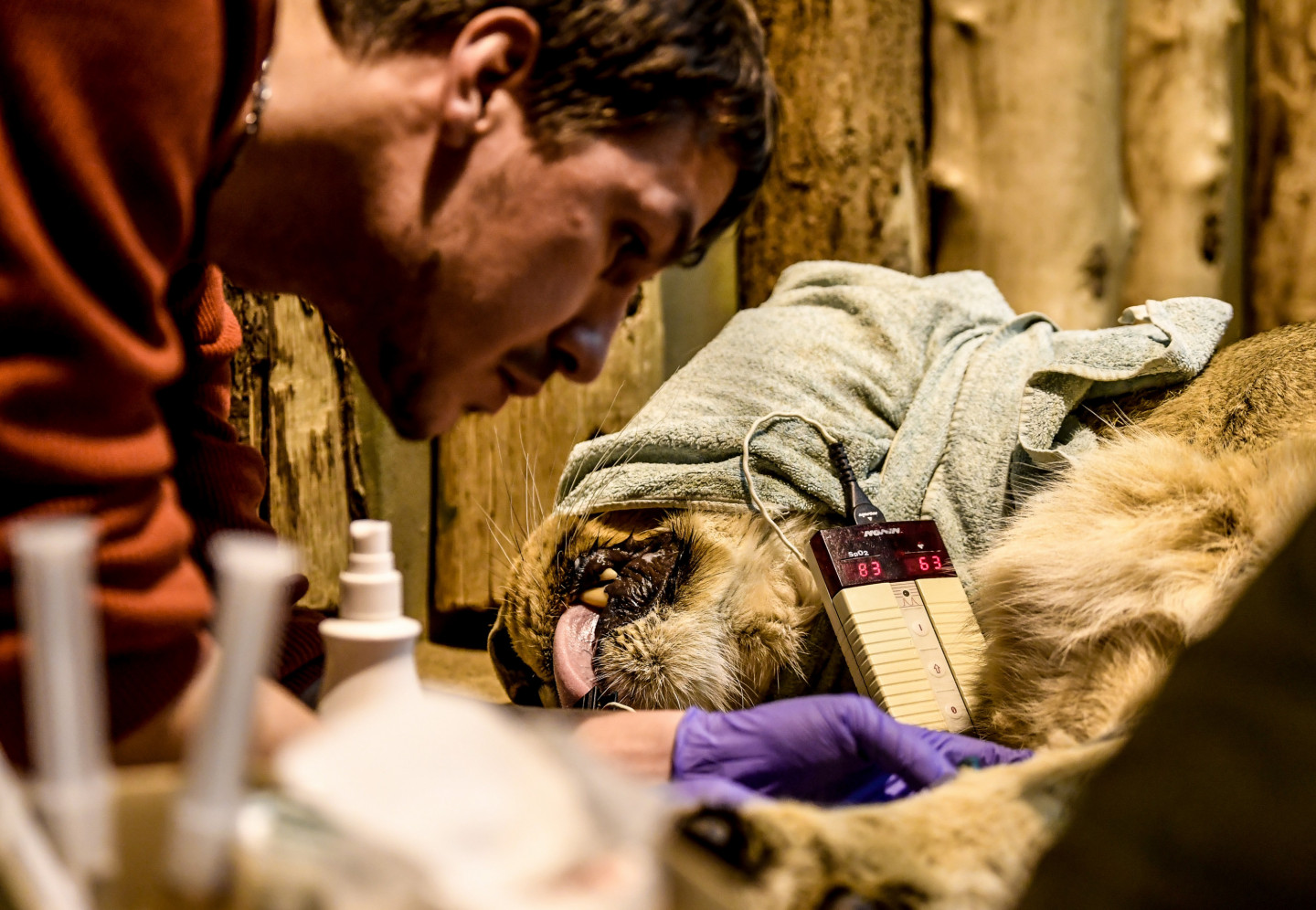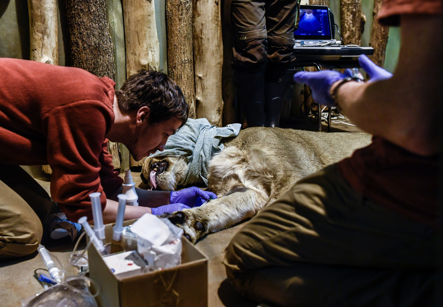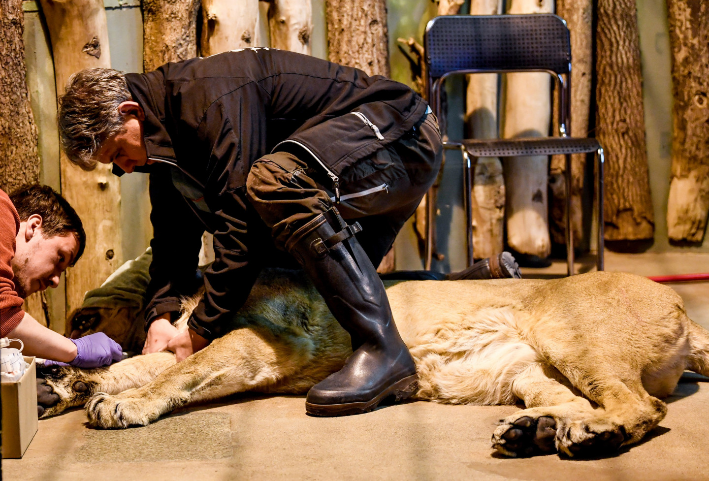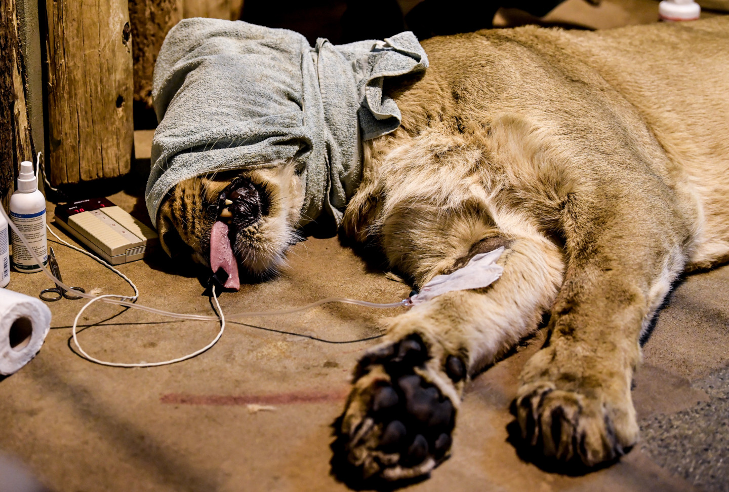 Veternārārsti Prāgas zoodārzā publiski veikuši veselības procedūras piecus gadus vecajai lauvai Džīnijai.