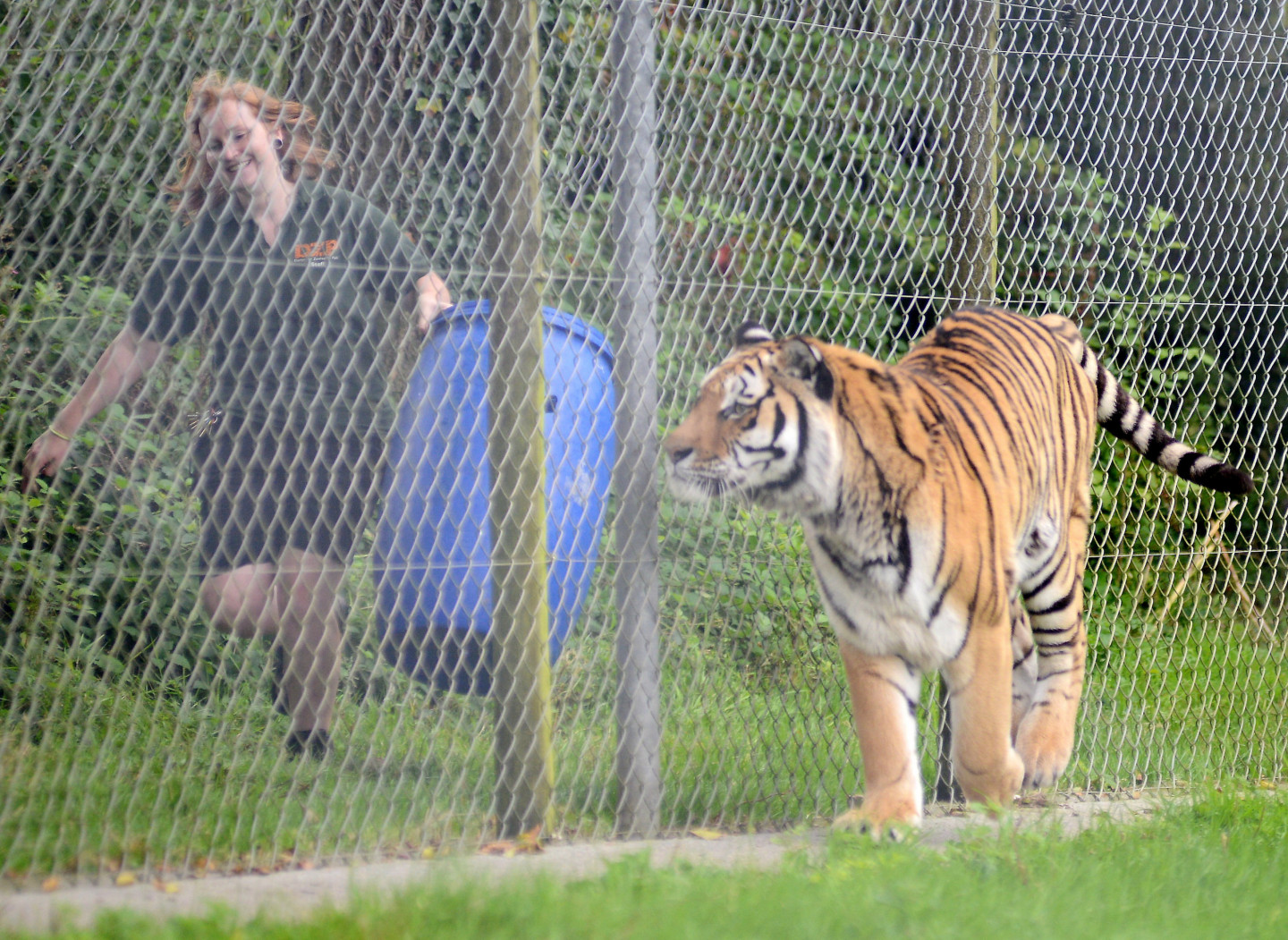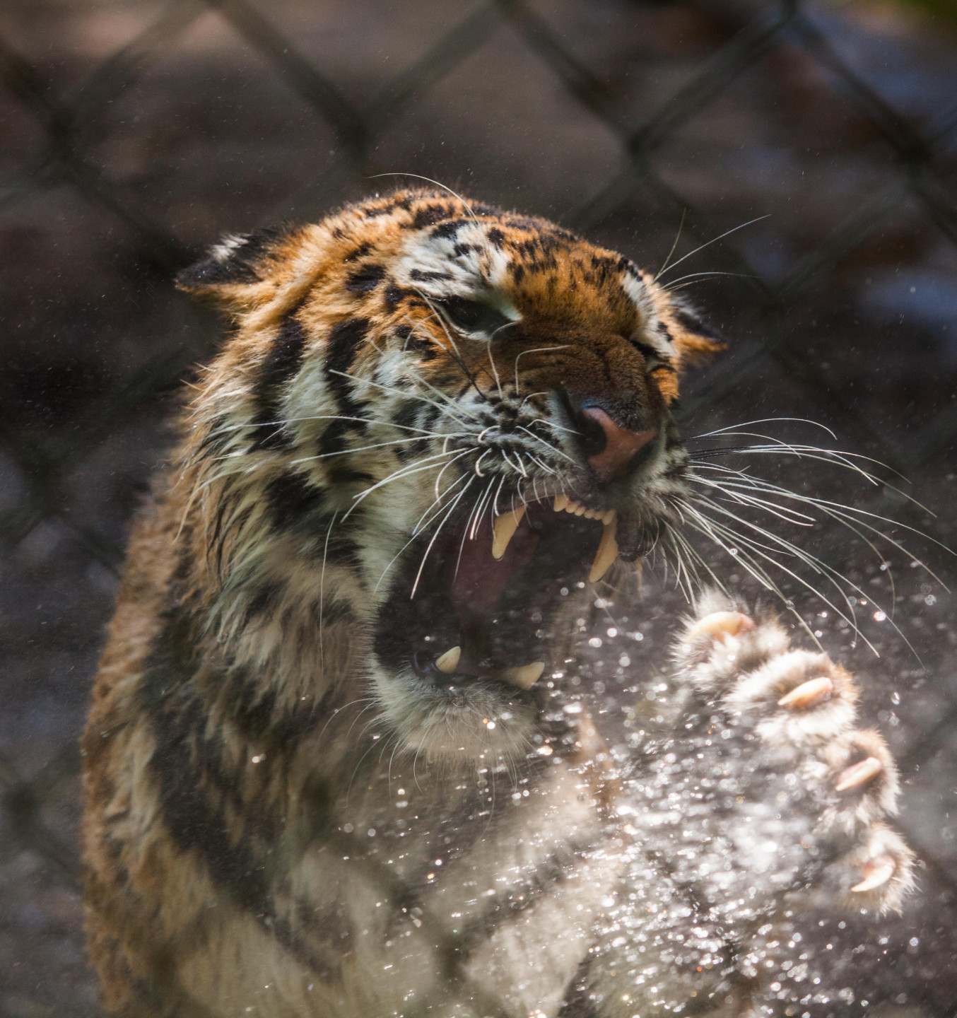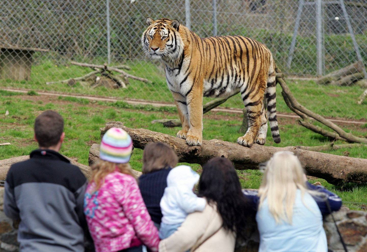 Tīģeris zoodārzā Lielbritānijā parāda atņirgtus zobus