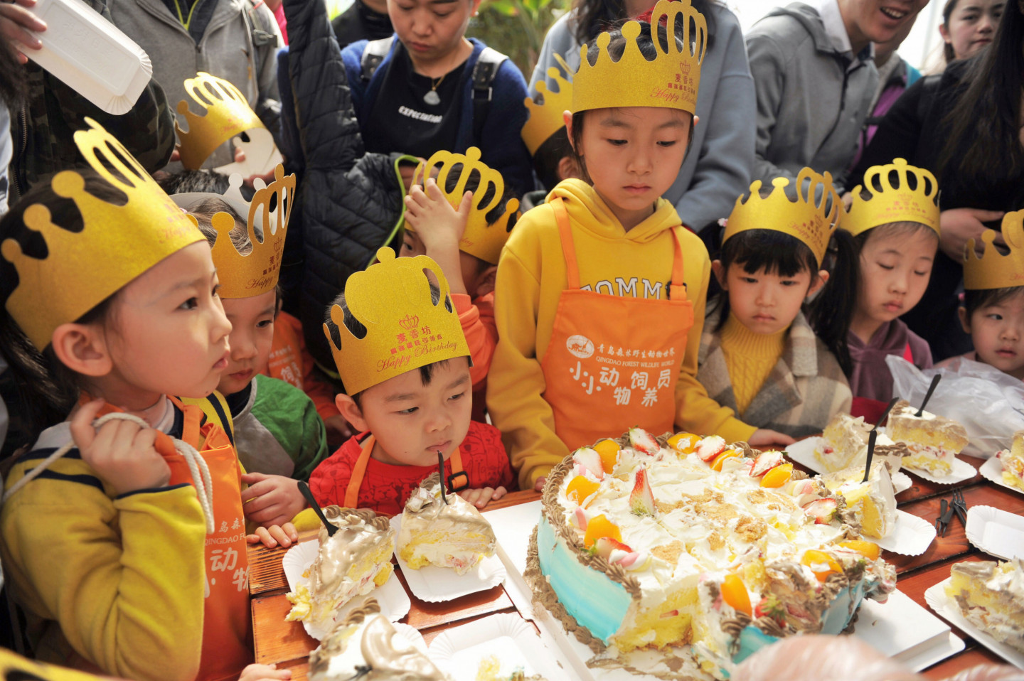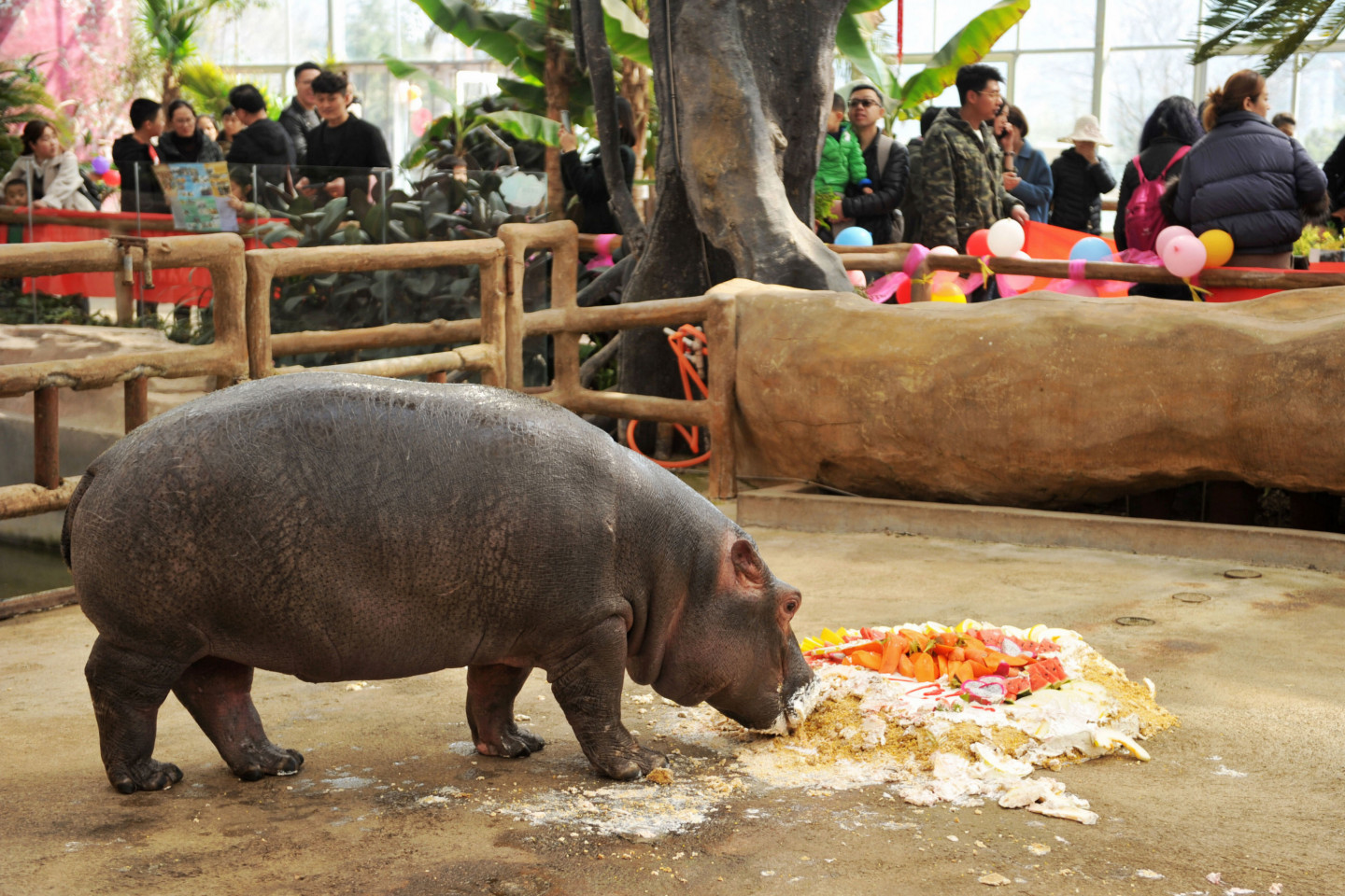 Cilvēki zoodārzā Ķīnā svin nīlzirga dzimšanas dienu