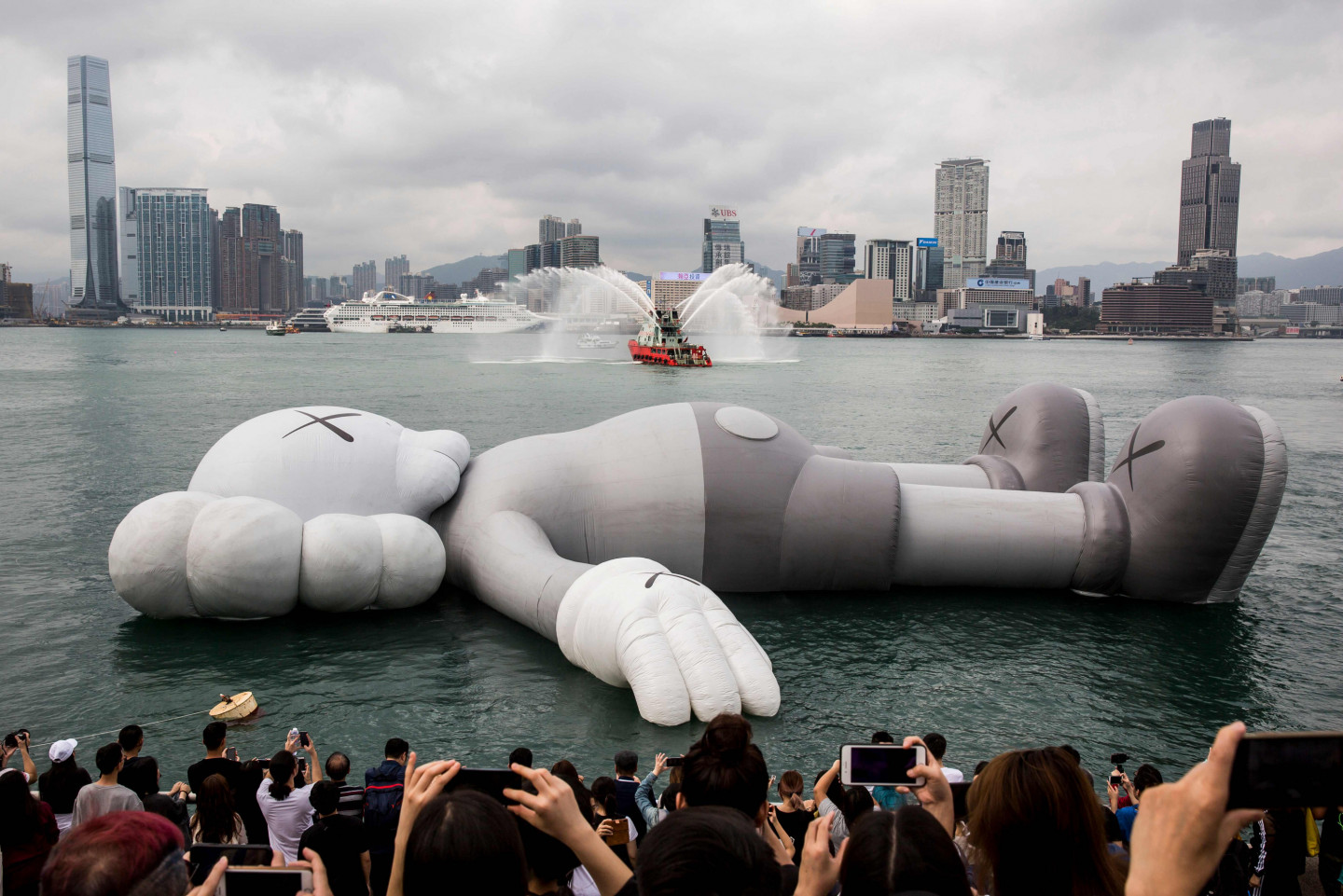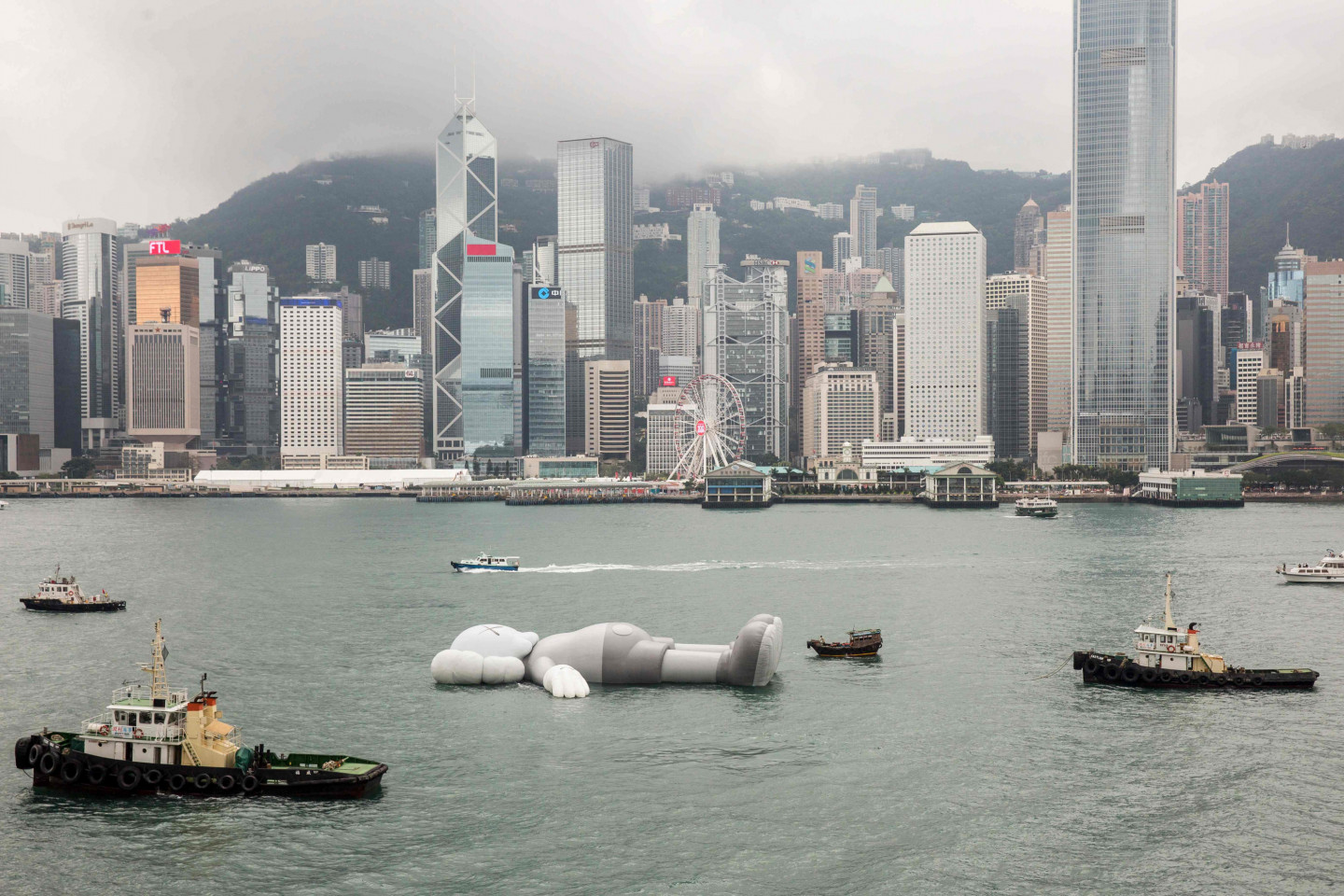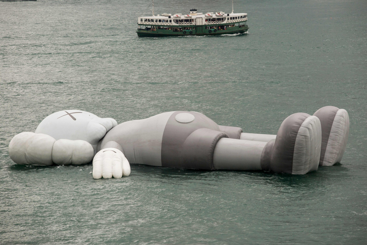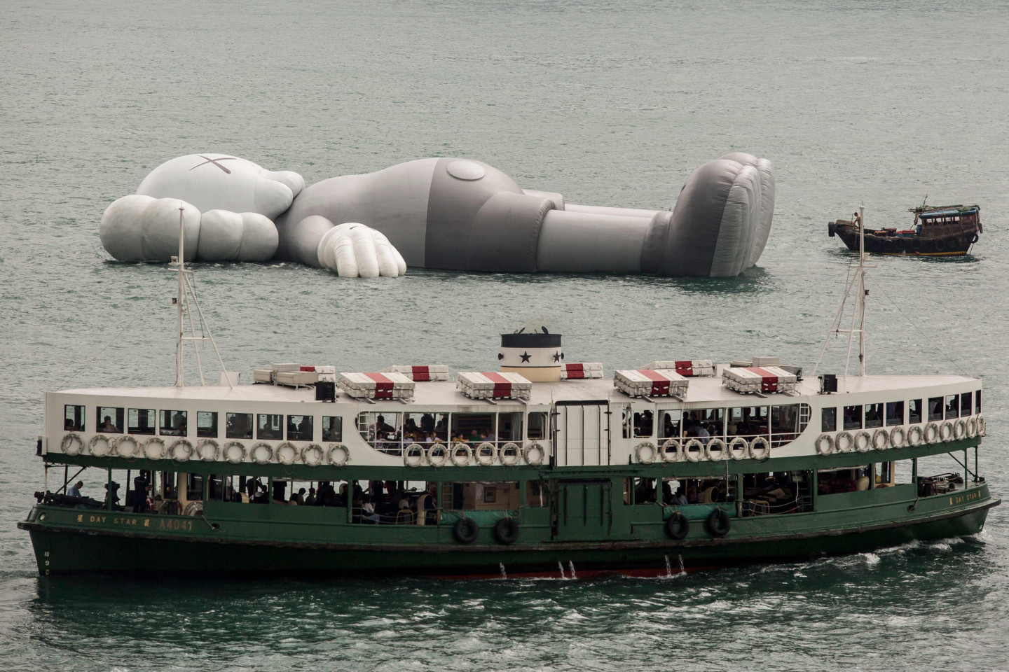ASV māksliniece ar segvārdu "Kaws" pirms gaidāmās izstādes pārsteigusi Honkongas iedzīvotājus. Viņa Viktorijas ostas ūdeņos demonstrējusi peldošo skulptūru.