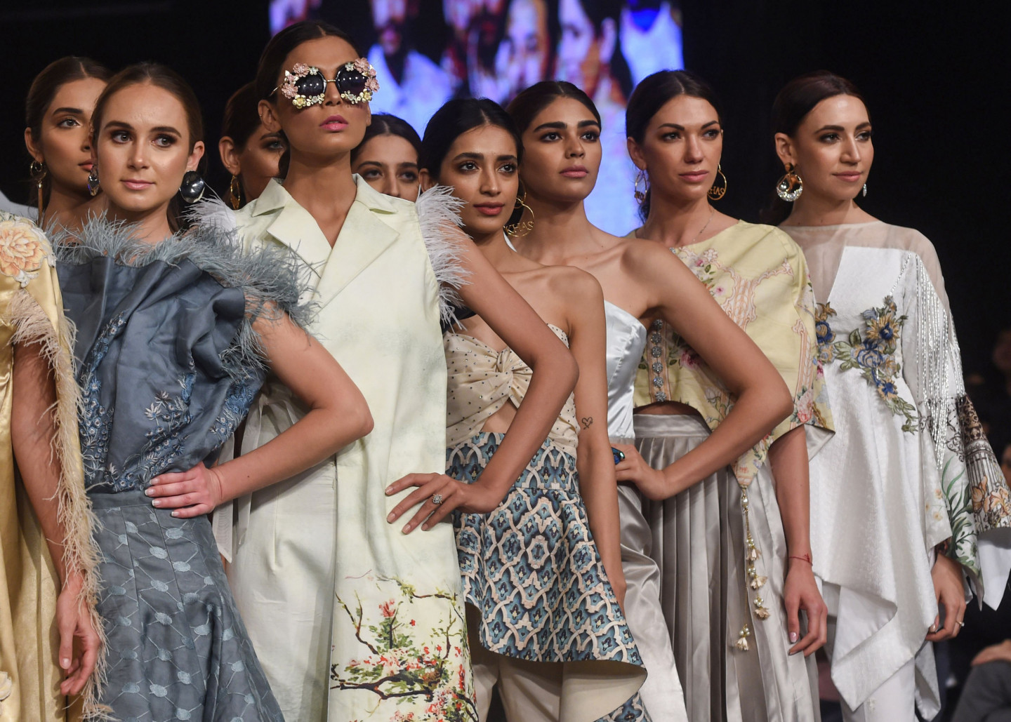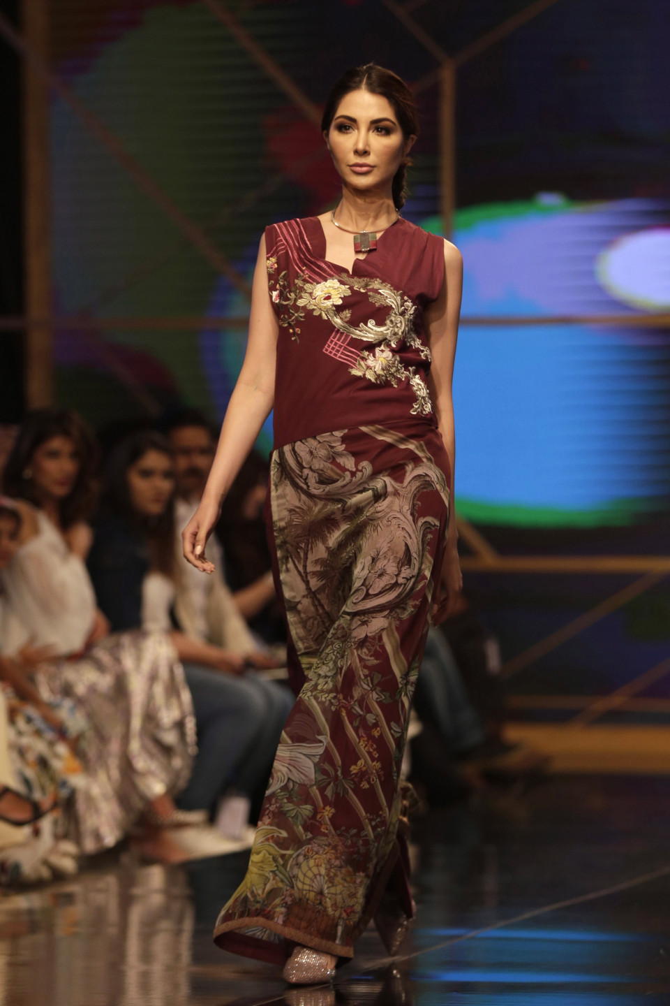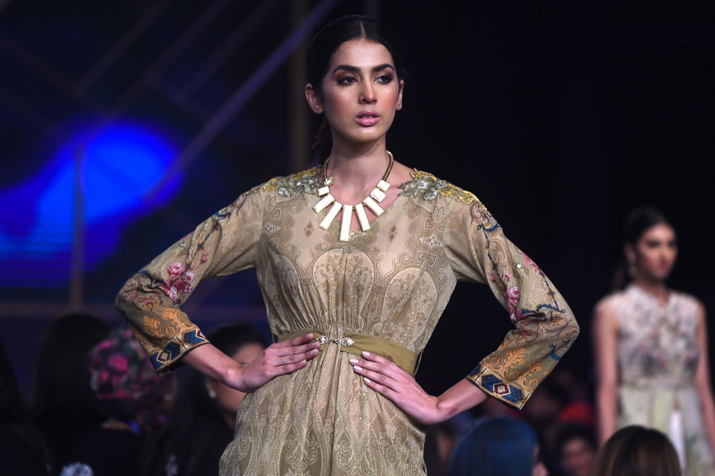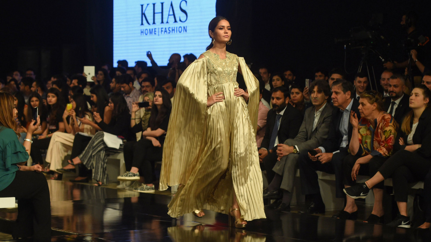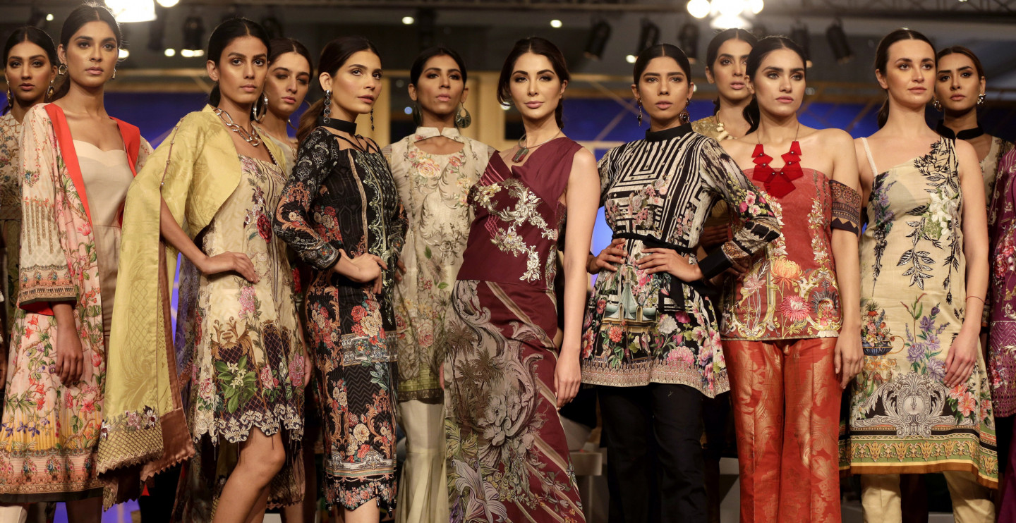 Modeles defilē pa mēli Pakistānas modes nedēļā
