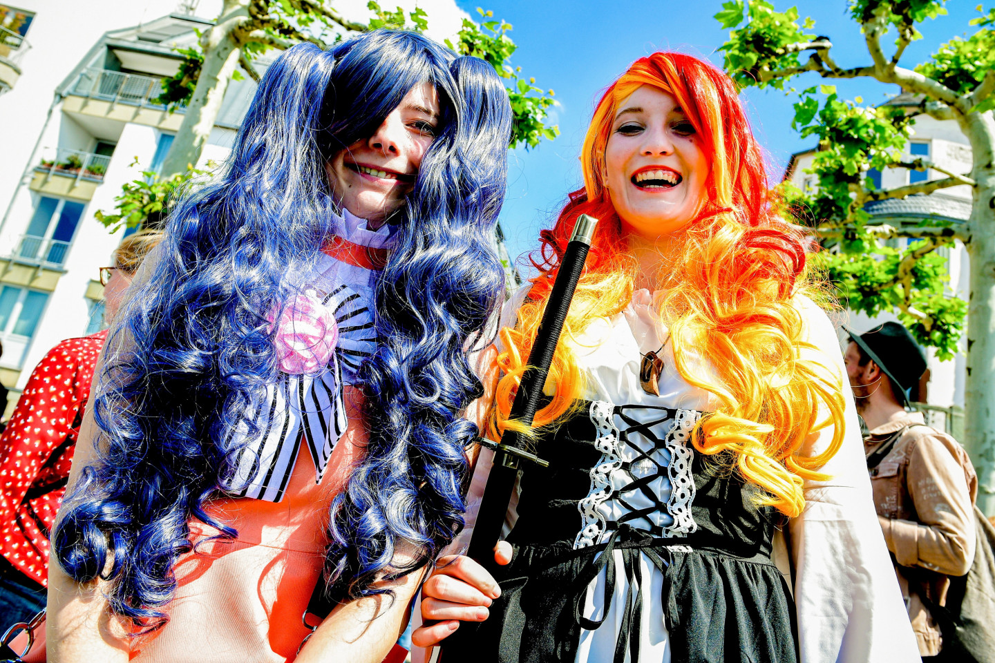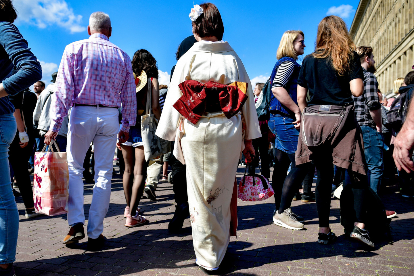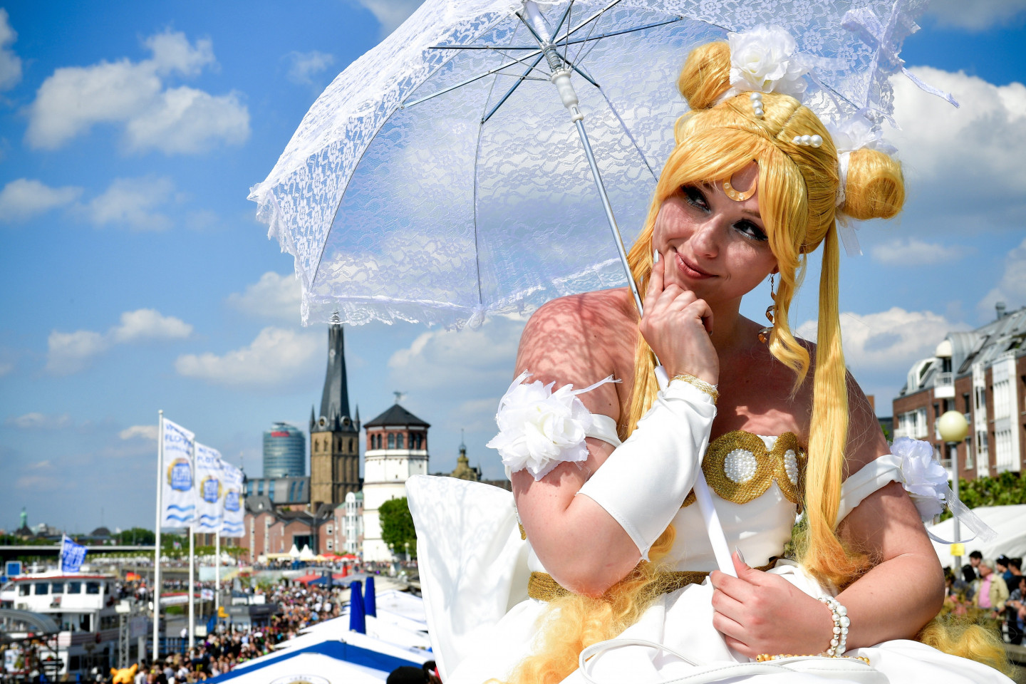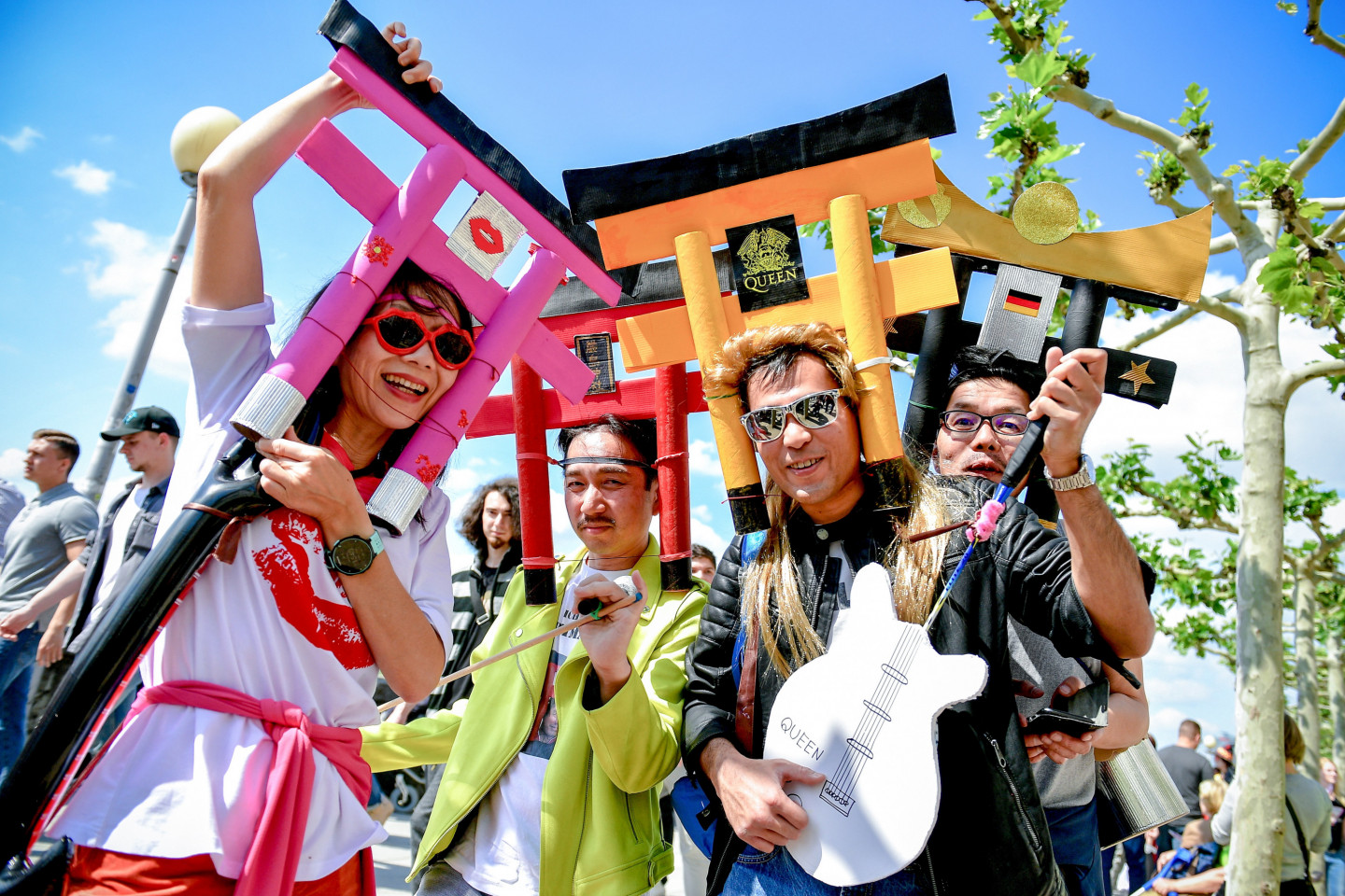 Cilvēki, tērpušies dažādos neparastos kostīmos, Diseldorfā, Vācijā, atzīmējuši 18. Japānas dienu. Tajā piedalījās teju miljons cilvēku.