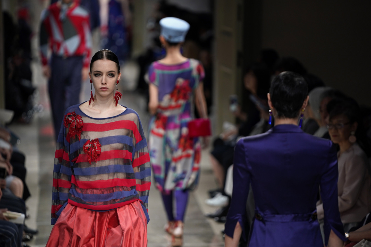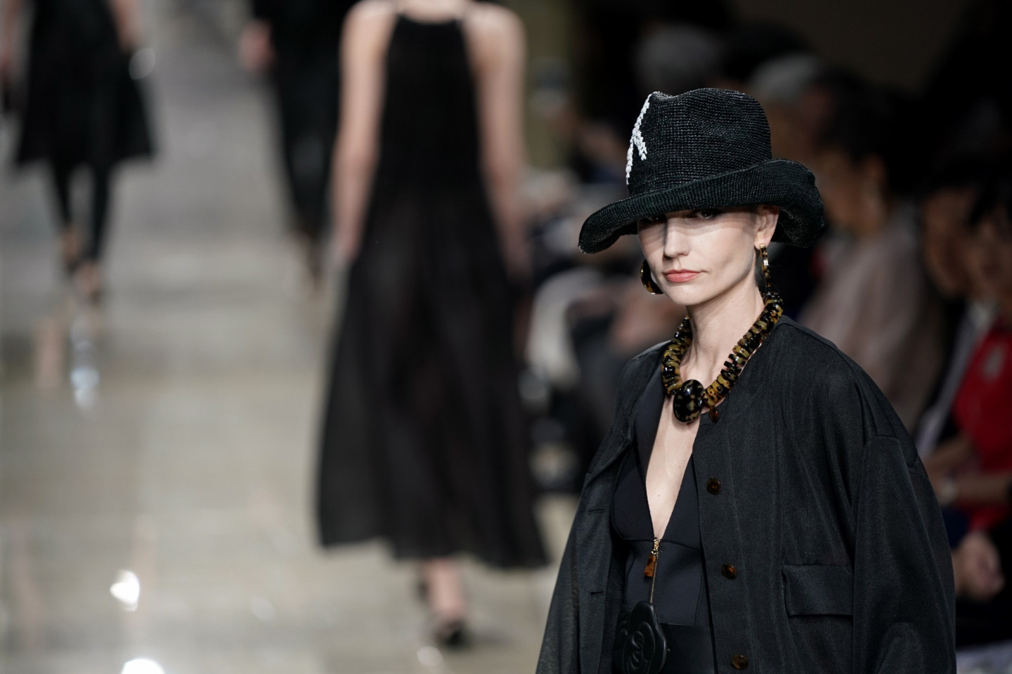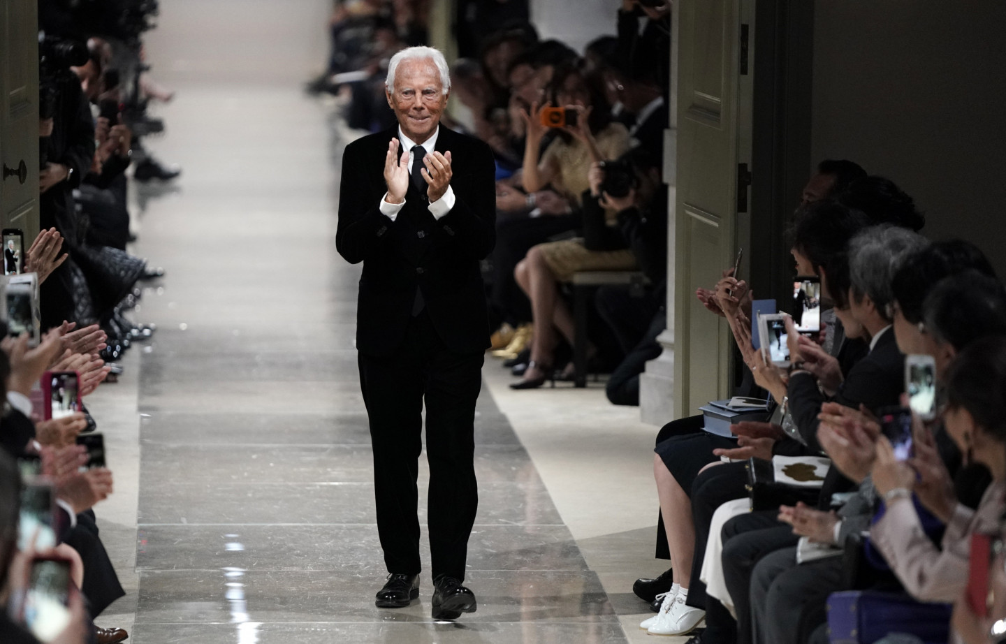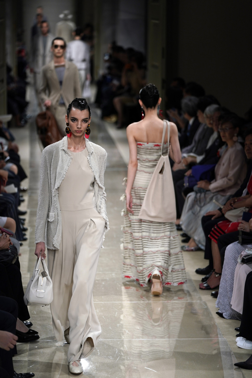 Modeles defilē pa mēli "Giorgio Armani" modes skatē