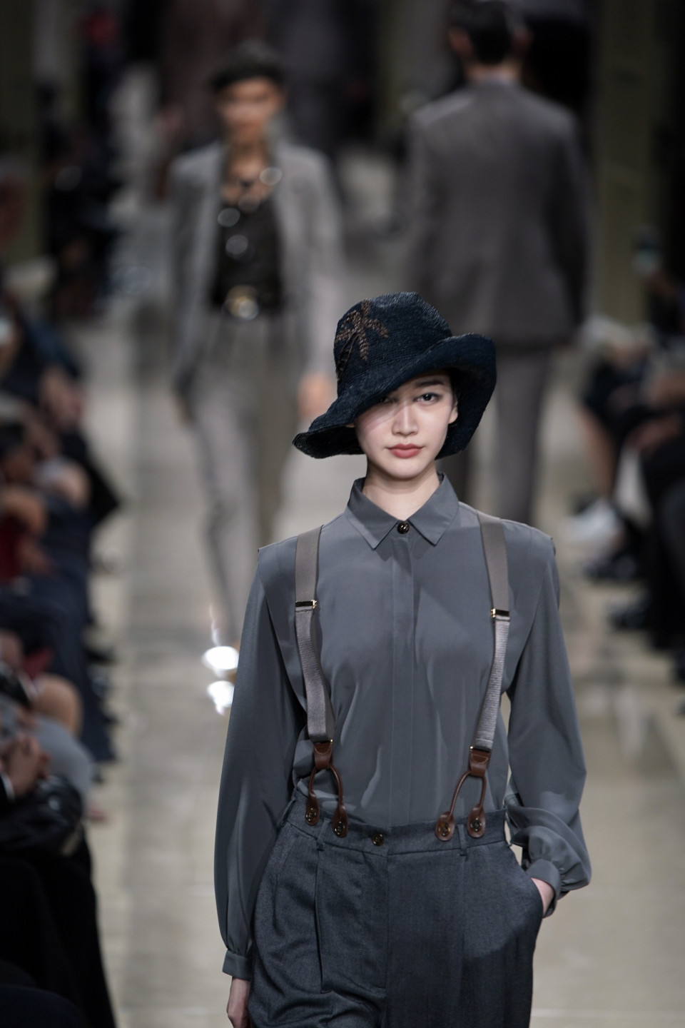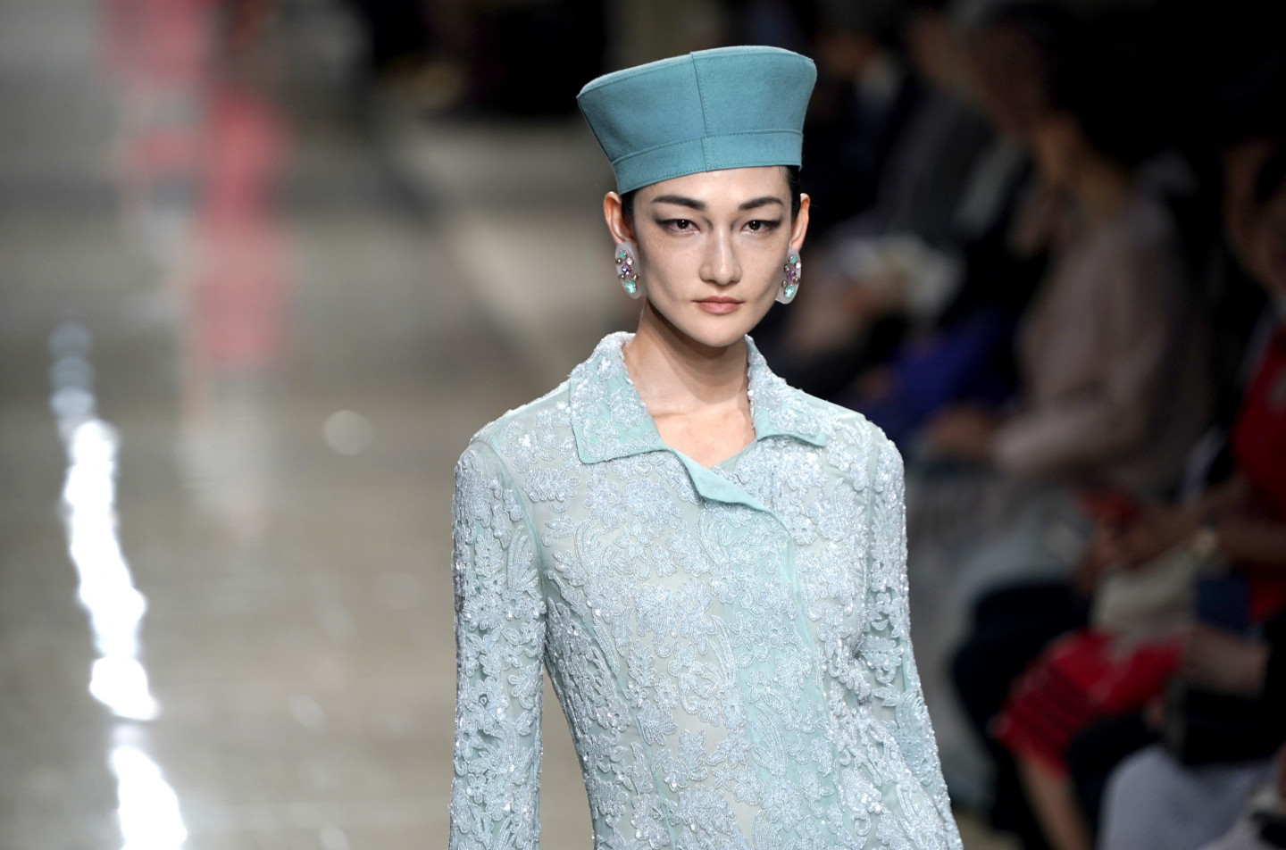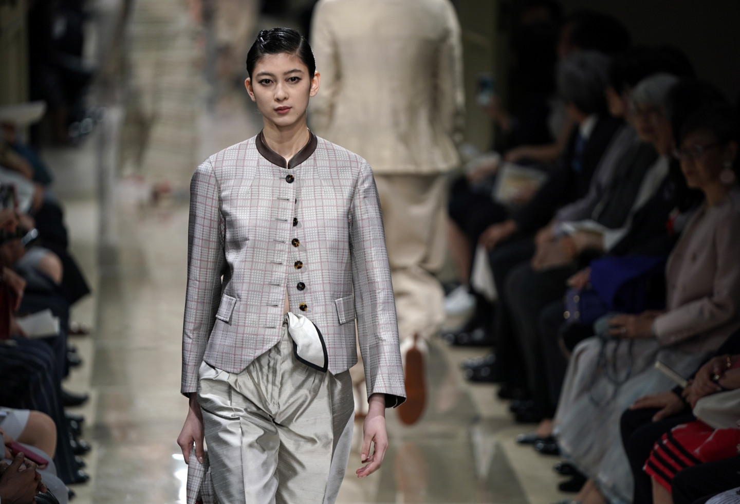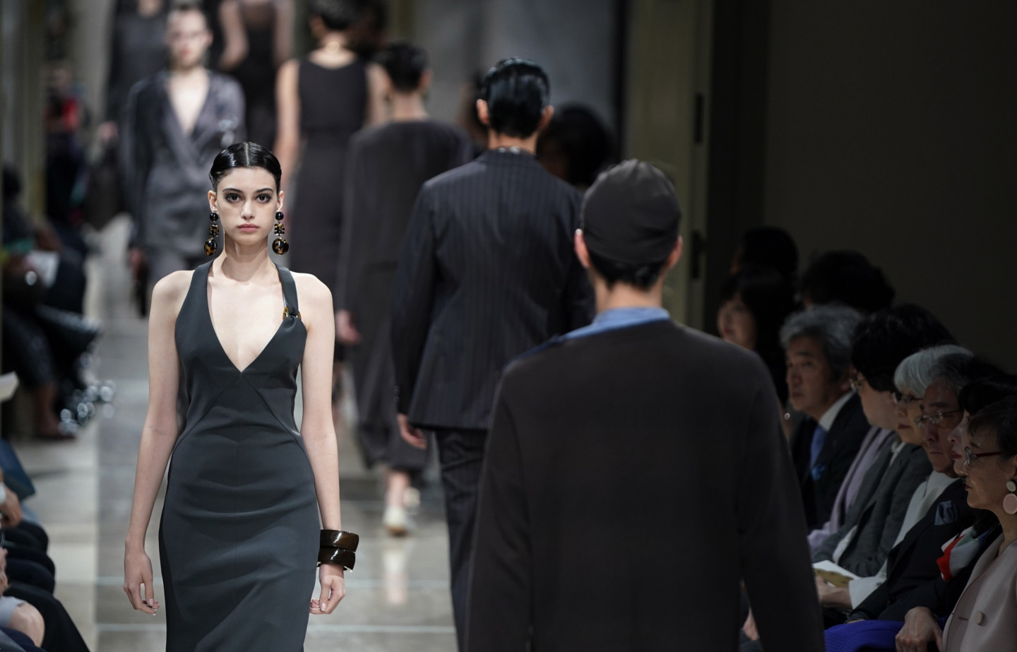 Modeles defilē pa mēli "Giorgio Armani" modes skatē