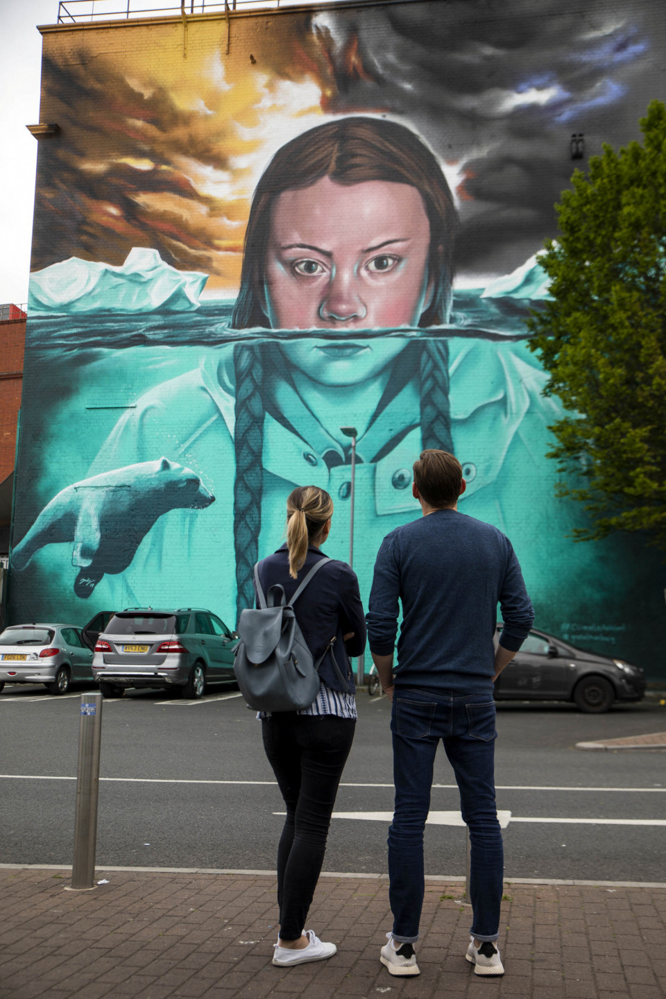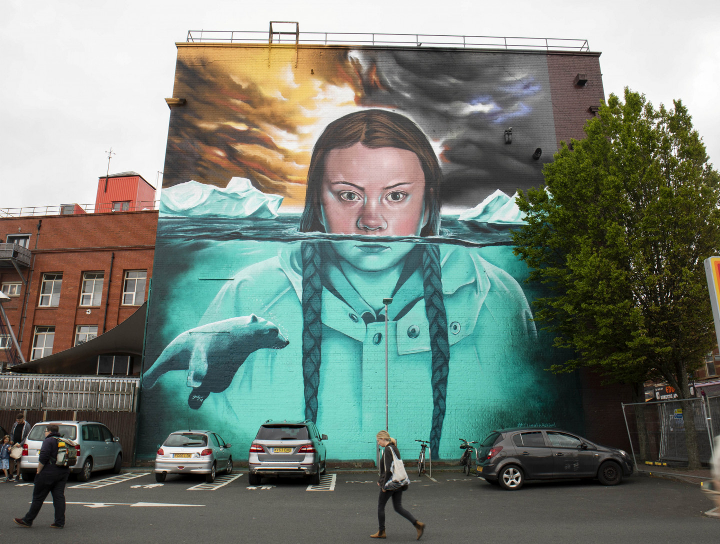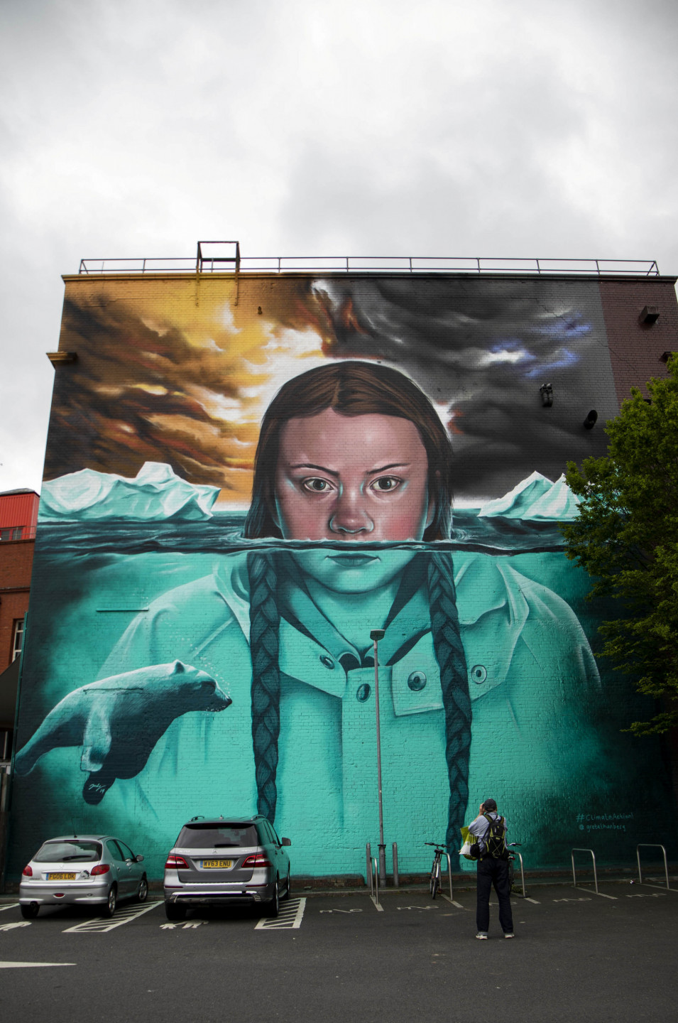 Milzīgs vides aktīvistes Grētas Tūnbergas attēls rotā ēku Bristolē