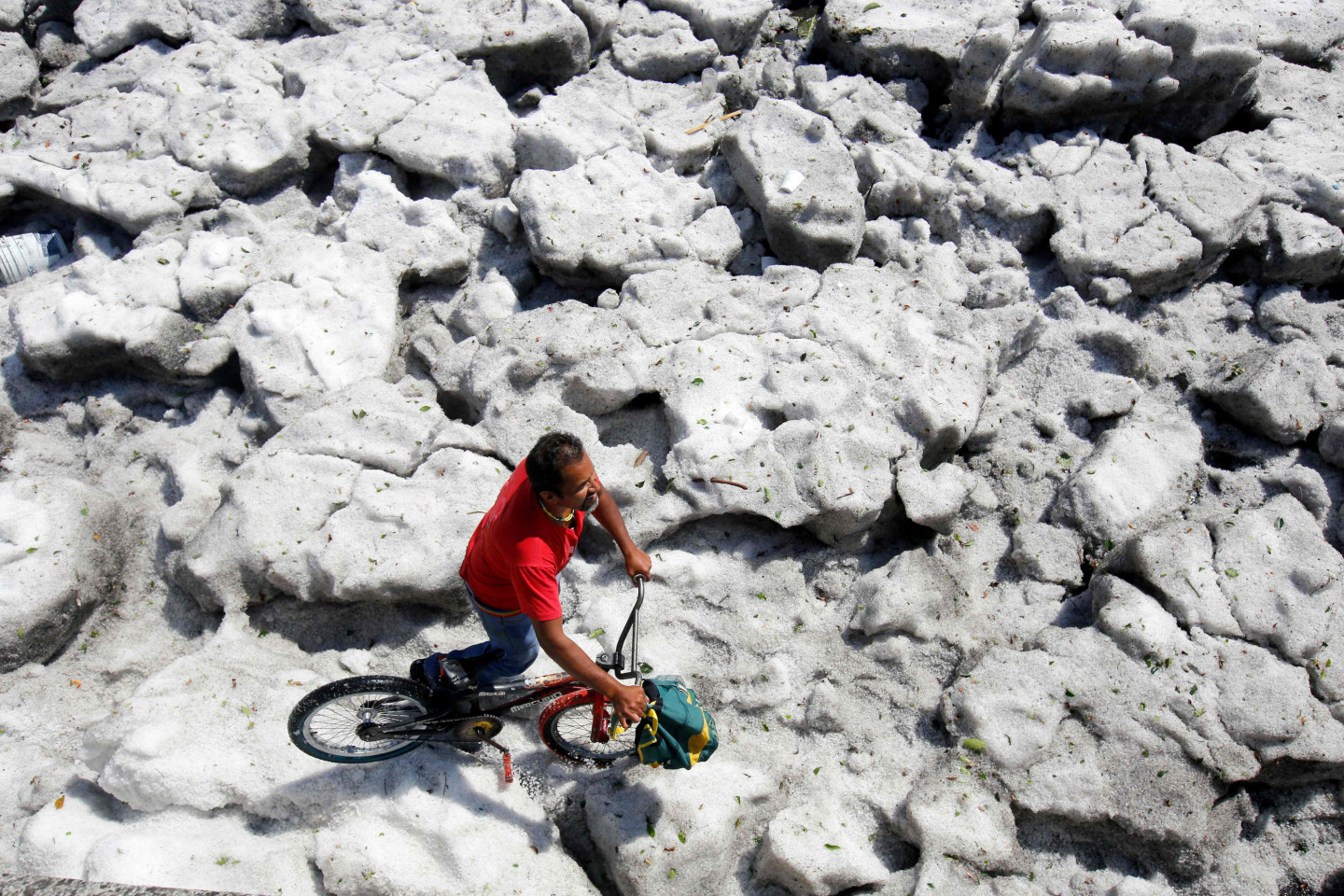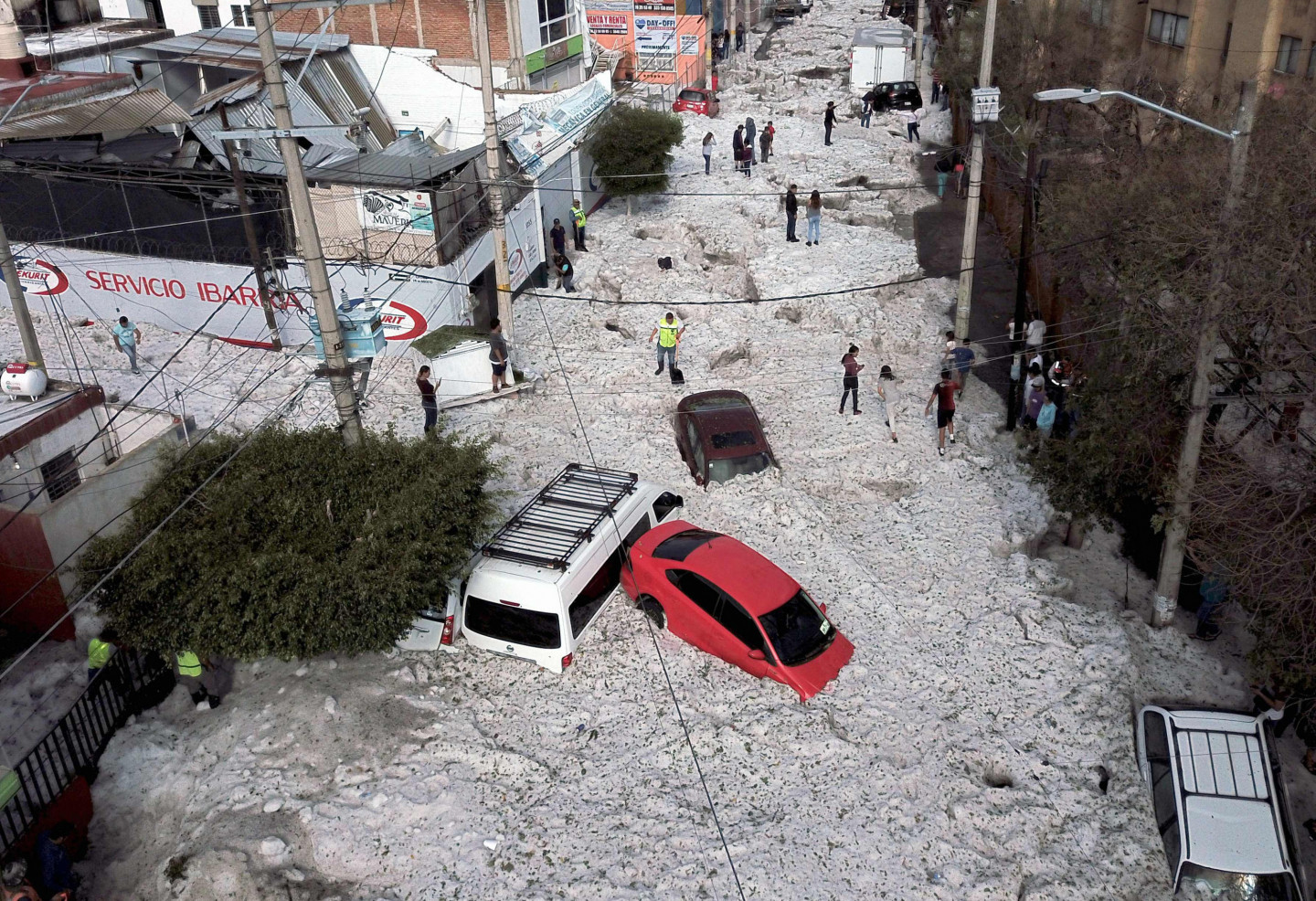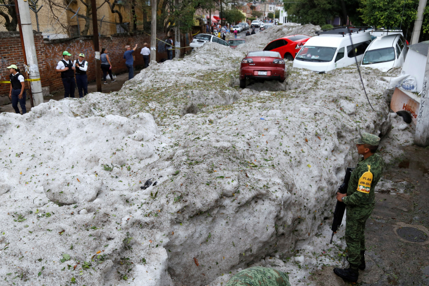 Pēc spēcīgas lietus un krusas vētras Gvadalaharas pilsēta Meksikā noklāta ar ledus kārtu, kas sabojājusi simtiem automašīnu un ēku.