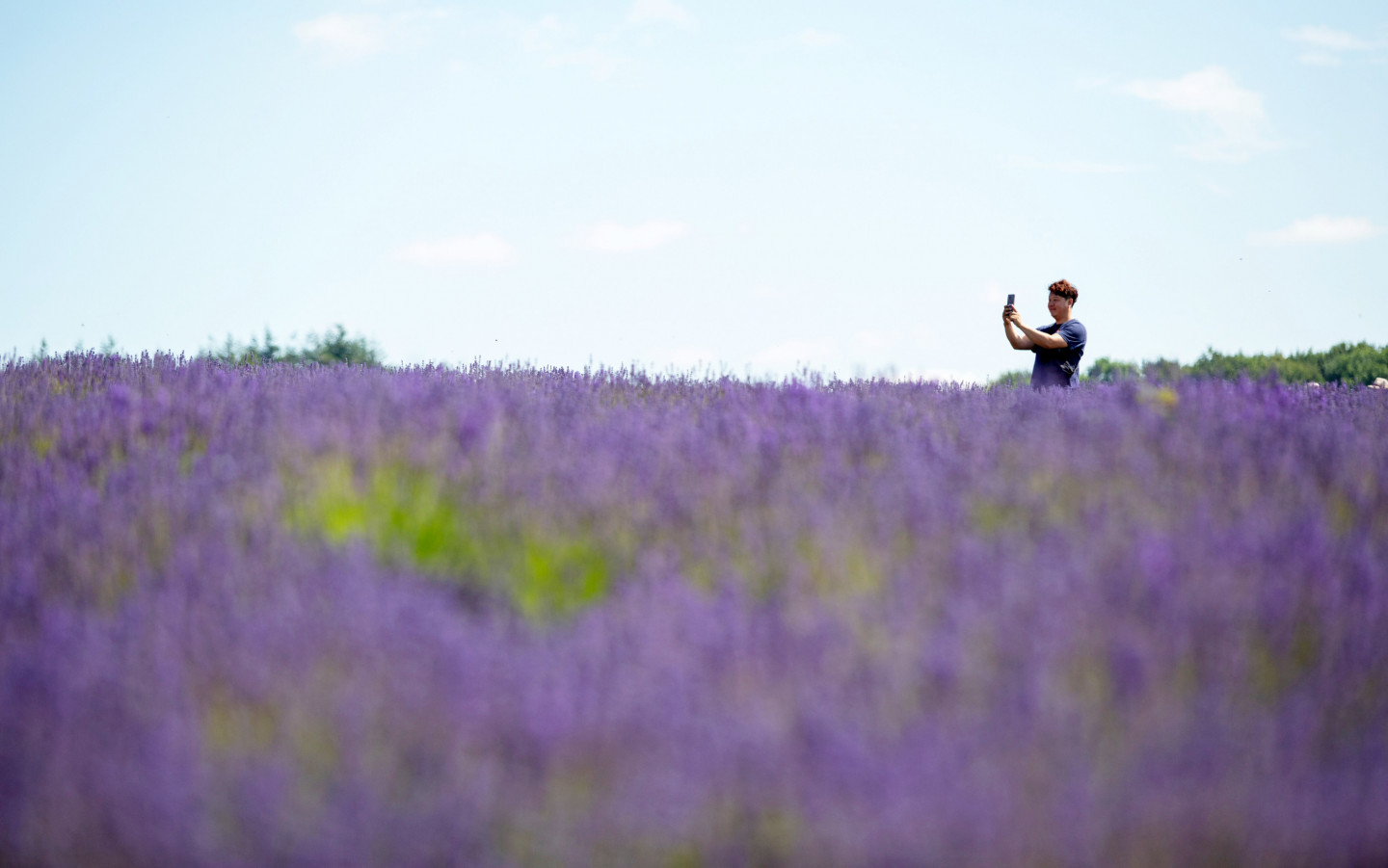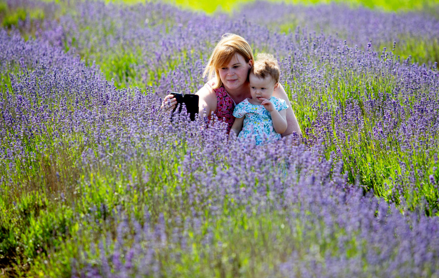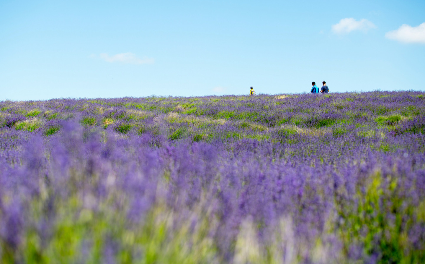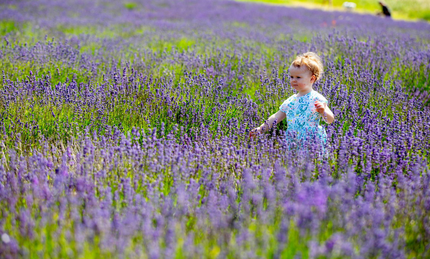 Cilvēki priecājas par lavandas lauku skaistumu Anglijā