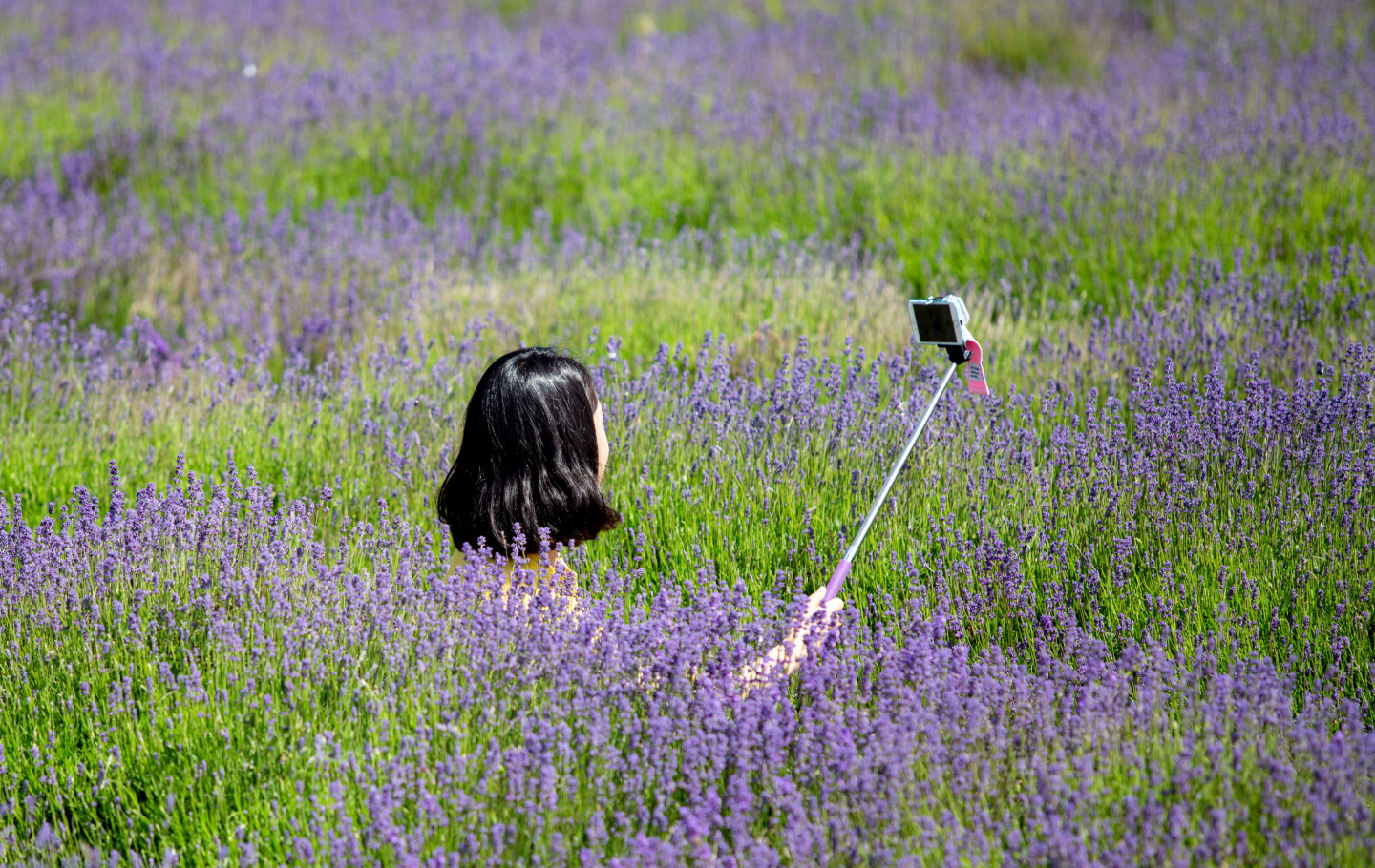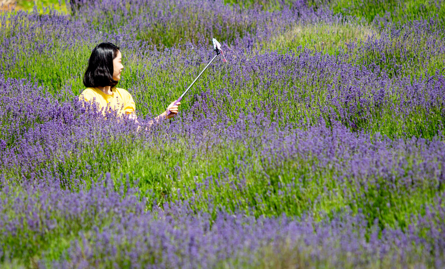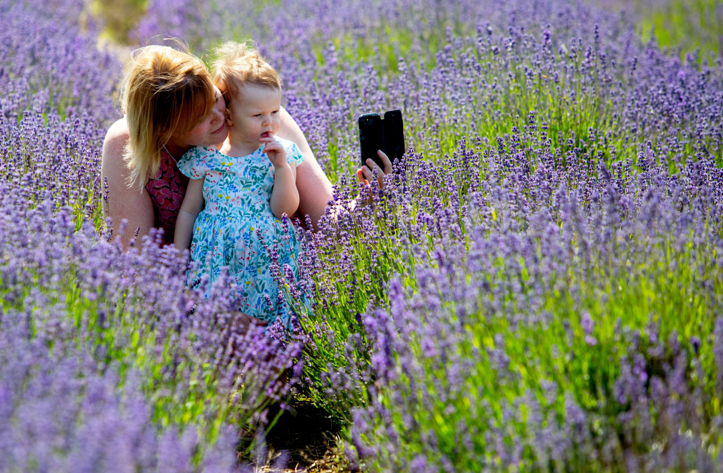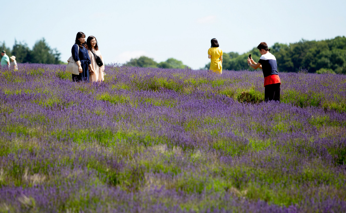 Cilvēki priecājas par lavandas lauku skaistumu Anglijā