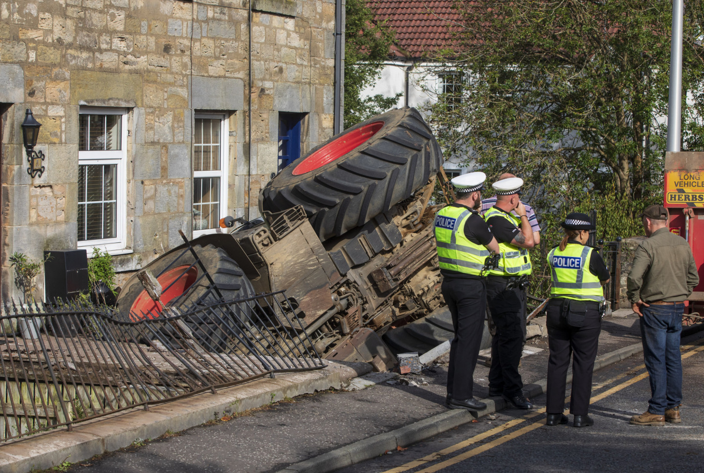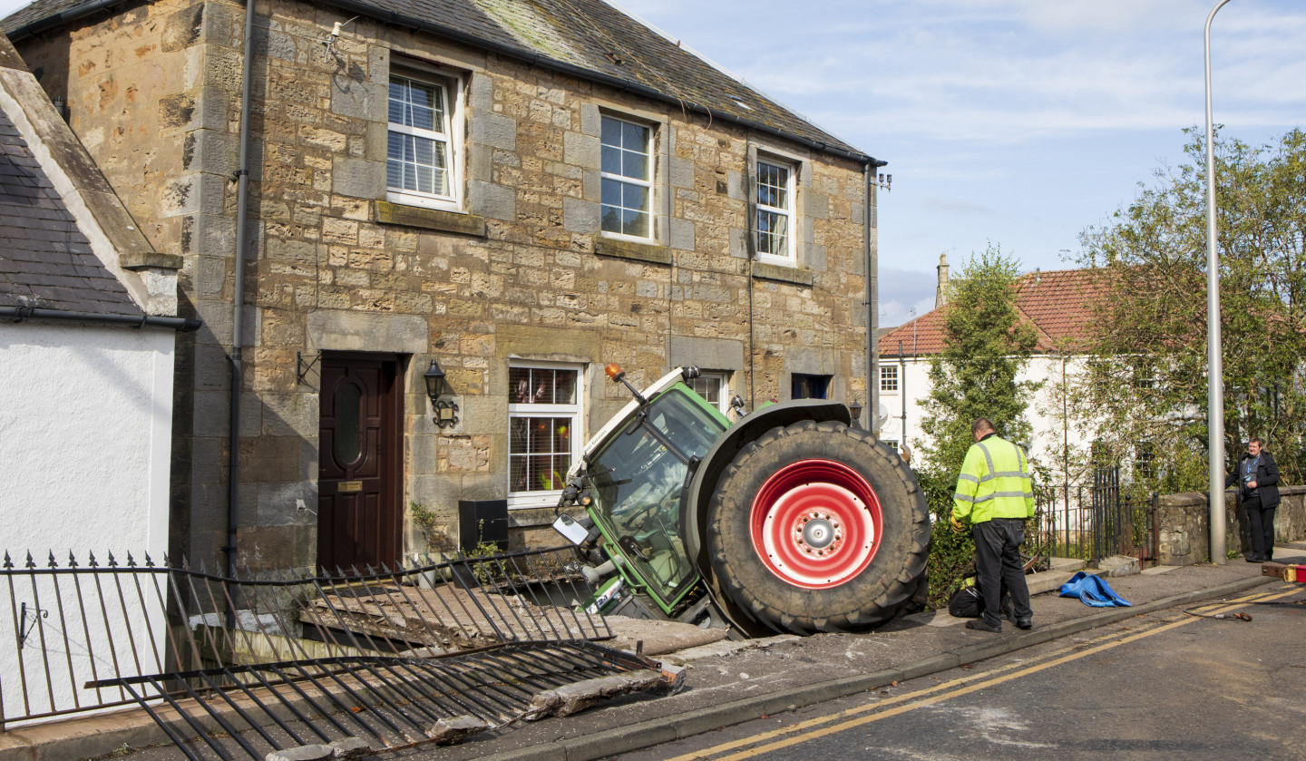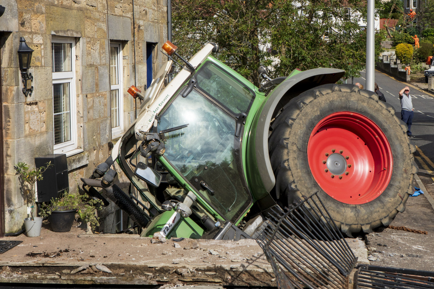 Aculiecinieki Anglijā iemūžinājuši, kā sastrēgumstundas laikā avarējis traktors, kurš ne vien ietriecies kādas ēkas nožogojumā, bet arī pēc sadursmes apgāzies.