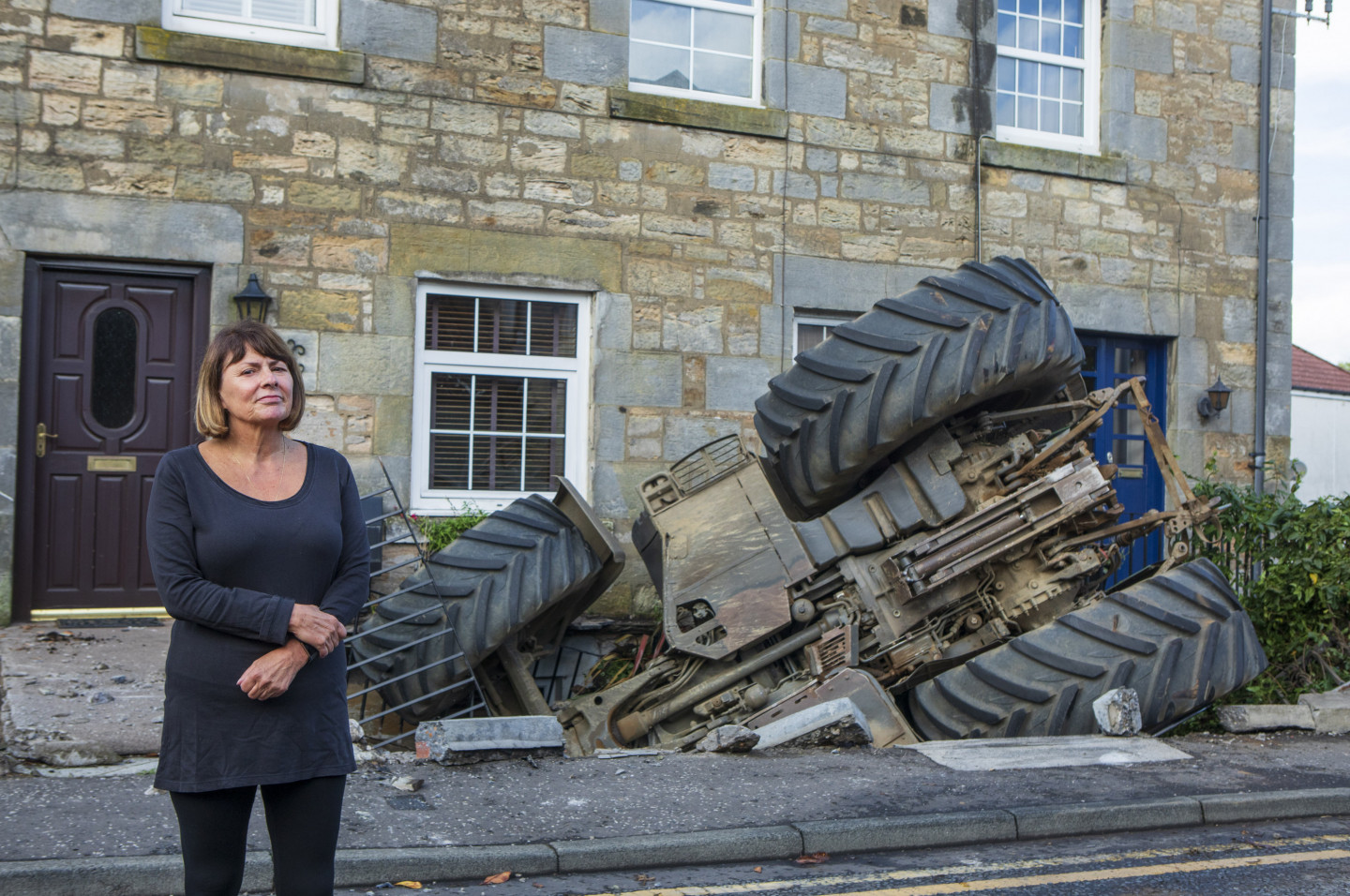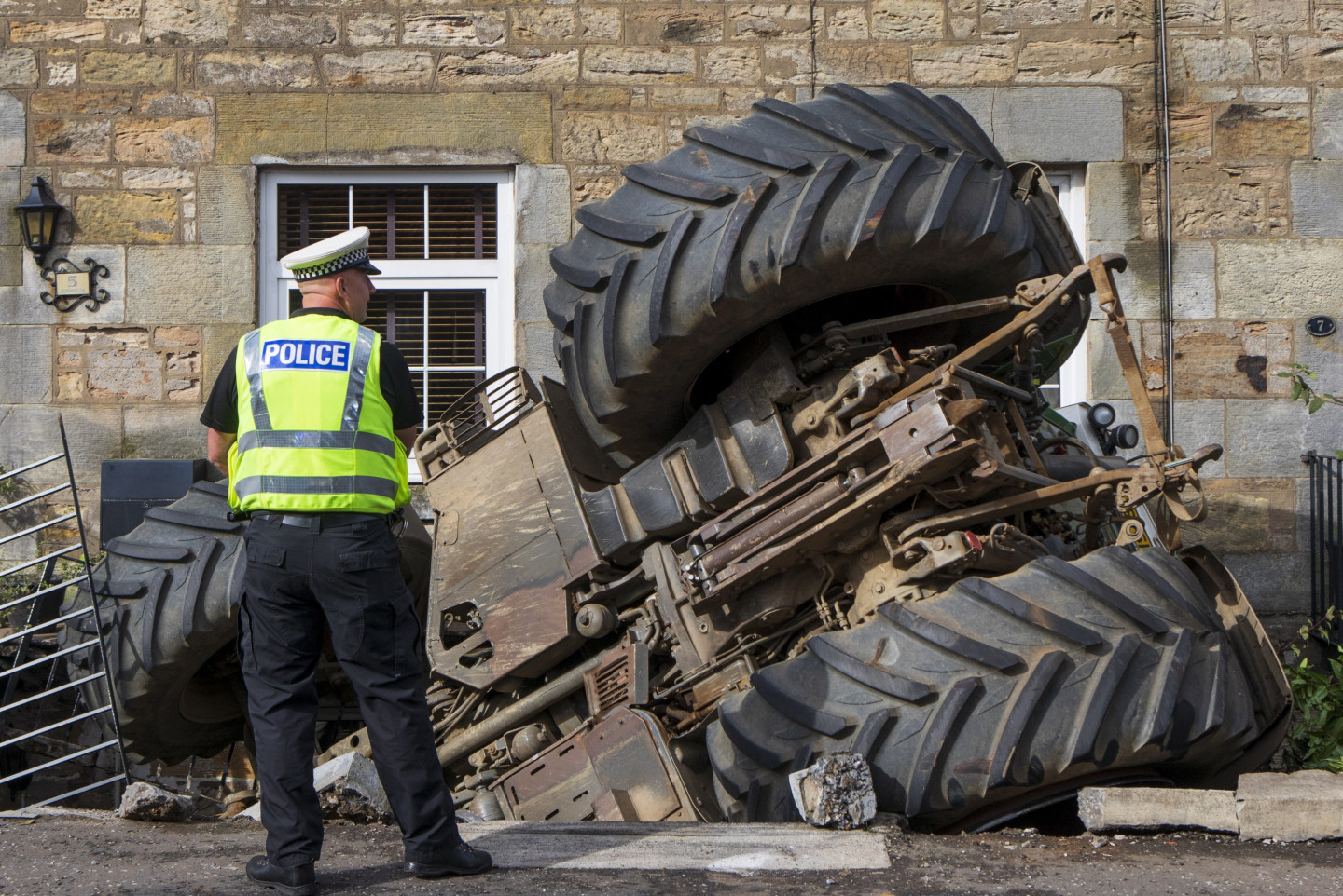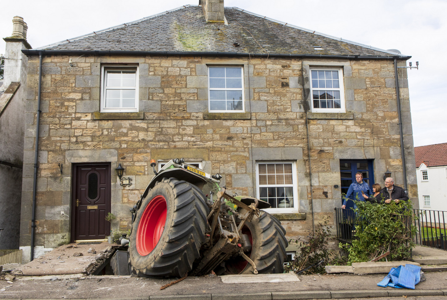 Aculiecinieki Anglijā iemūžinājuši, kā sastrēgumstundas laikā avarējis traktors, kurš ne vien ietriecies kādas ēkas nožogojumā, bet arī pēc sadursmes apgāzies.