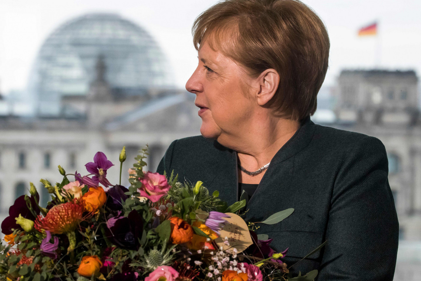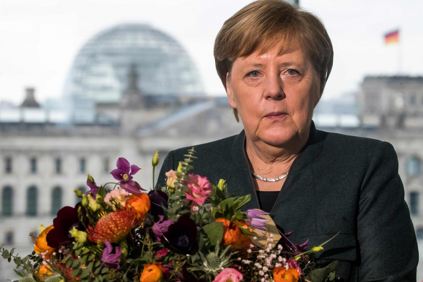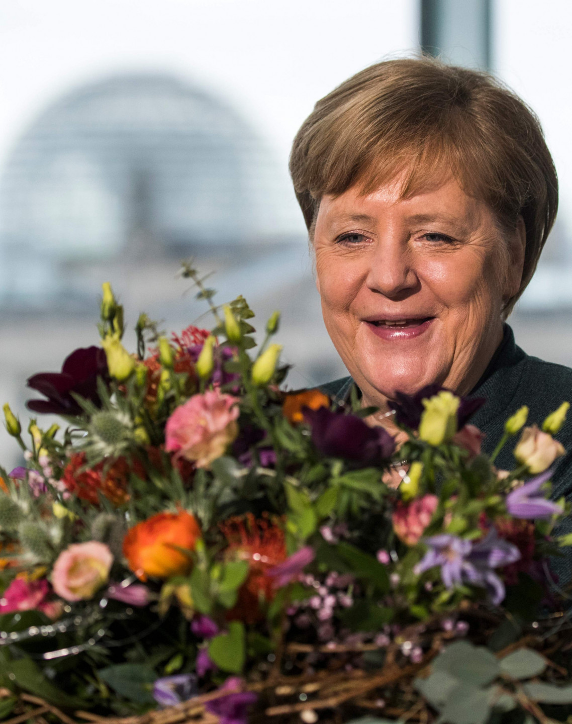 Merkele tikšanās laikā tiek pie liela ziedu pušķa