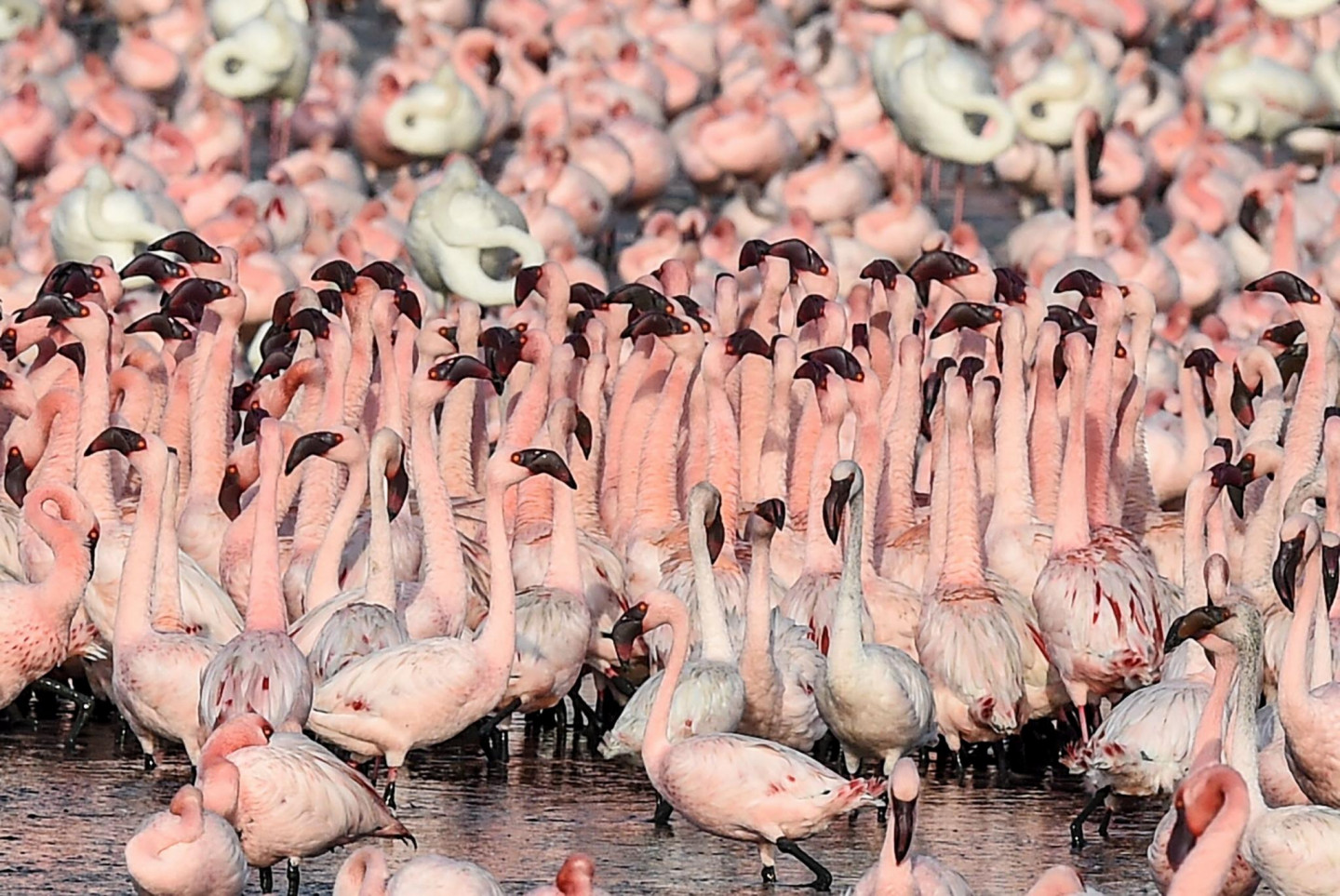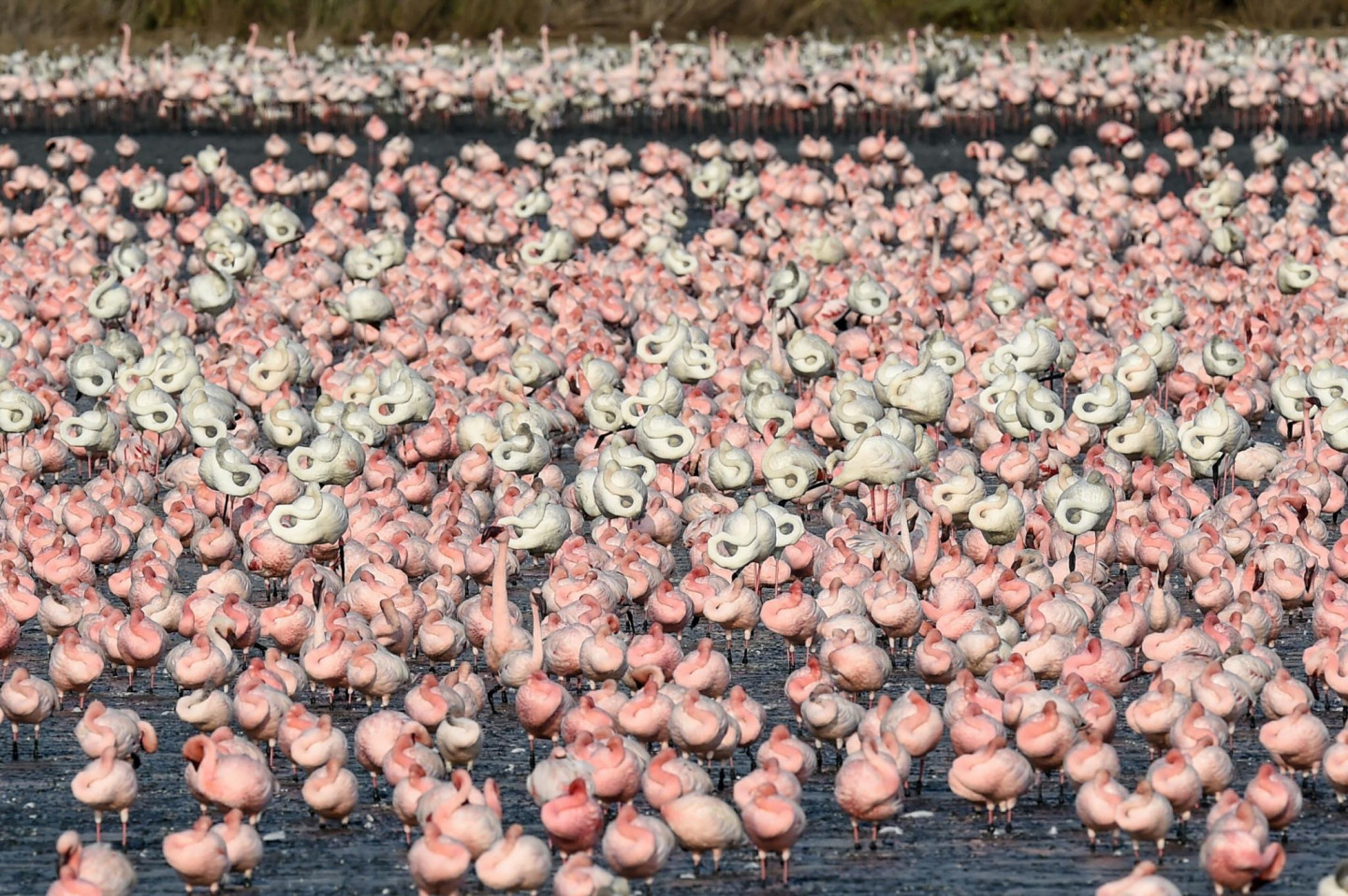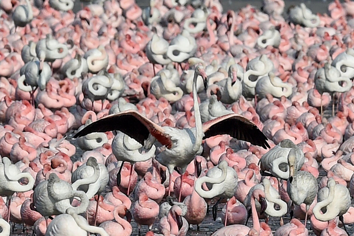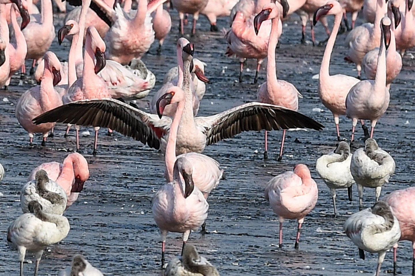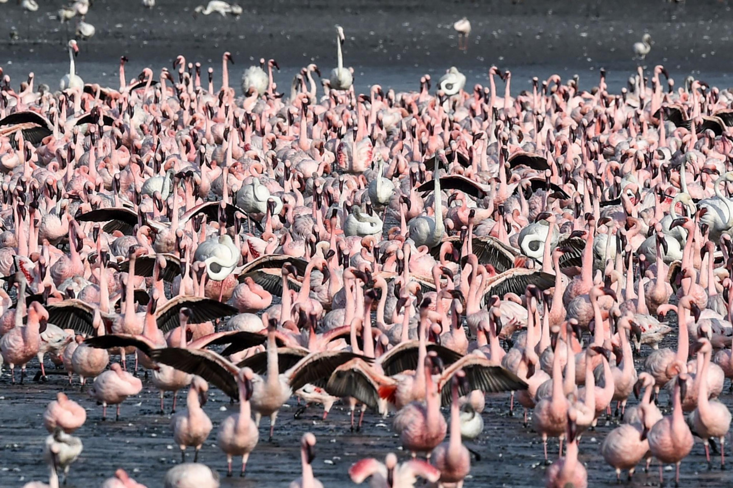 Fotogrāfi iemūžina milzīgu skaitu flamingo Mumbajā